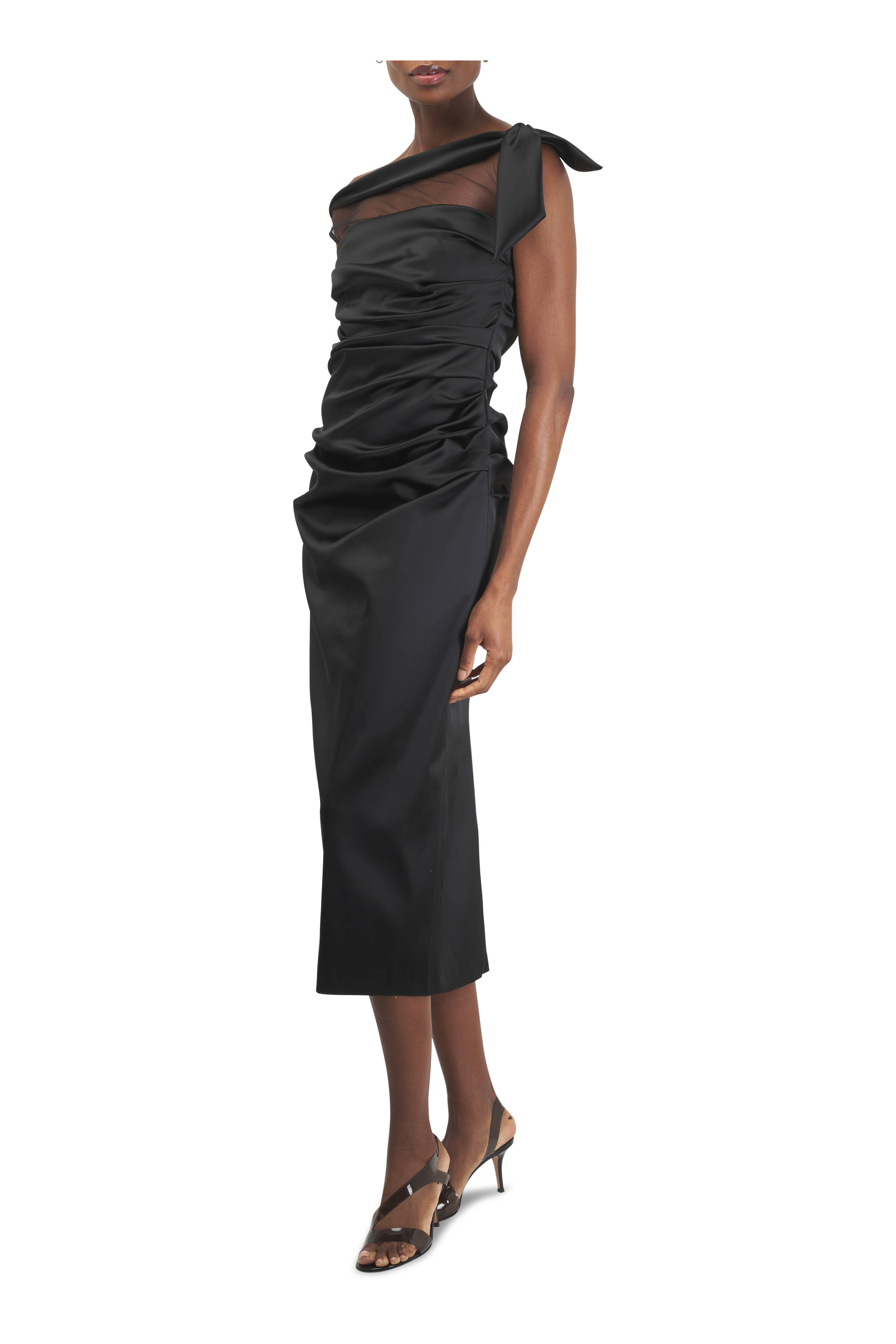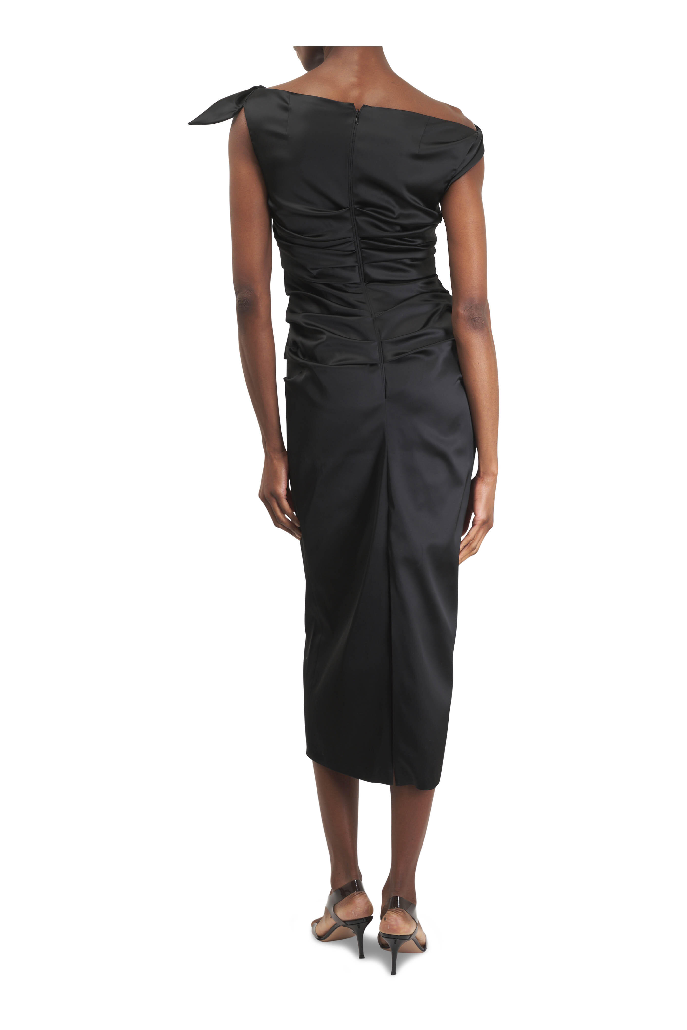 Submarine neckline. Concealed back zip. Bustier look with cut-out detail. Back vent. Made in Germany. 48" shoulder to hem. 75% acetate, 22% polyamide, 3% elastane. Dry clean.