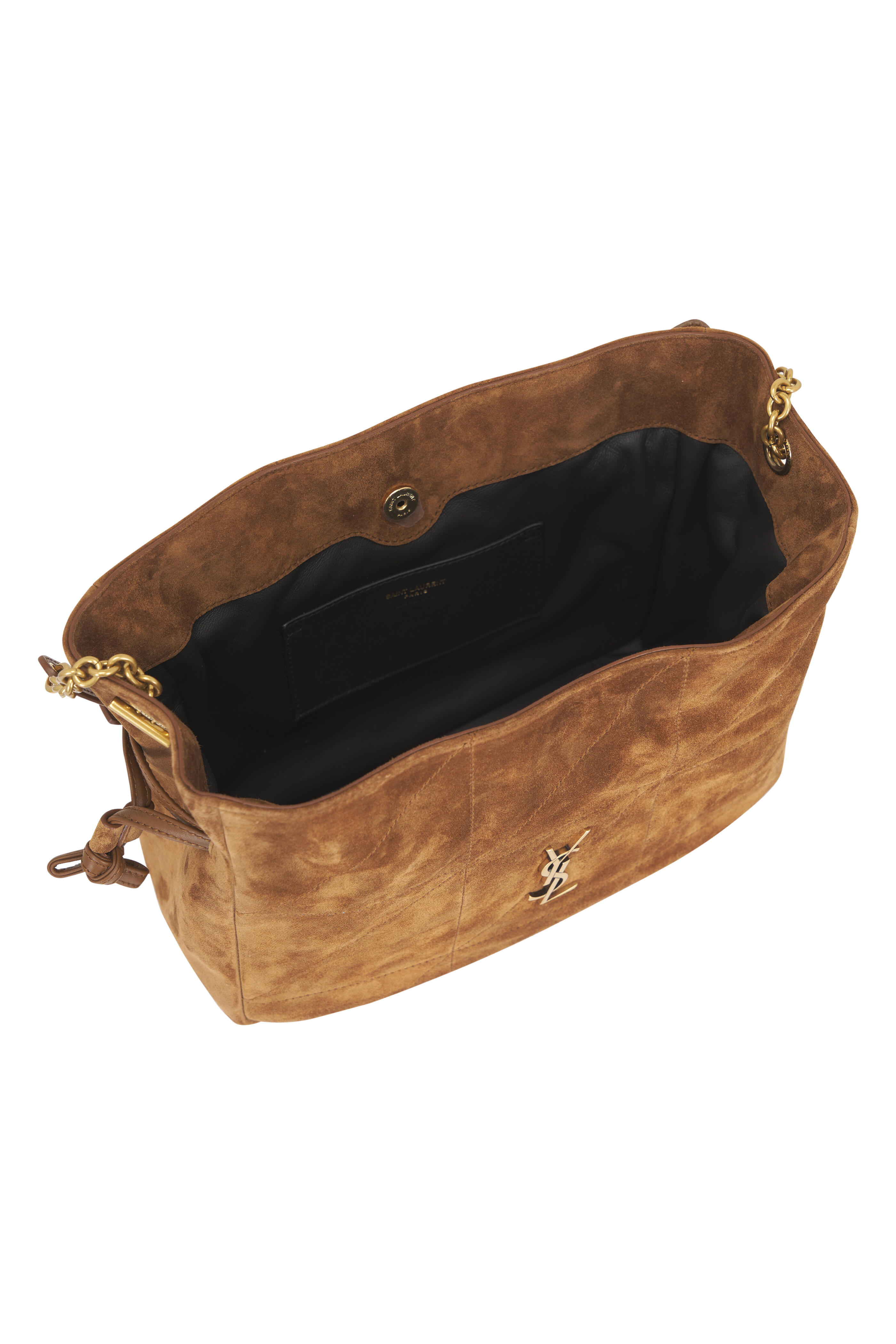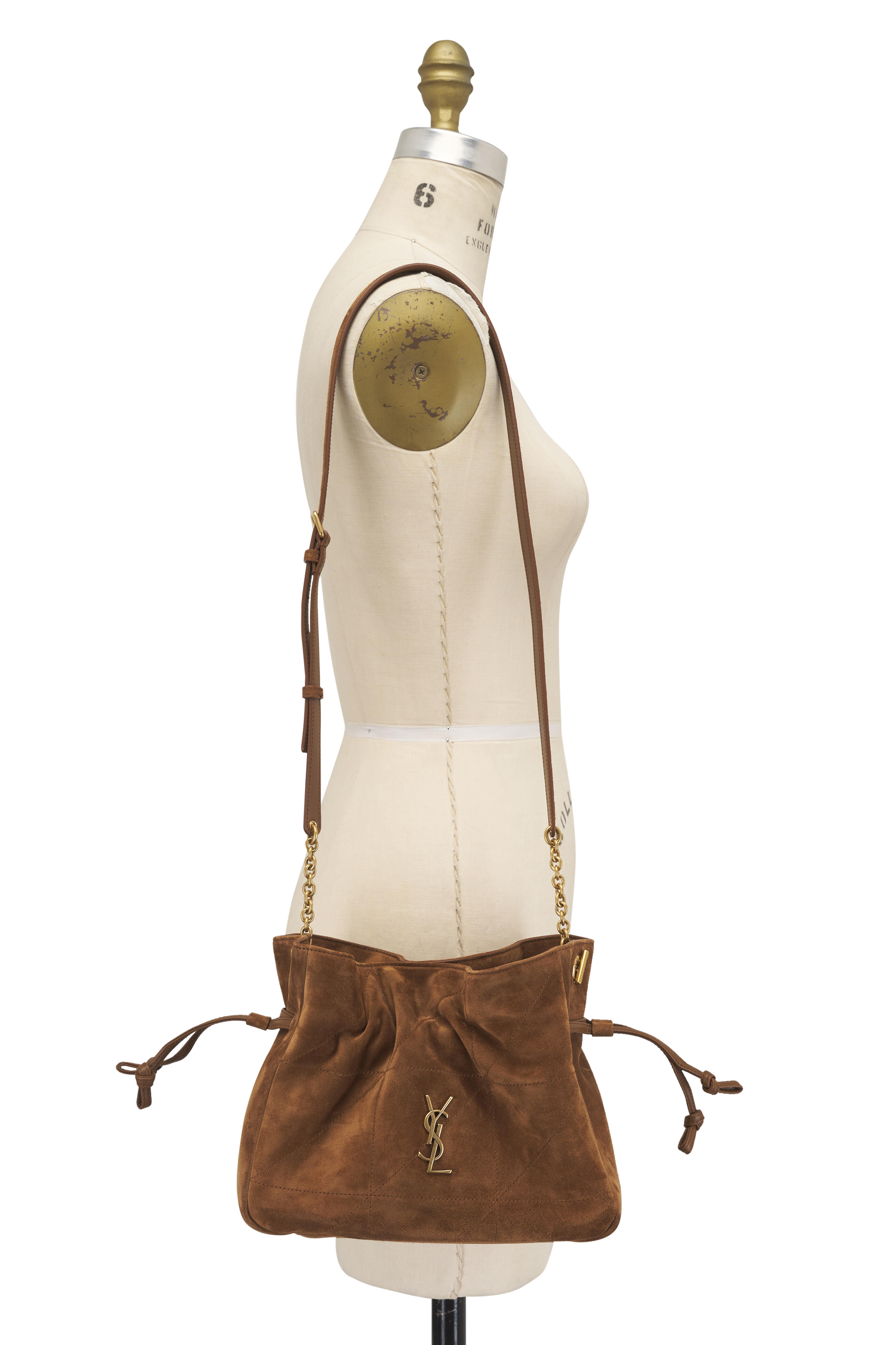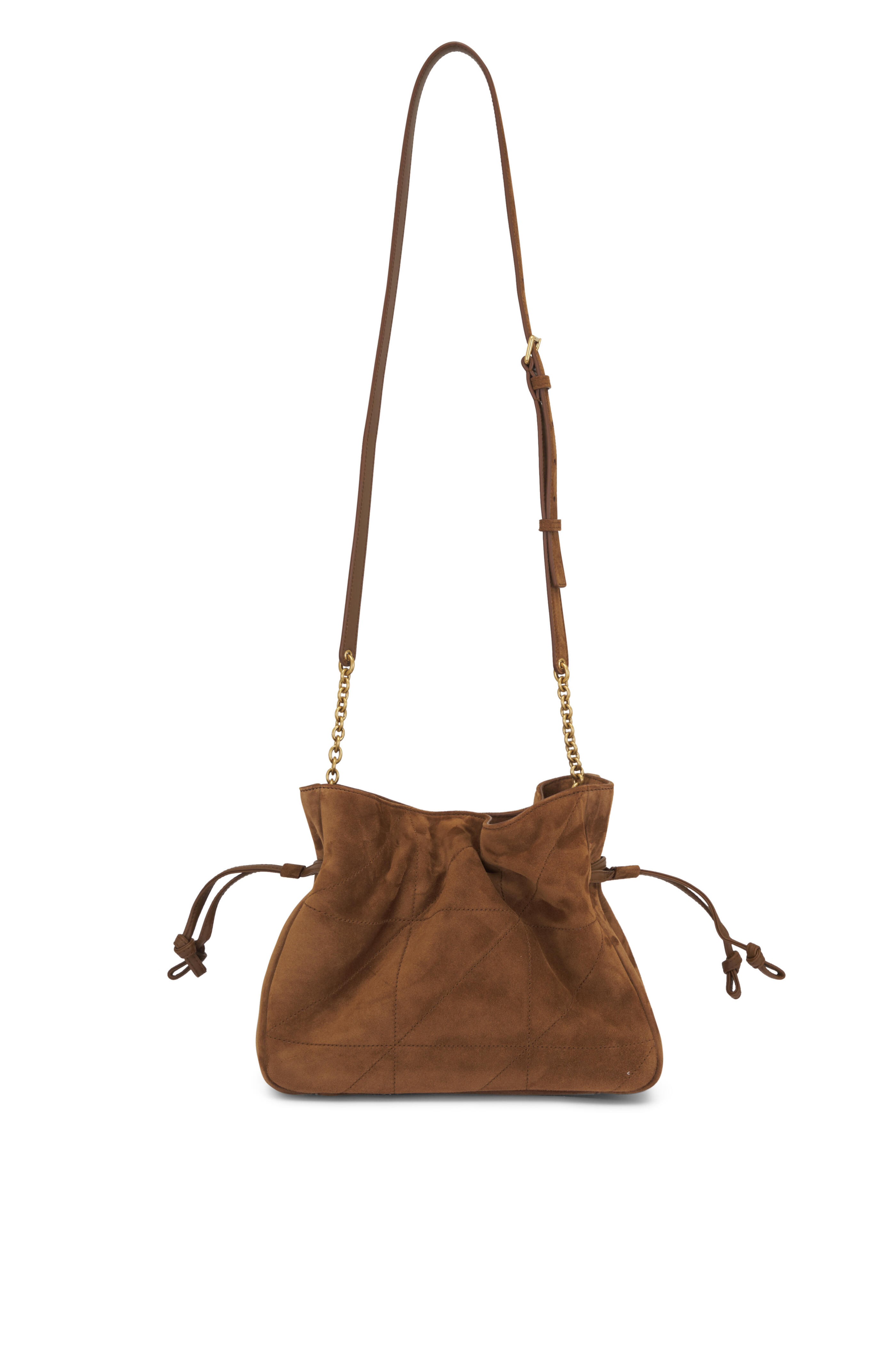 Suede outer. Leather lining. Drawstring and snap-button closure. Adjustable suede and chain shoulder strap. Bronze-tone hardware. Cassandre and carre rive gauche topstitching. Interior wall pocket. Made in Italy. Approx.: 5.7" x 6.1" x 3.1".