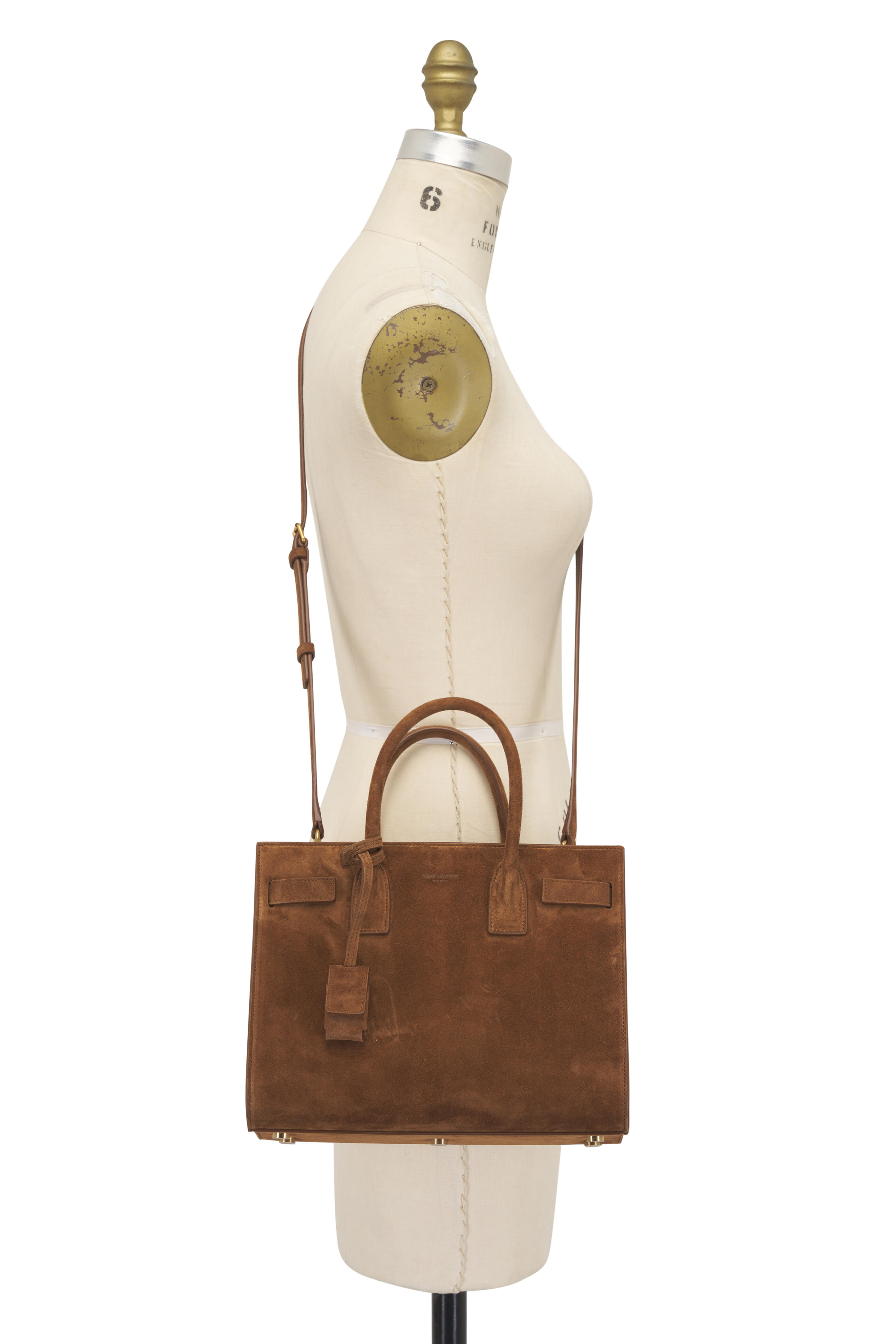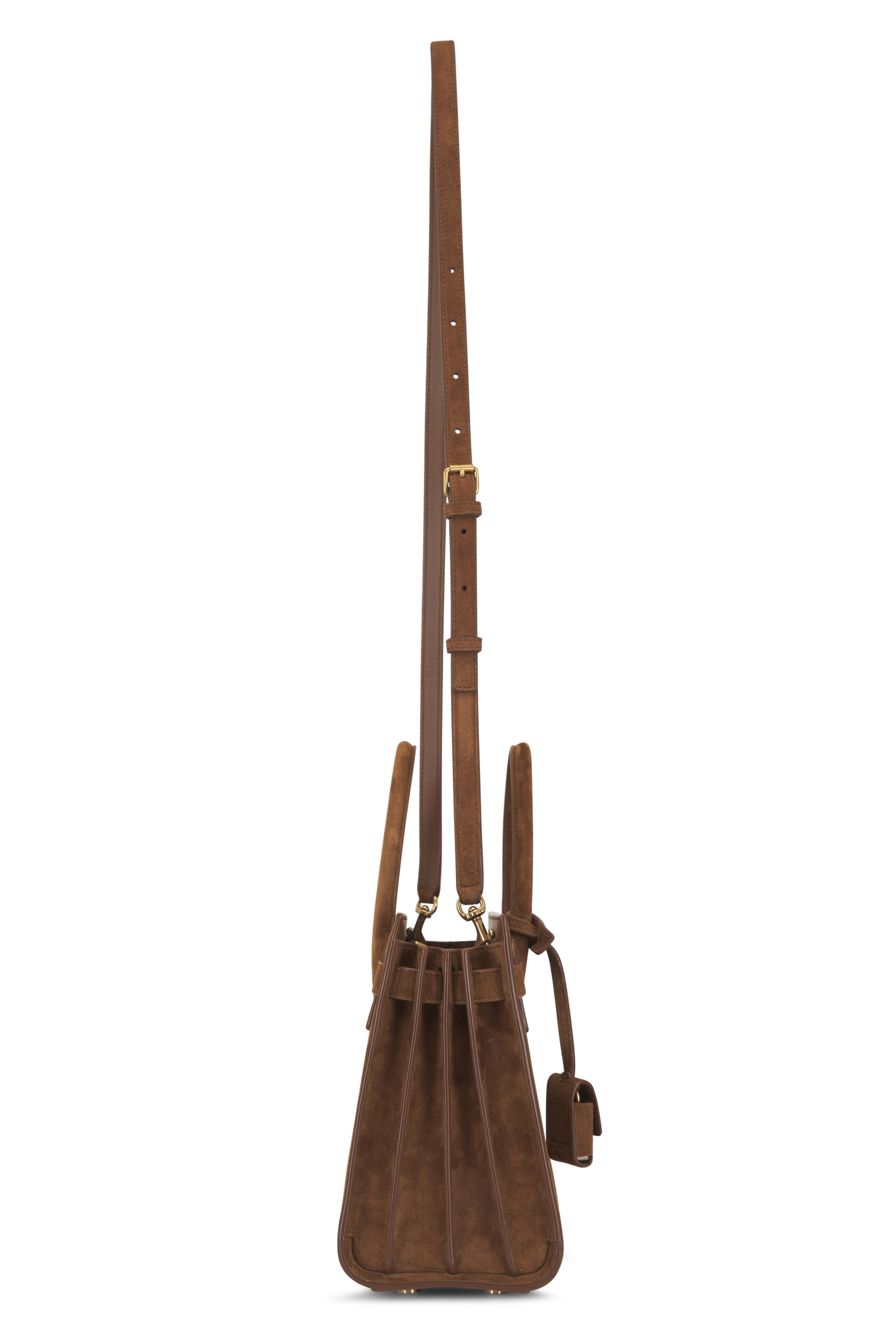 Suede outer. Leather lining. Open top. Accordion sides. Dual top handles. Adjustable, detachable shoulder strap. Bronze-toned hardware. Includes detachable padlock in leather case. Three main compartments; one zipper. Five metal feet. Made in Italy. Measurements: 10.2" x 8.1" x 4.9".