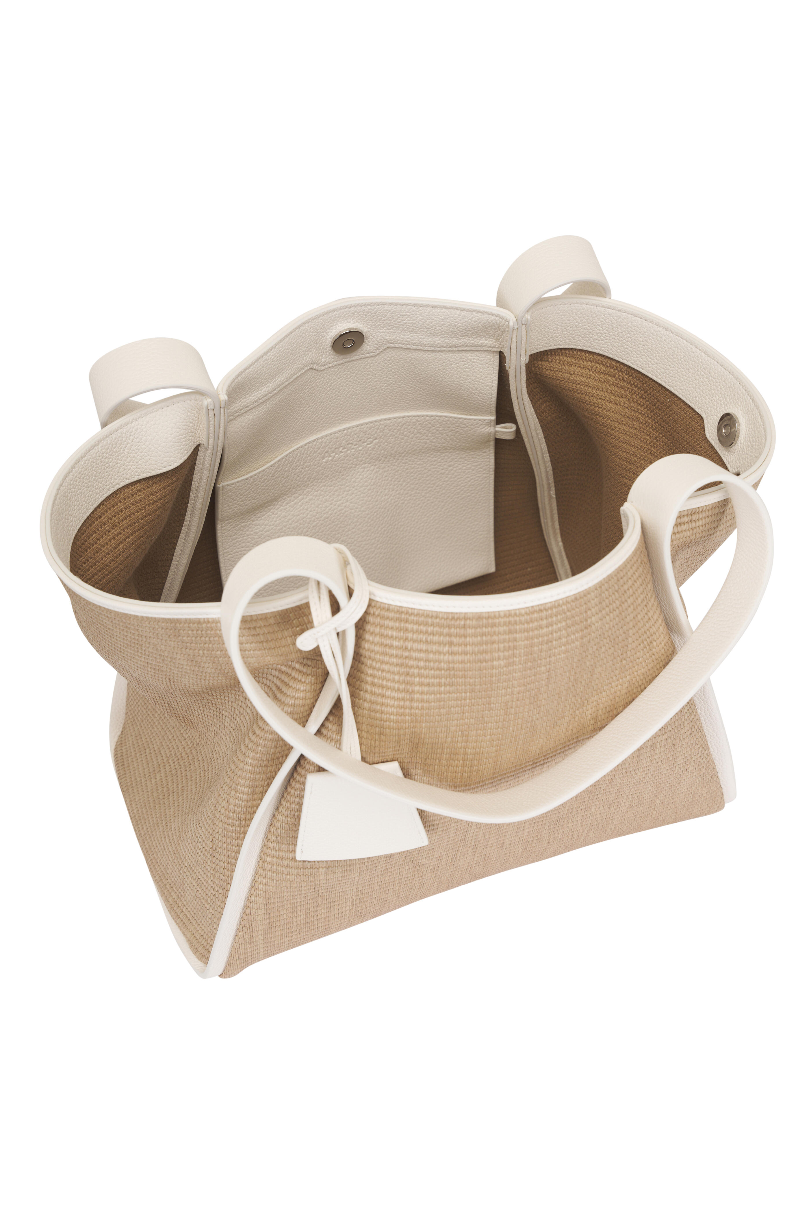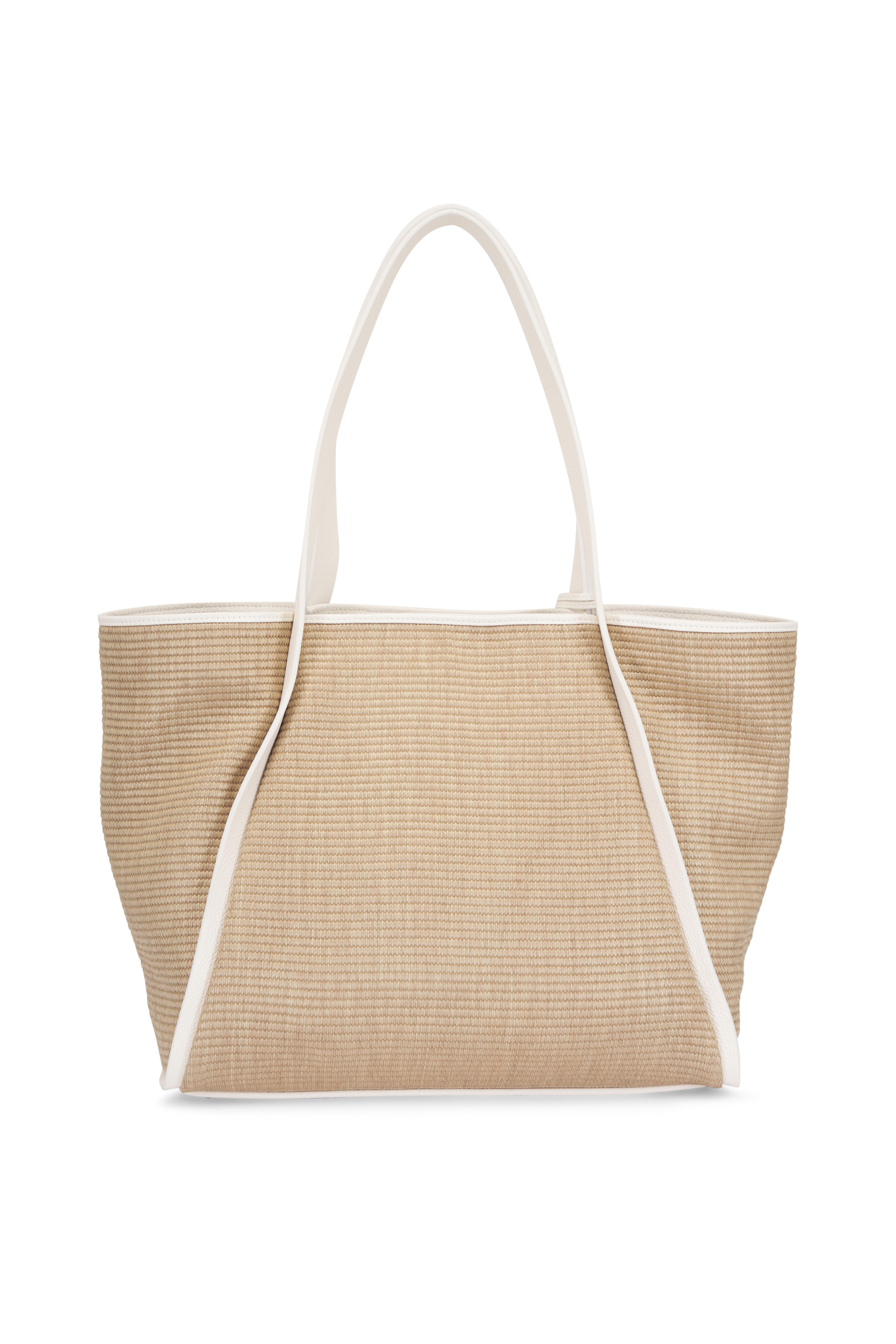 Cotton and calfskin leather details. Dual shoulder straps. Top magnetic snap closure. Interior slip pocket. Silver toned hardware. Foldable sculptural trapezoid shape design with magnetic closures. Imported. Dual top handle, 7.75" drop. 17"W x 11.25"H x 8"D.