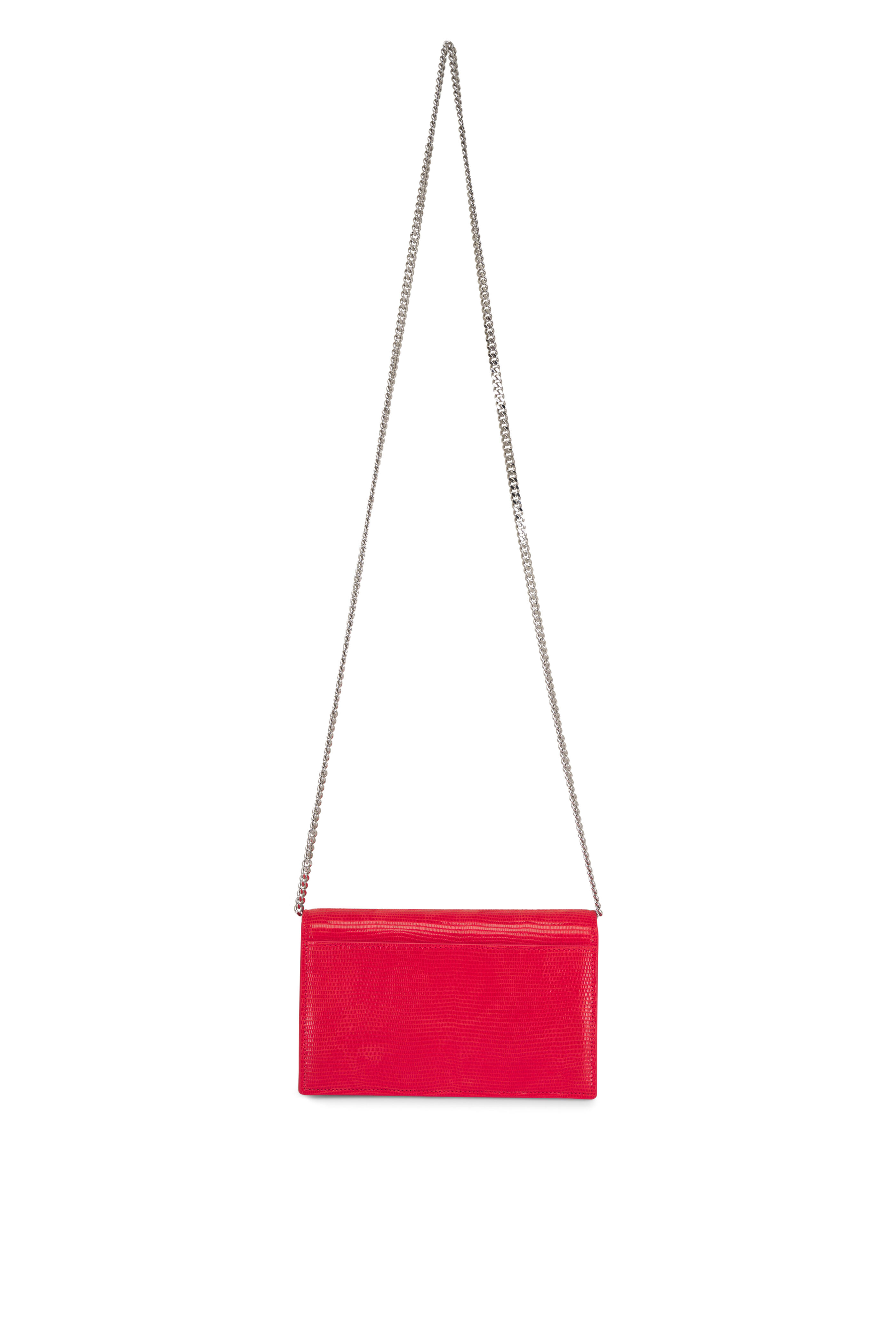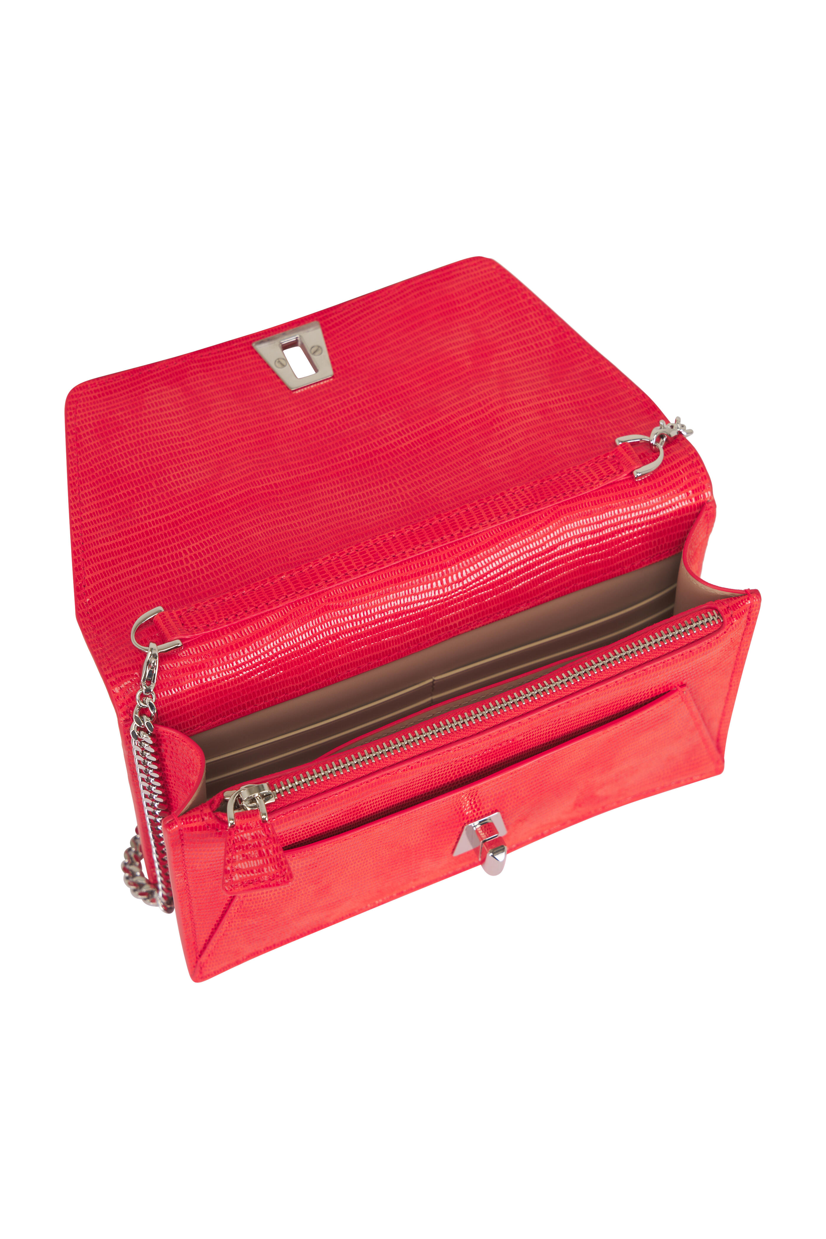Suede with shiny lizard finish. Detachable shoulder strap. Flap front with turn-lock closure. Exterior back slip pocket. Interior zip pocket, one open compartment, two slot pockets; six card slots. Gunmetal-toned hardware. Leather lining. Made in Italy.