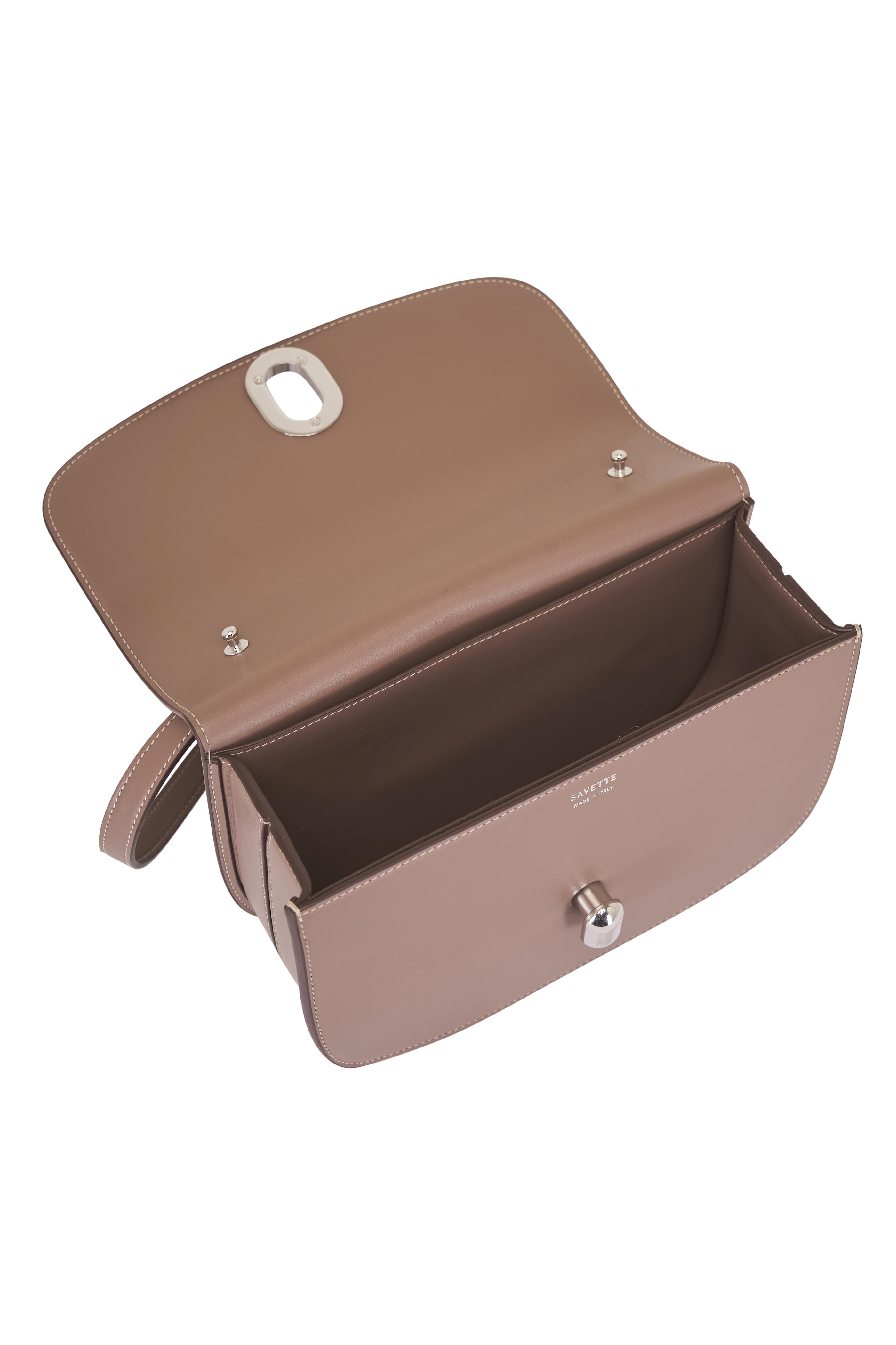 Leather. Adjustable shoulder strap. Flap with turn-lock closure. Single compartment. Two flat pockets. Leather lining. Made in Italy. Length: 9". Width: 6.5". Depth: 3:.