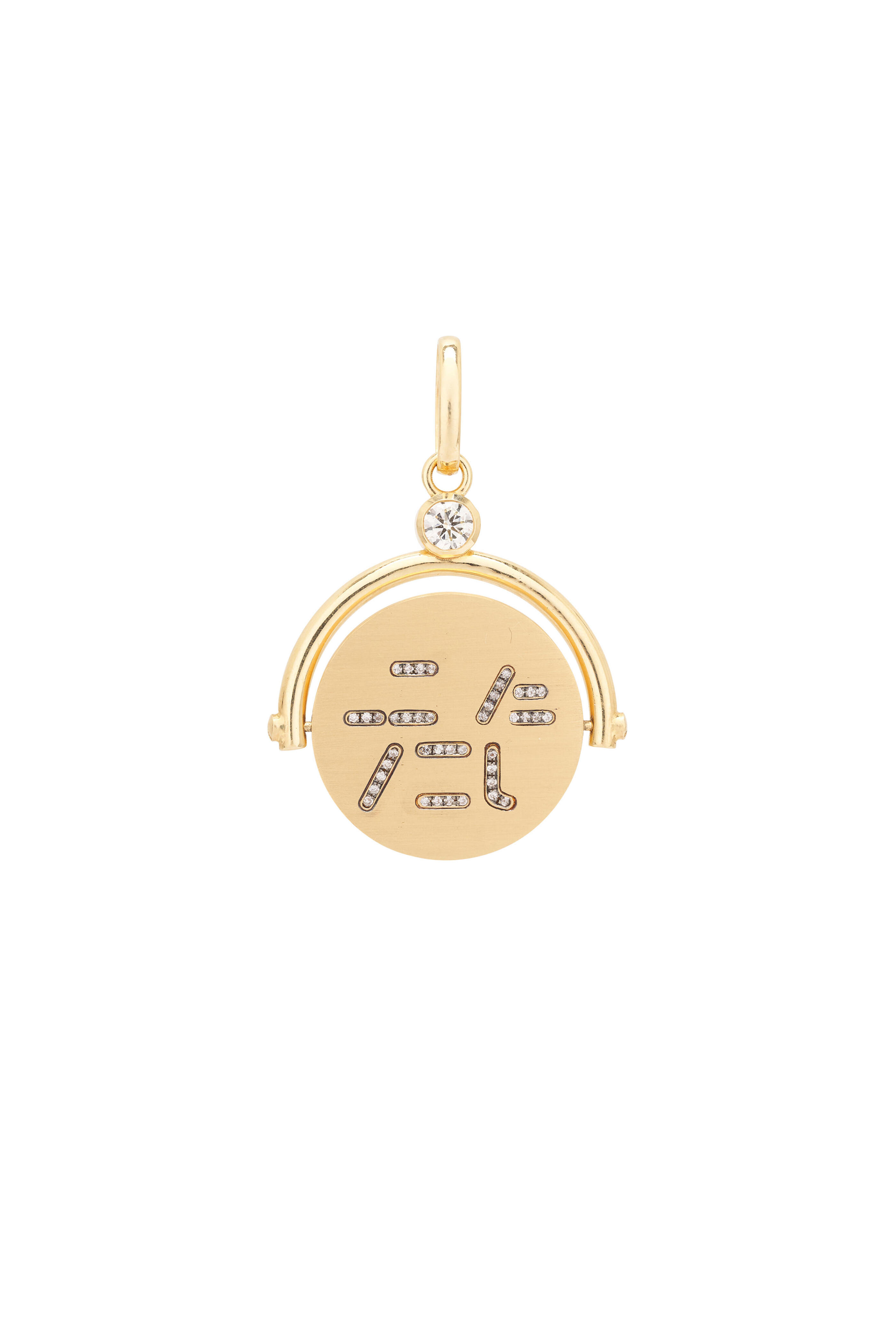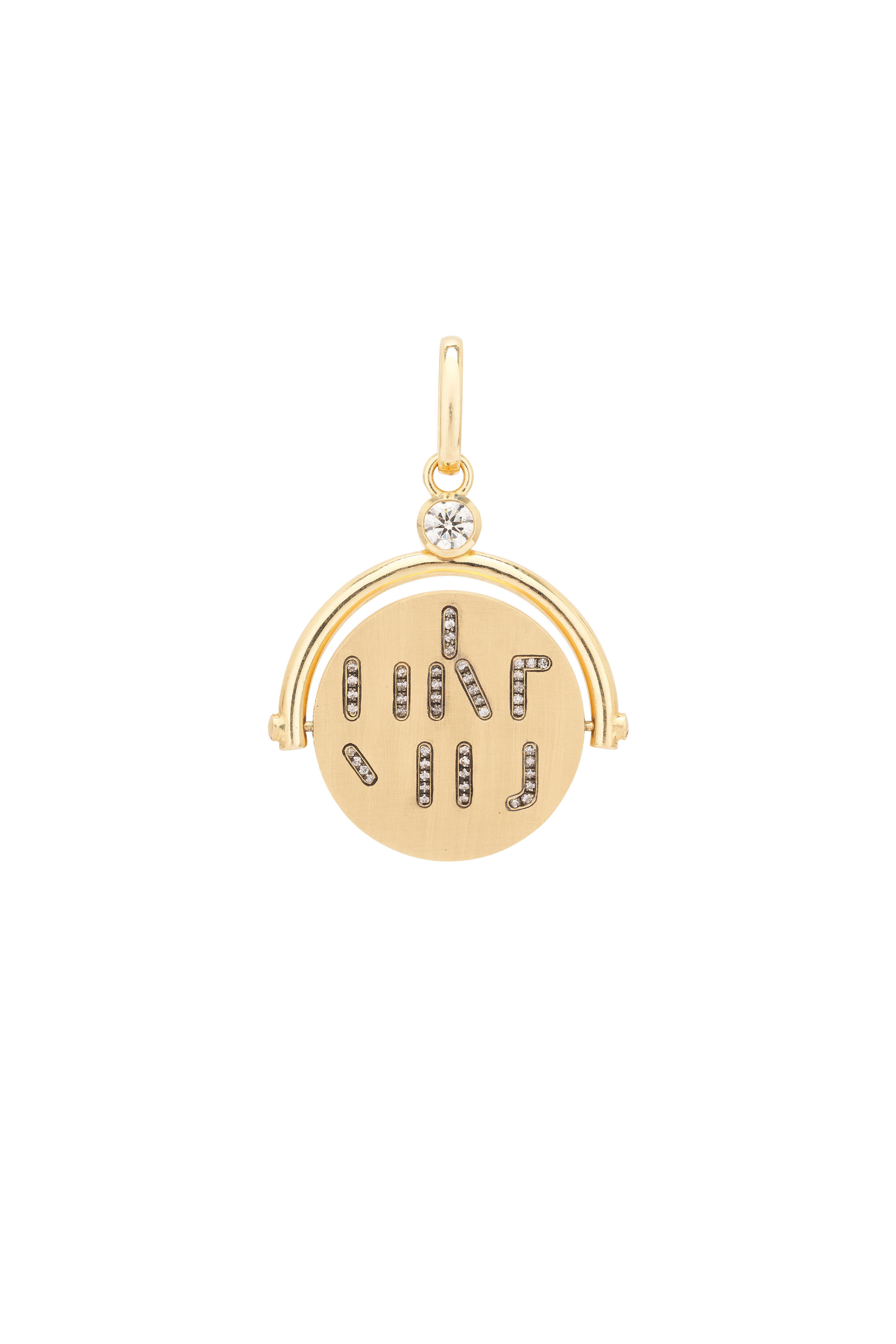 18k yellow gold. Diamond. Enamel engraved message. Prong setting. Round. Spinner style. Gold bail. Based in Los Angeles.