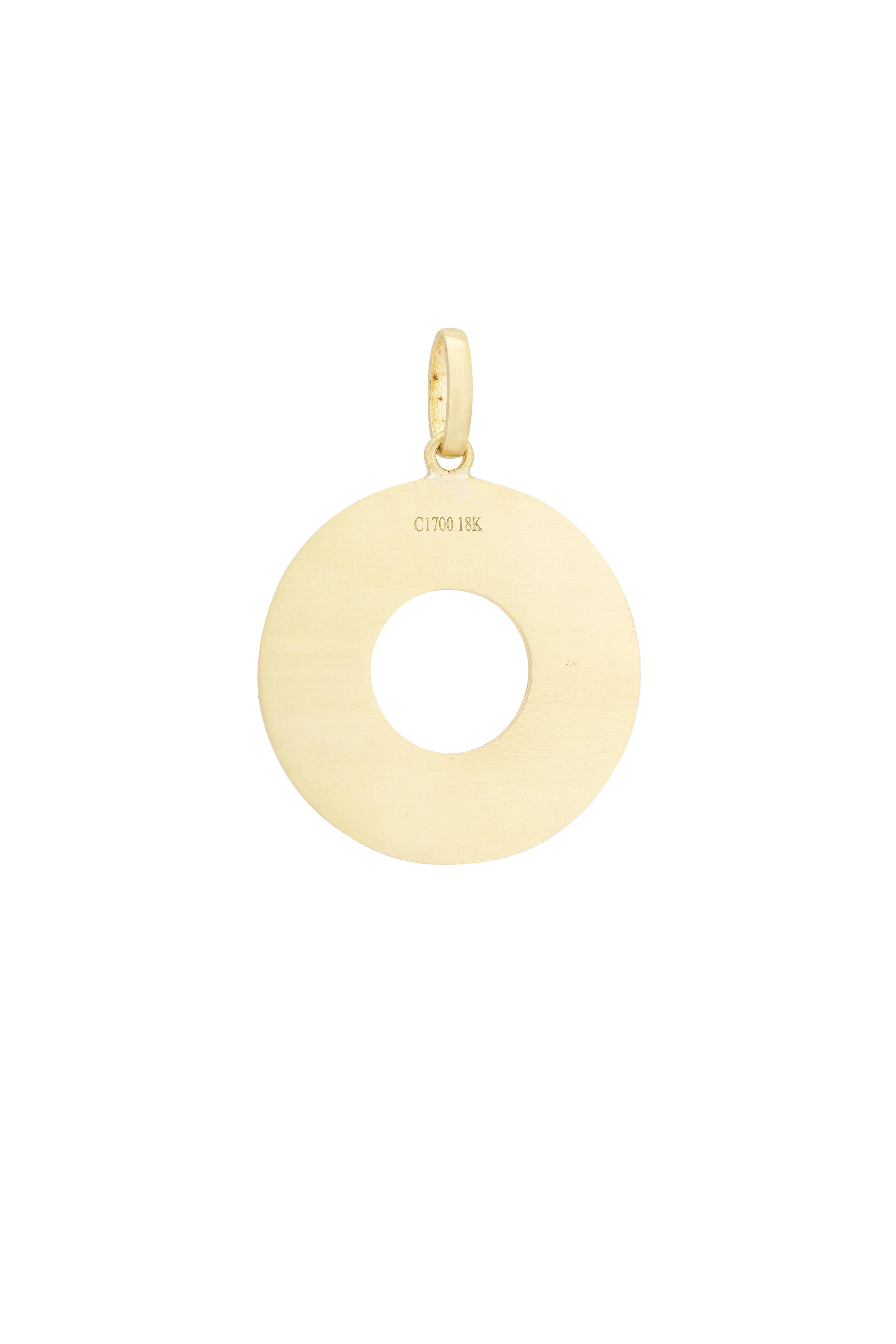 18k yellow gold. Diamond 0.15 total carat weight. Royal blue enamel. Enamel engraved message. Diamond heart. Diamond horseshoe. Prong setting. Round. Gold bail. Based in Los Angeles.