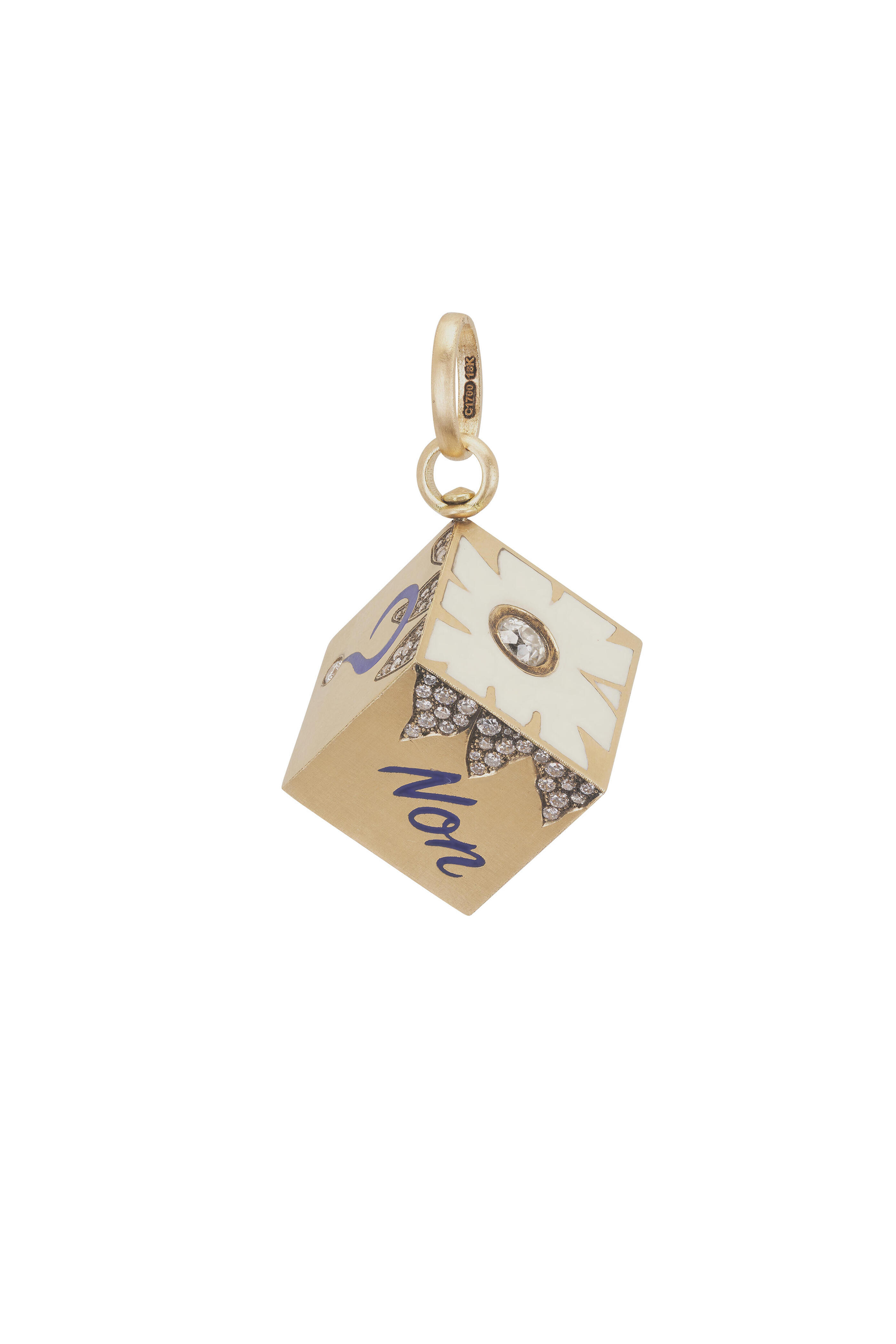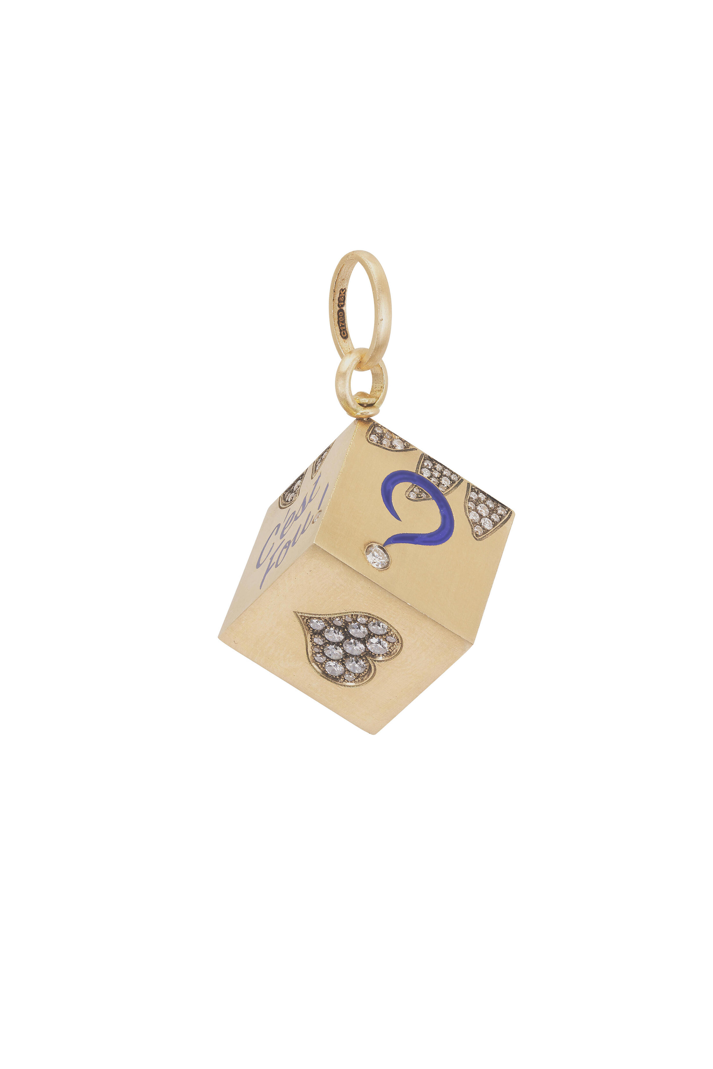 18k yellow gold. Diamond 1.75 total carat weight. Royal blue enamel. White enamel. Dice design. Prong setting. Gold bail. Based in Lose Angels. Weight: 30.8 grams.