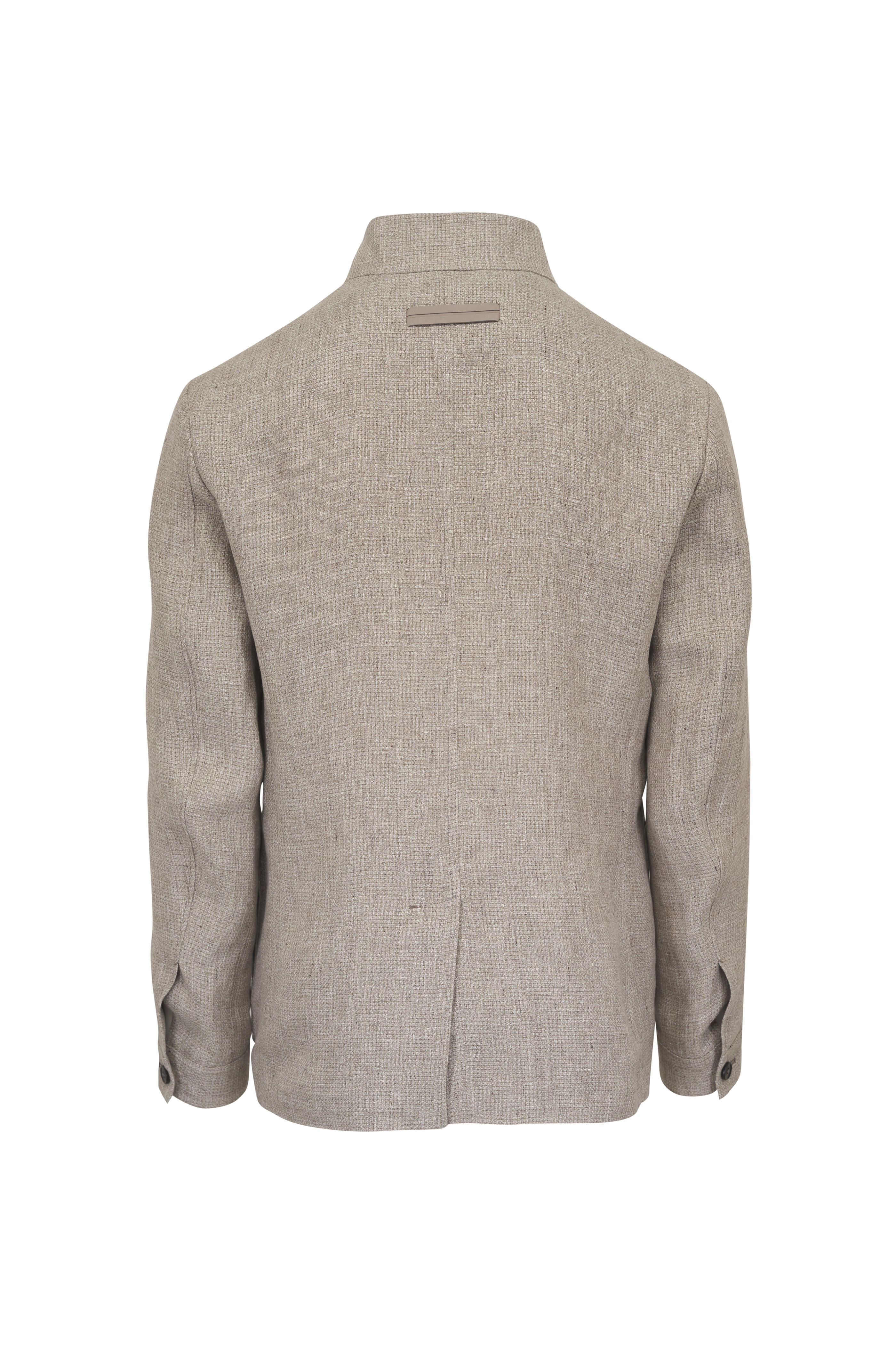 Specialist clean. Stand collar. Front button placket. Lower patch pocket; leather pocket insert. Back vent. Made in Italy. 100% cashmere; leather detailing.