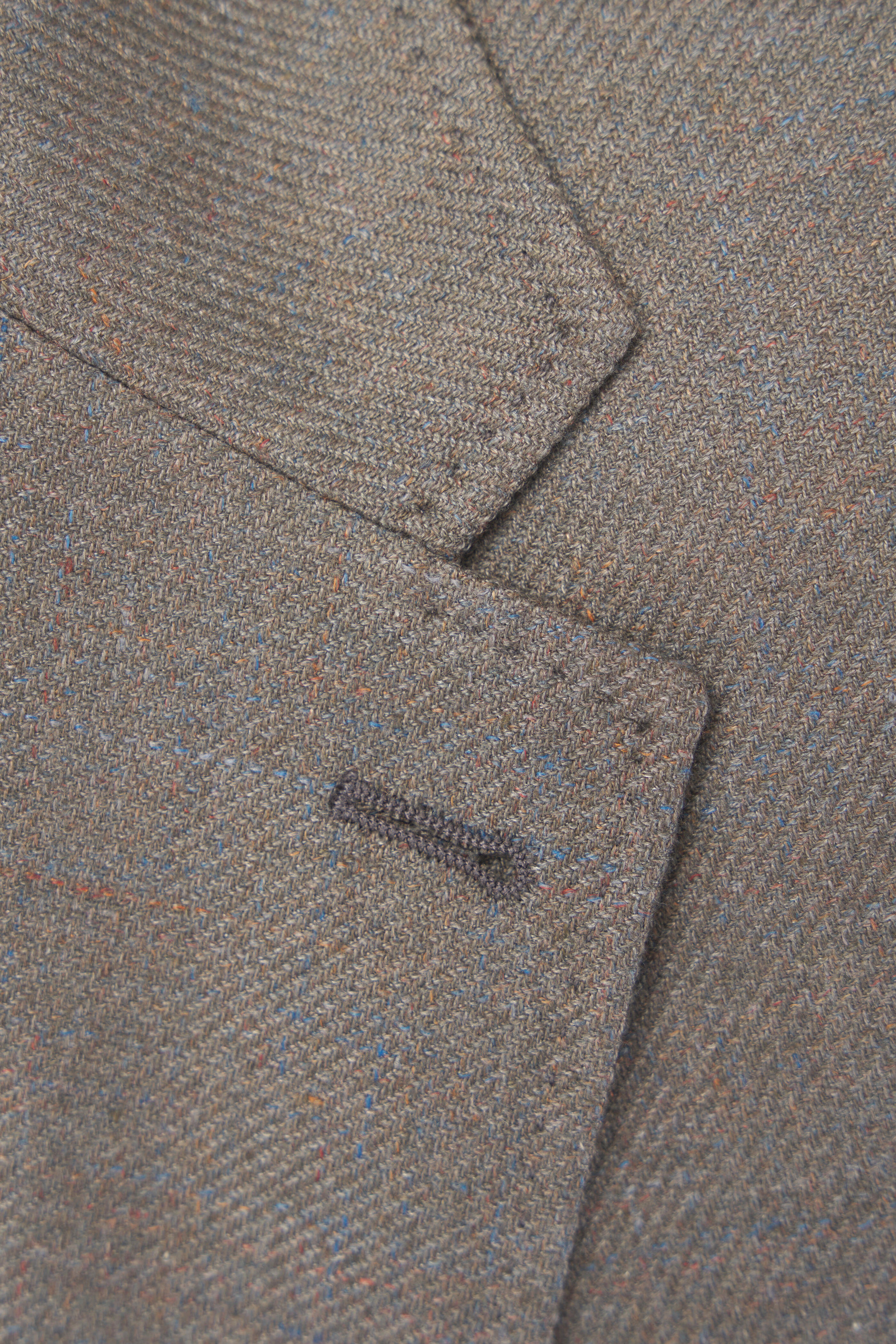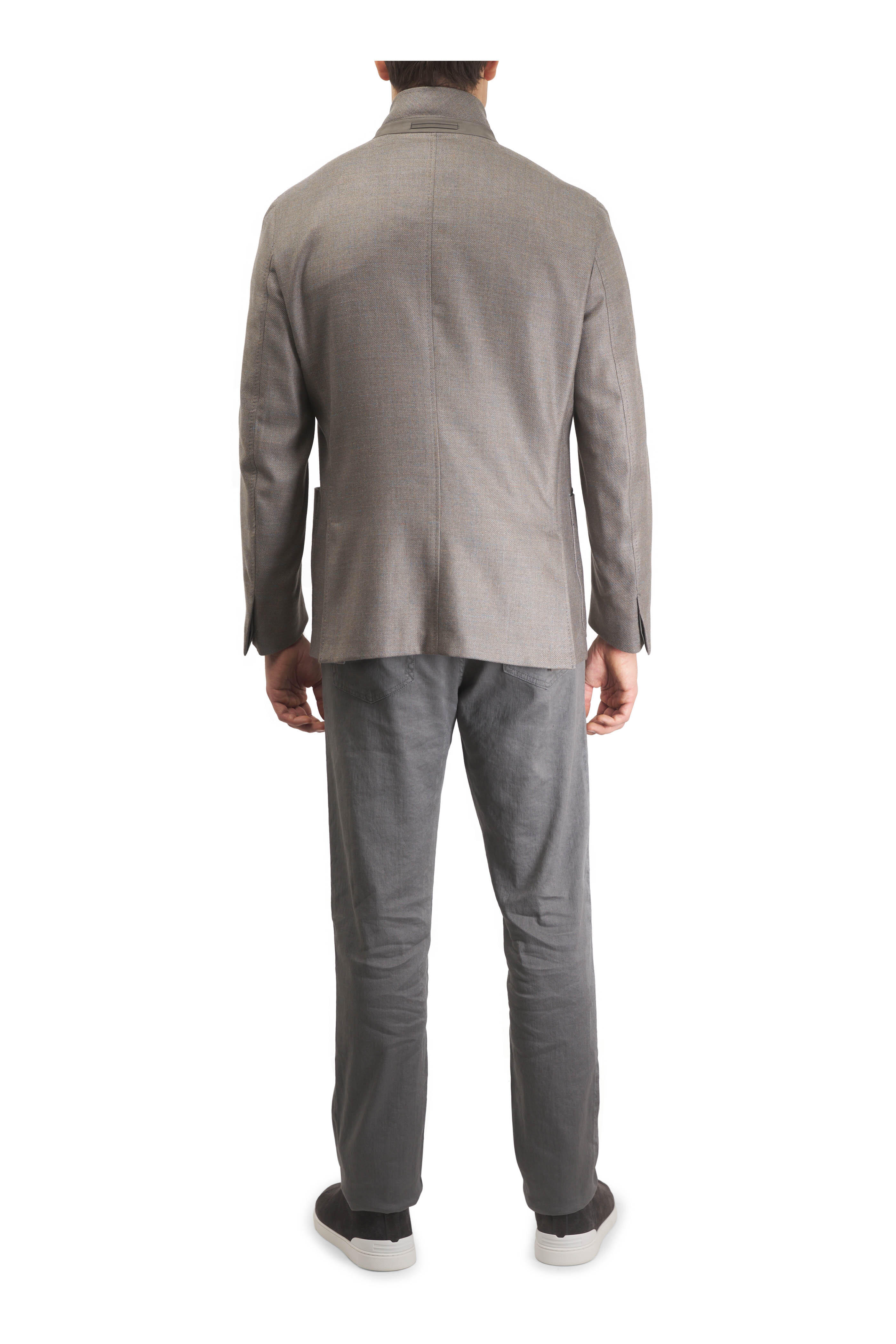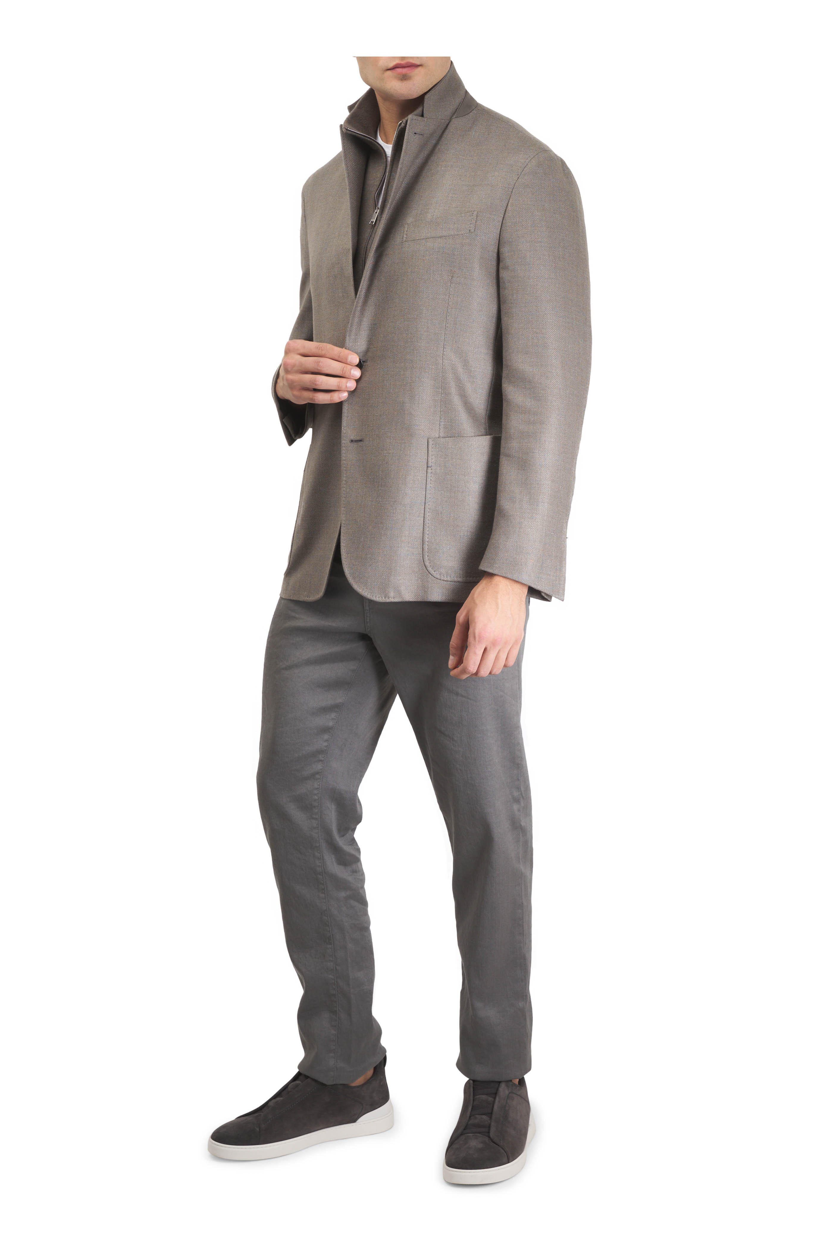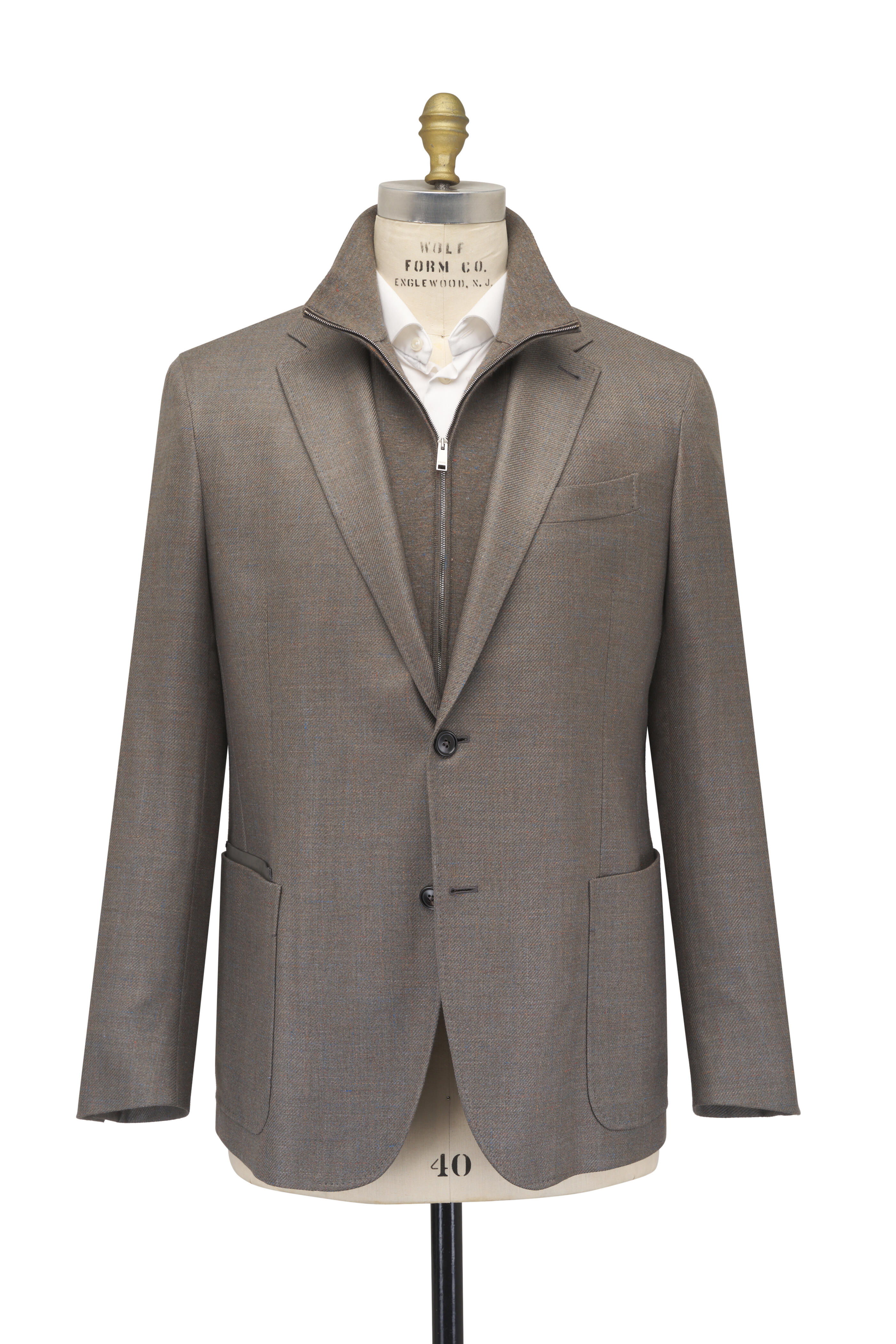 Notched lapels. Removable knit front zip dickey. Two button closure. Lower patch pockets, leather pocket insert, chest welt pocket. Made in Italy. 63% cashmere, 23% silk, 14% linen; partially lined; dickey: 58% cashmere, 18% silk, 13% linen, 10% polyamide, 1% elastane. Dry clean.