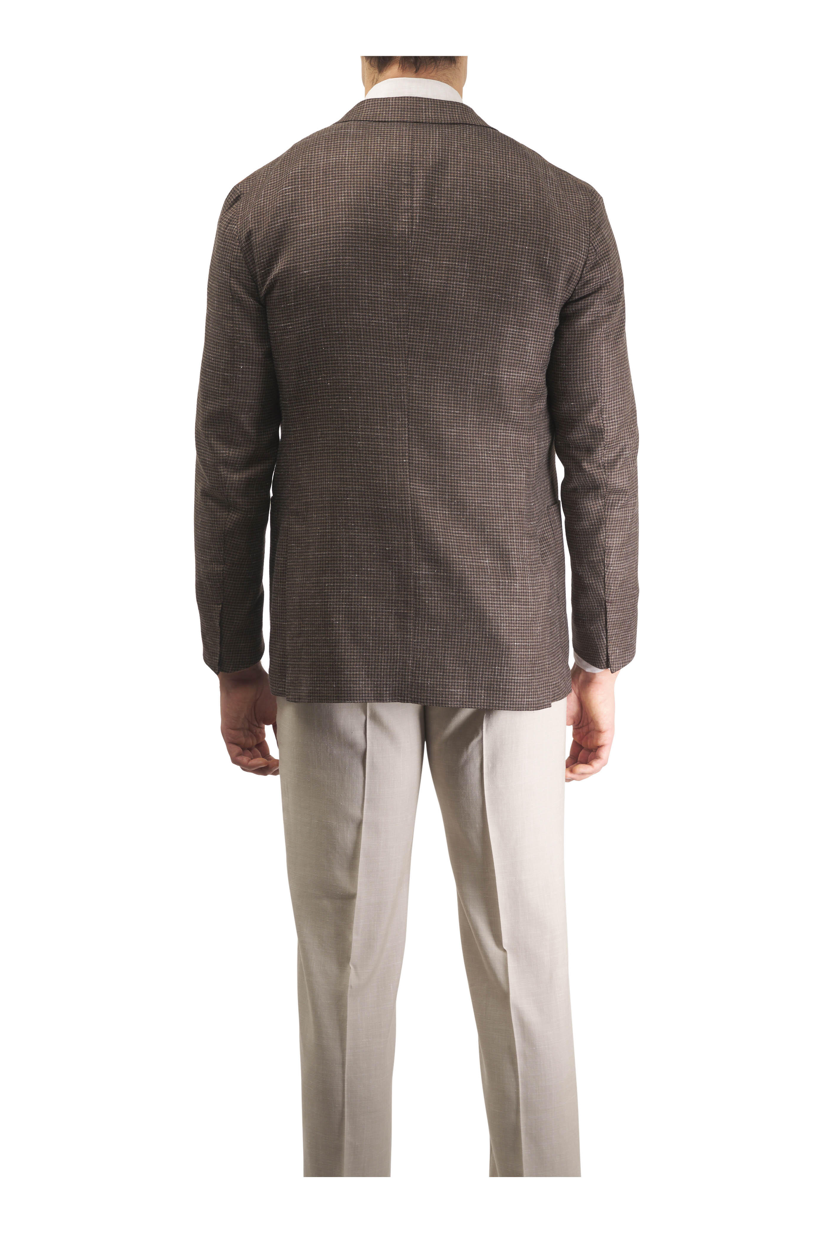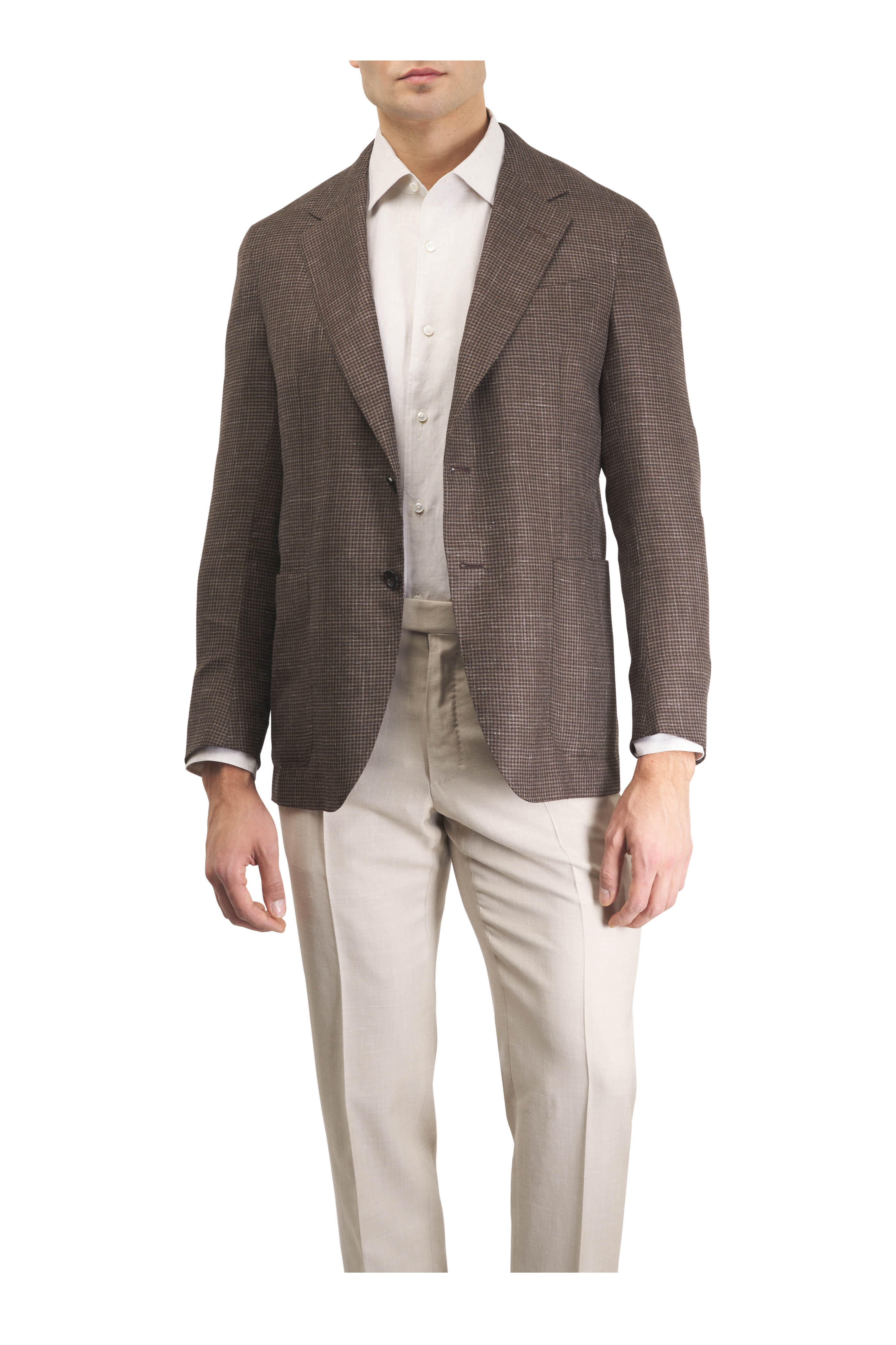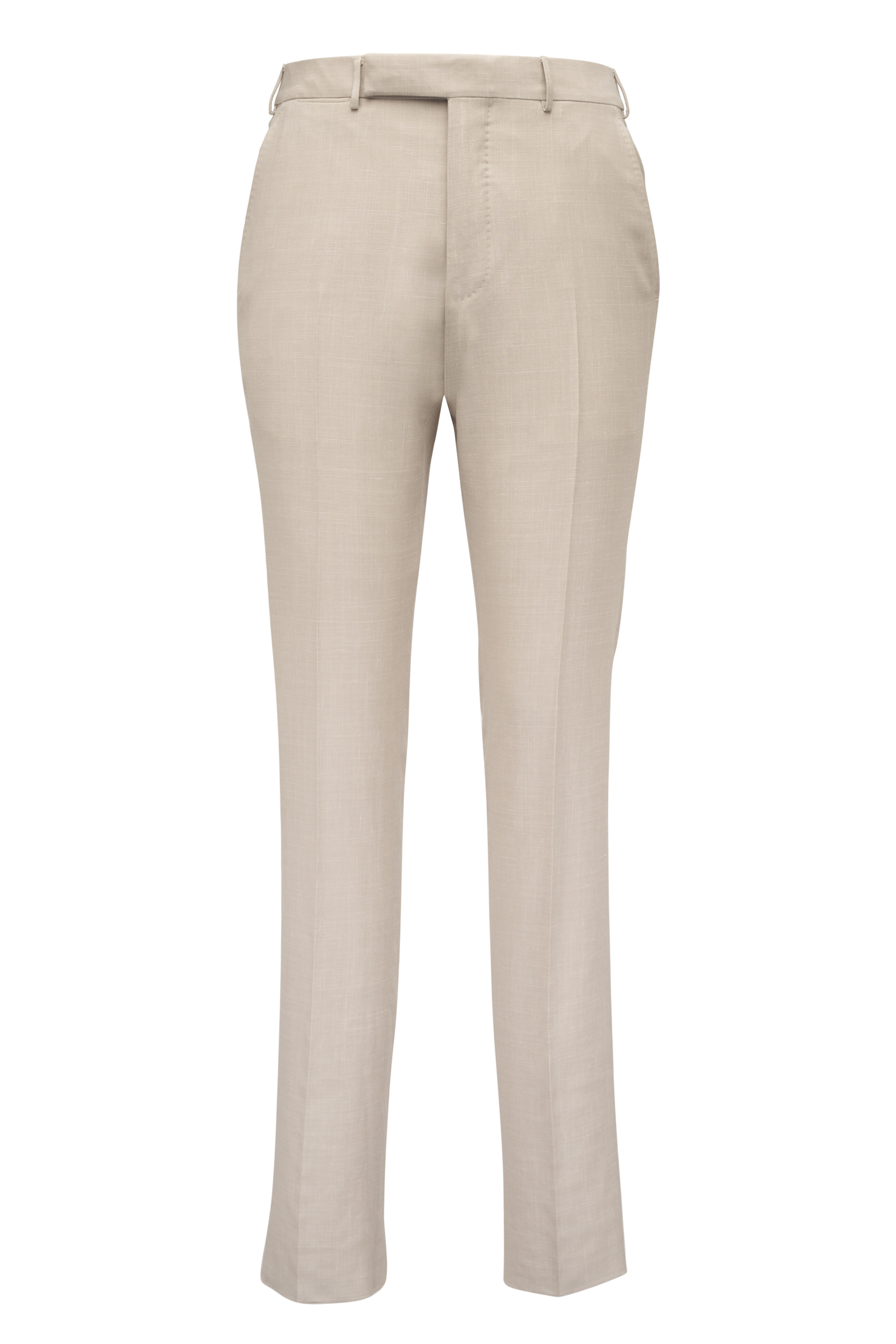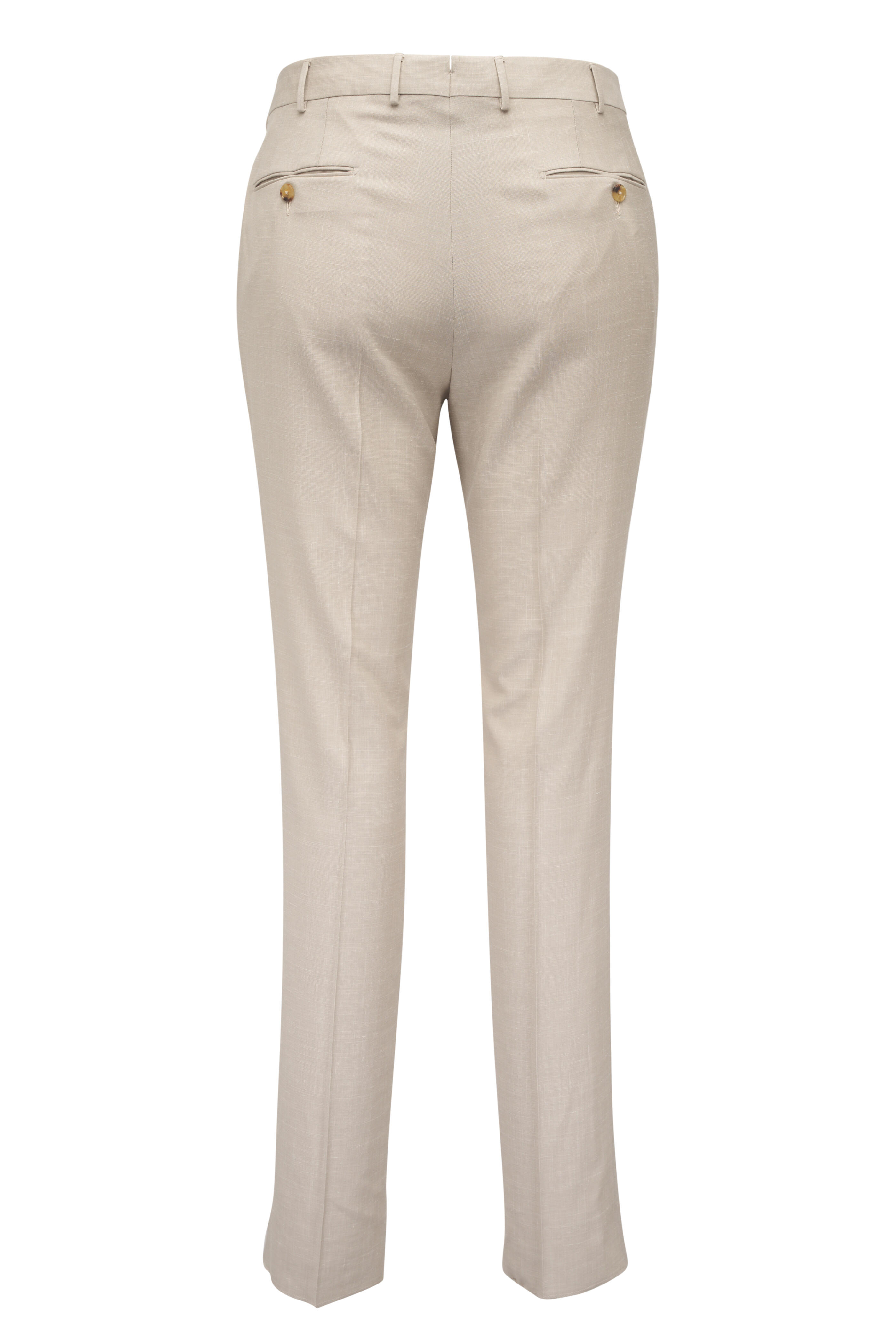 Banded waist; extended waist tab. Front slash pockets, back button-besom pockets. Unfinished hem. Imported. Regular fit. 71% Wool, 17% silk, 12% linen. Dry clean.