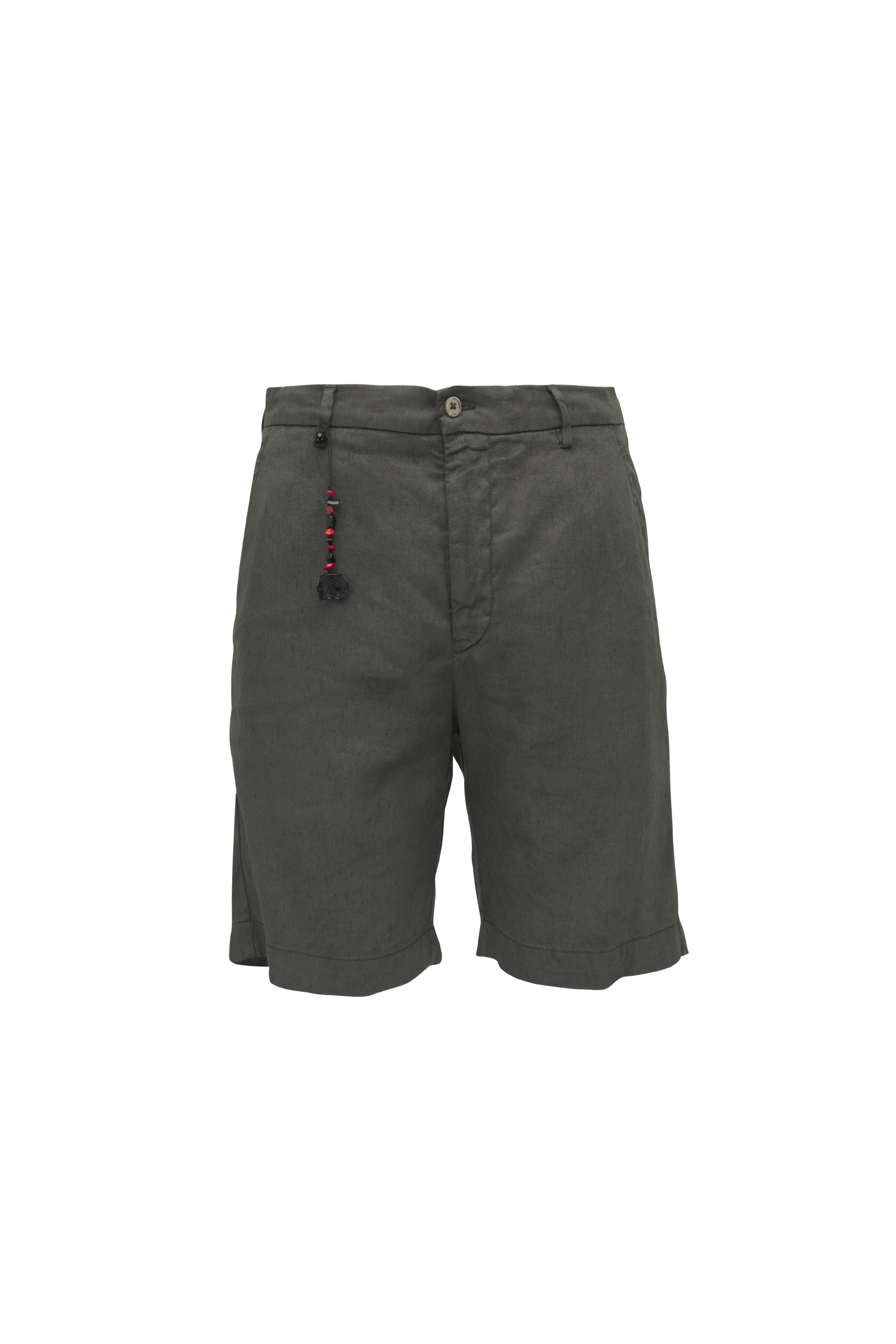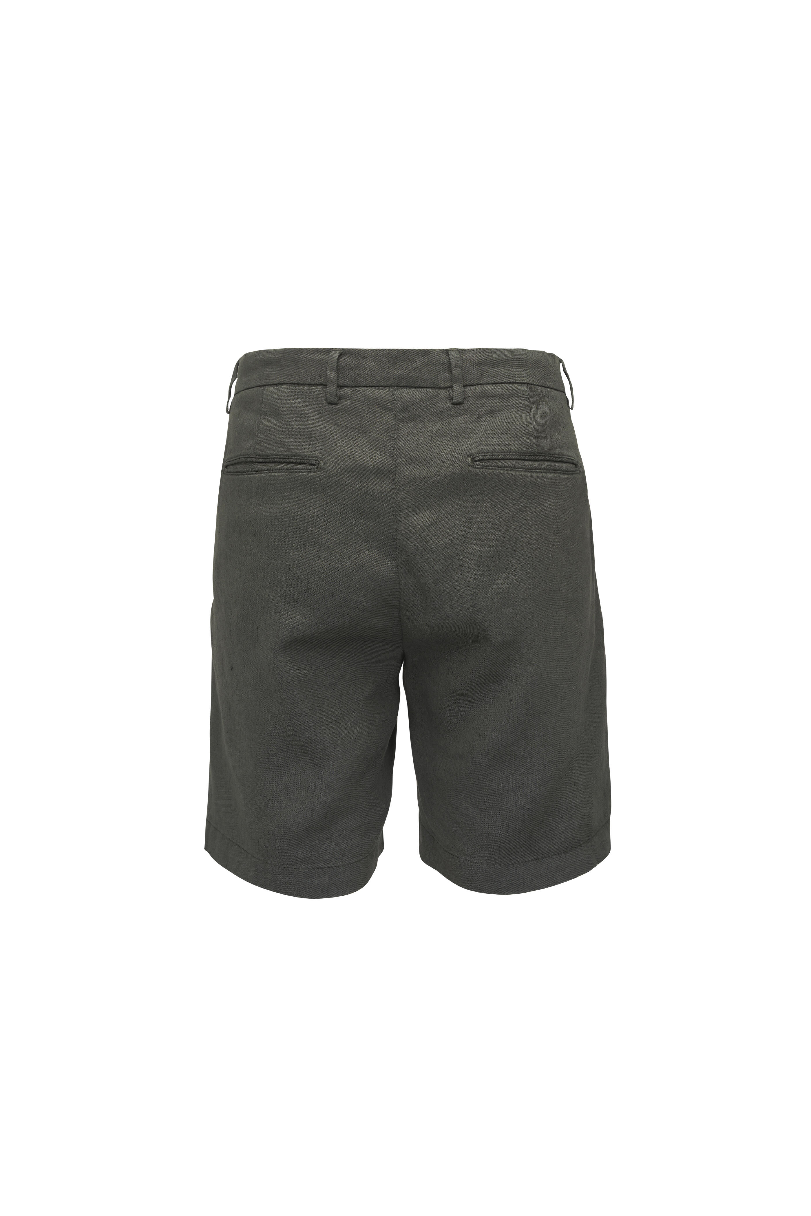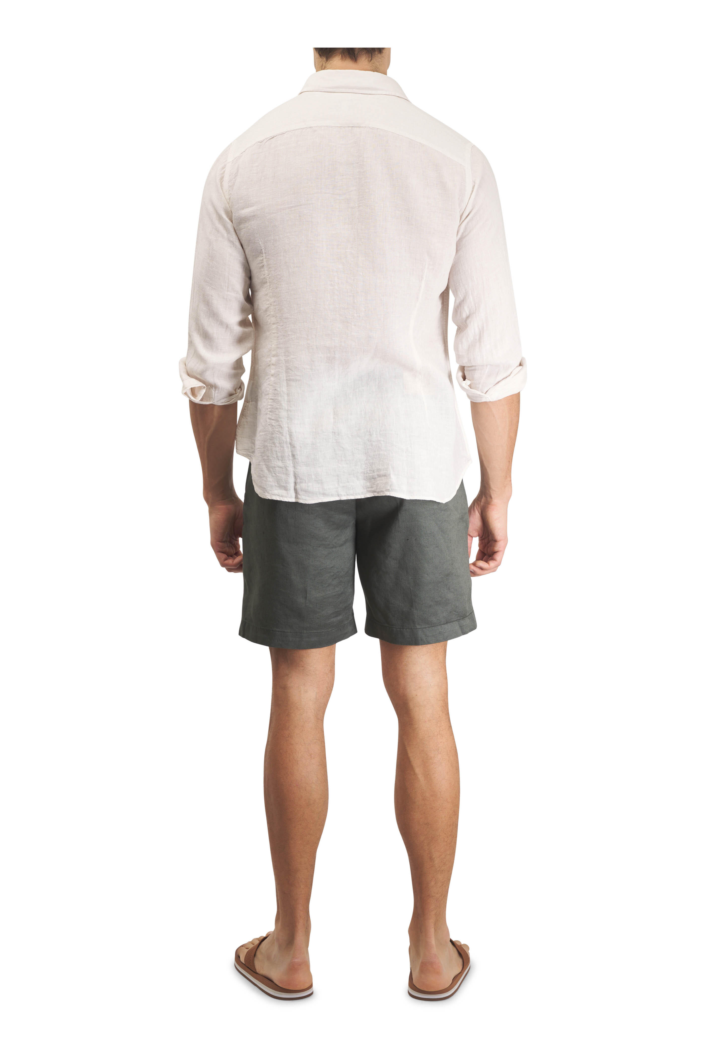 Banded waist; belt loops. Zip fly; two-button closure. Side slip pockets. Back welt pockets. Imported. 57% linen, 41% lyocell, 2% elastane. Dry clean.