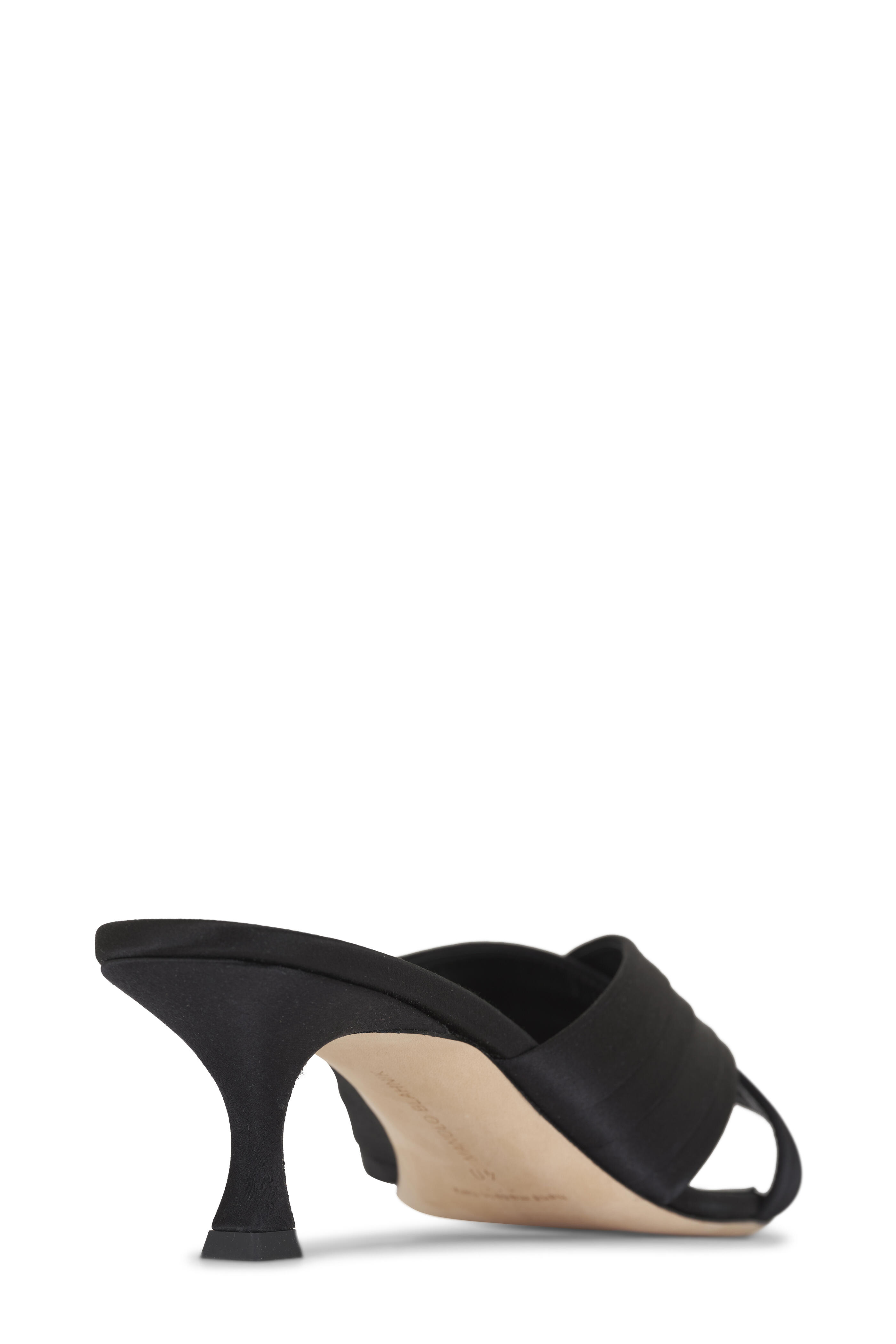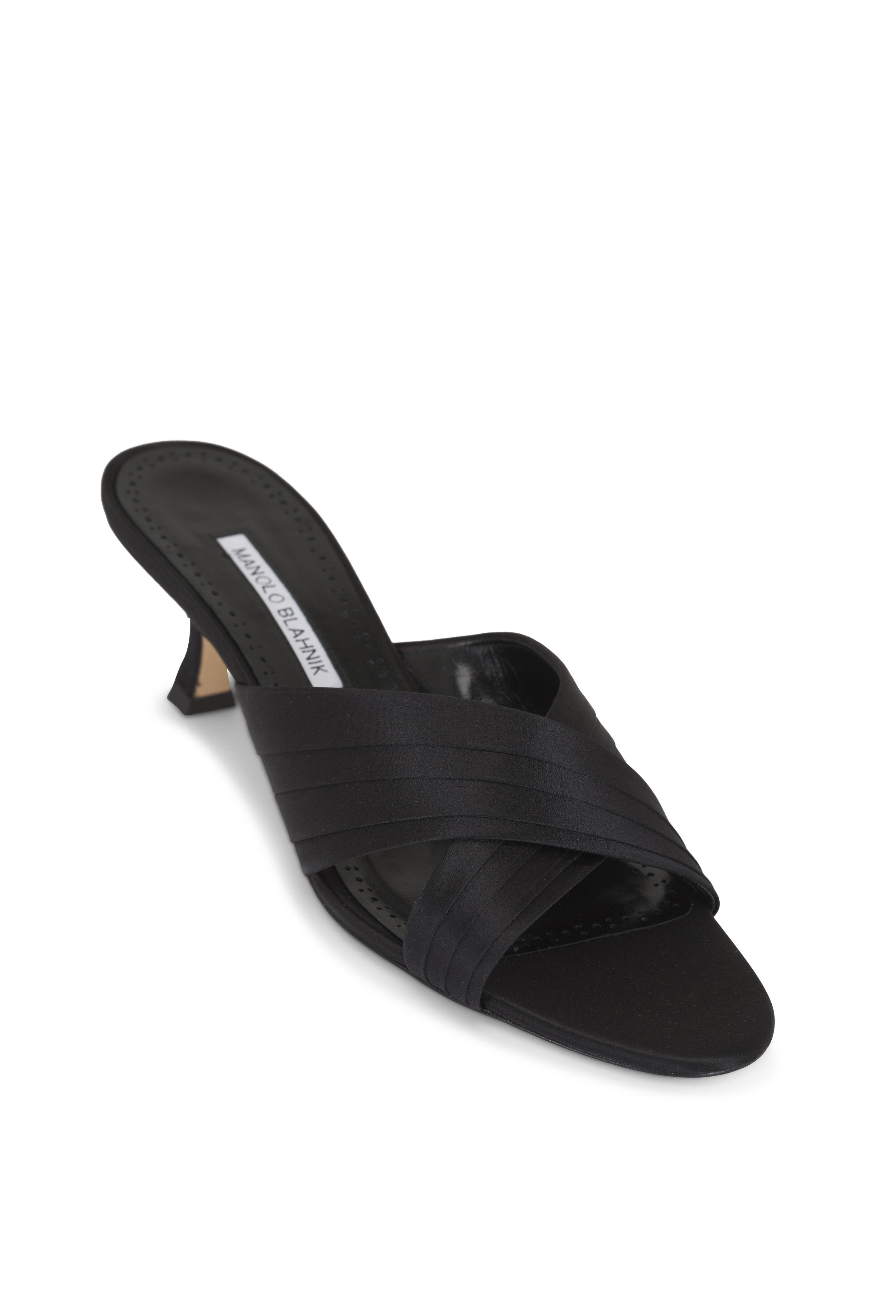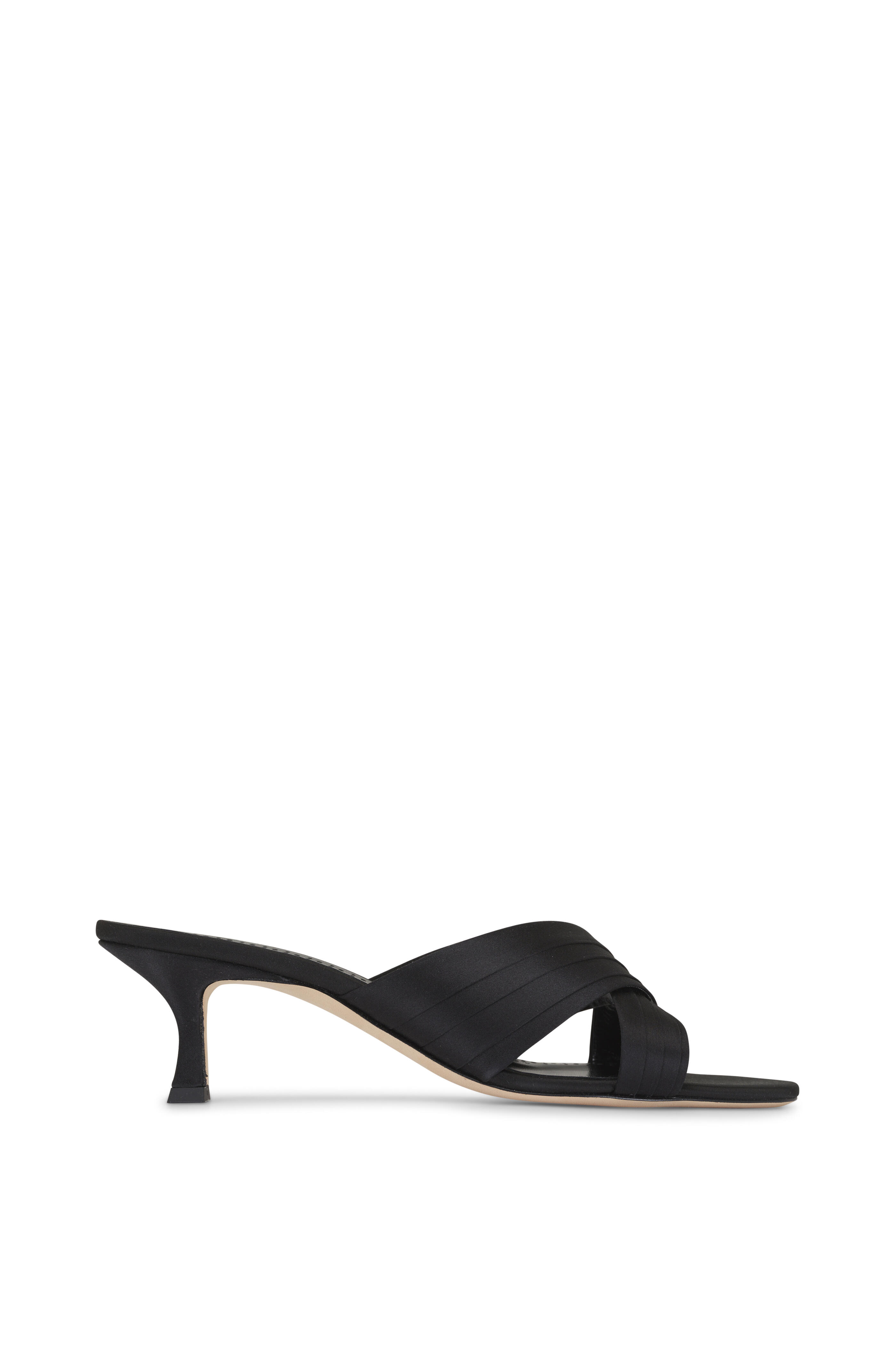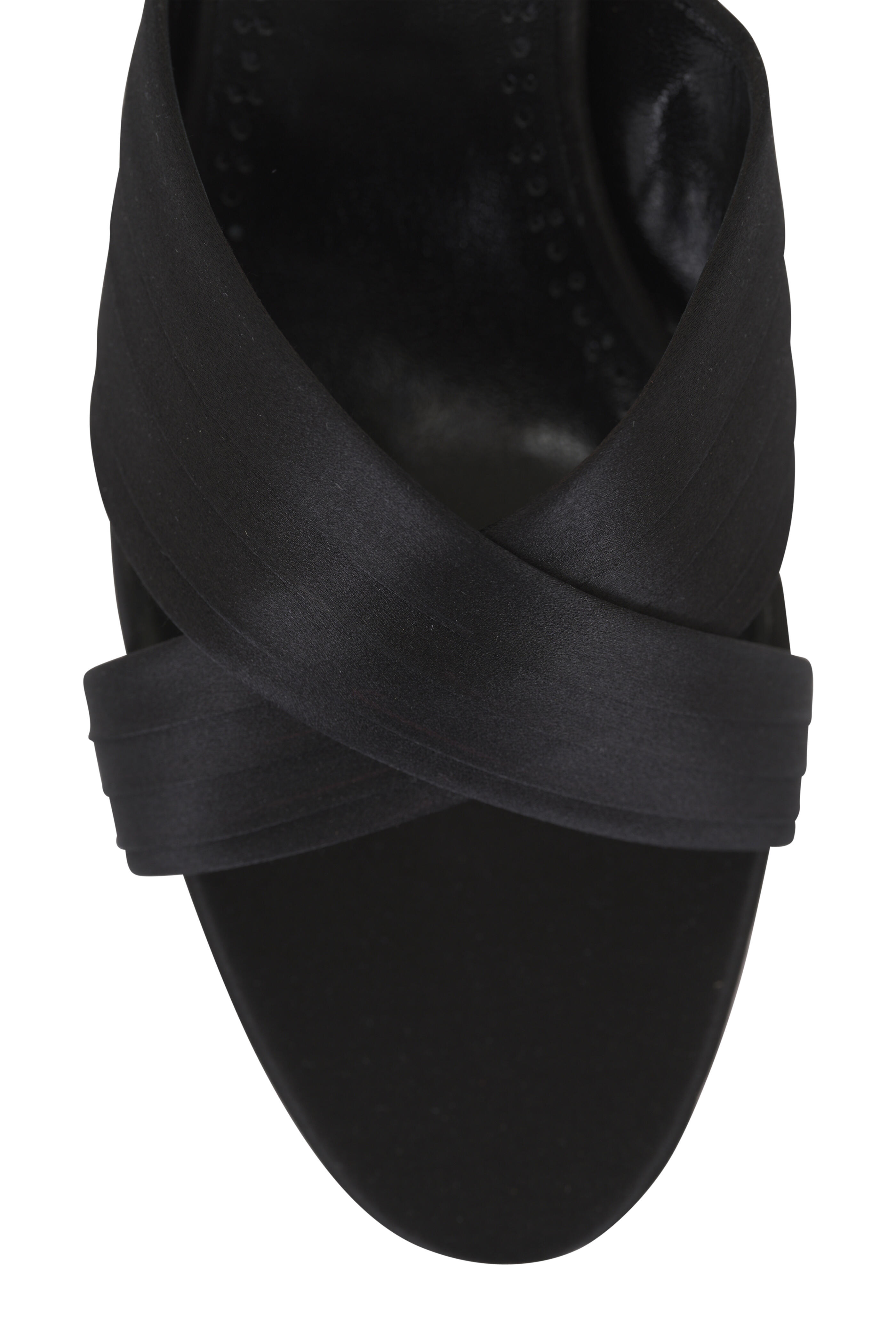Satin upper. Leather lining and sole. Open toe. Criss-cross vamp. Slip-on style. Stiletto heel. Made in Italy. Heel measurement: 50mm.