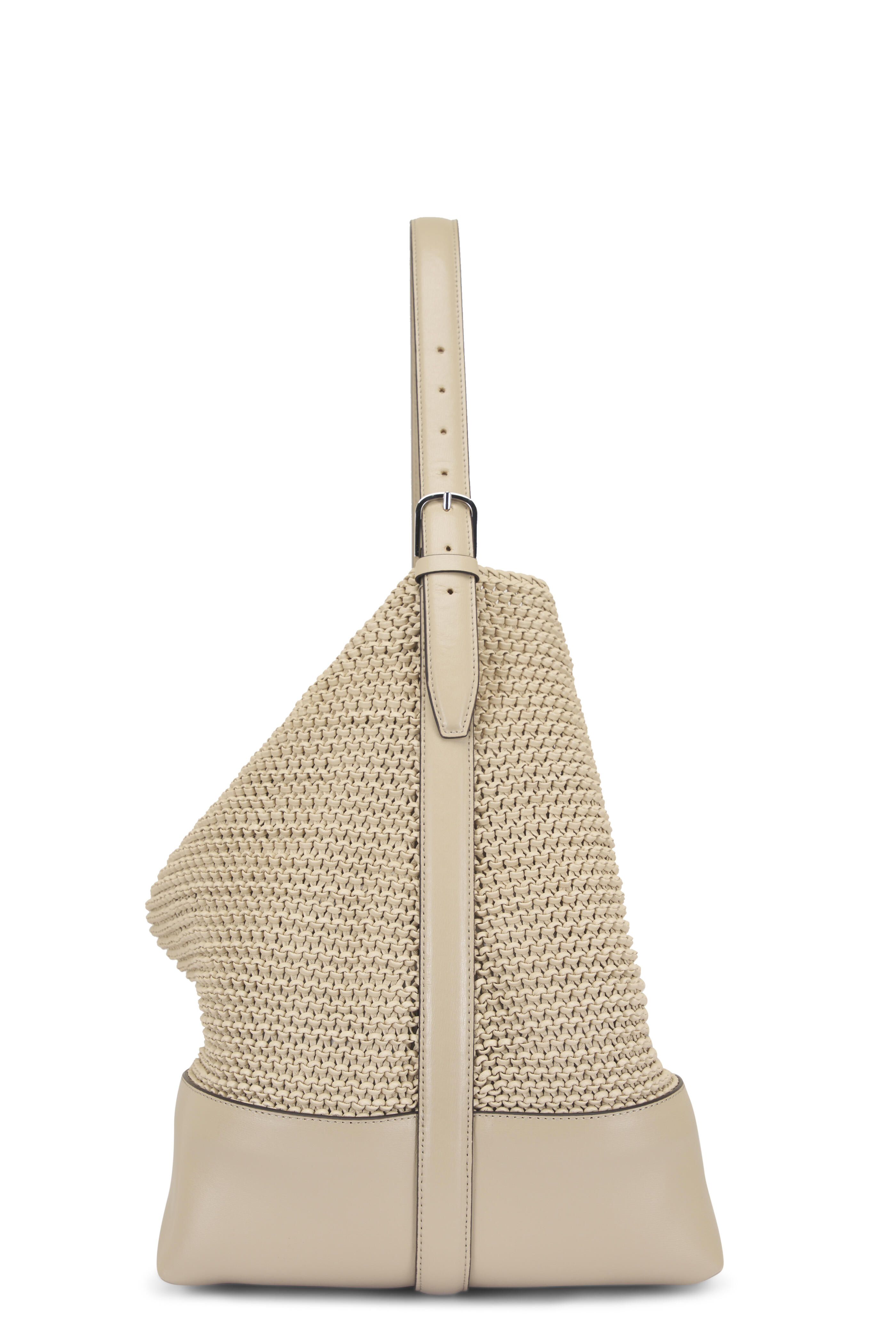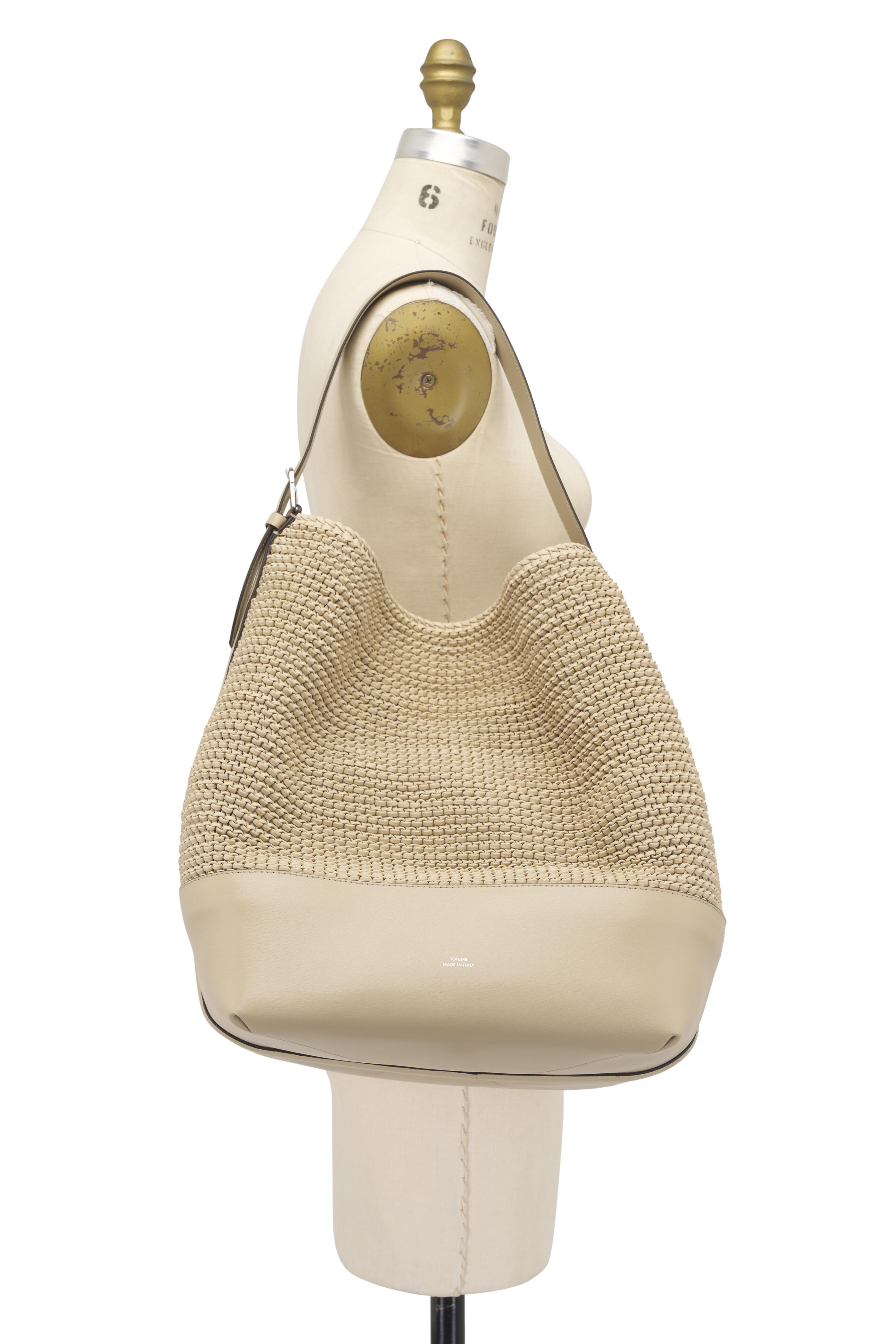 Raffia and leather outer. Unlined. Open top. Adjustable shoulder strap. Gold tone hardware. Made in Italy. Height: 14". Width: 16.5". Depth: 10.5". Shoulder strap drop: 14-19.5".