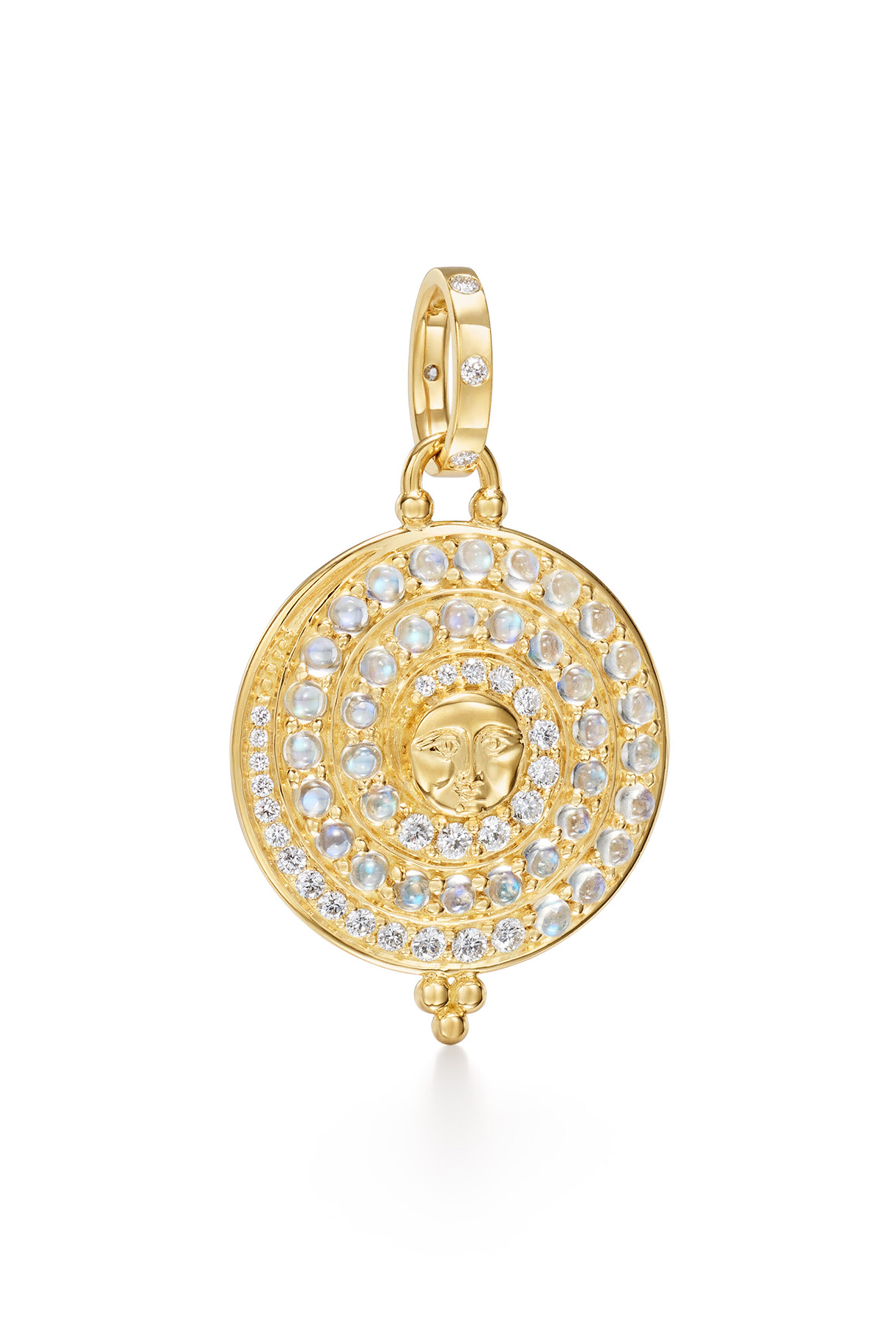 The 18K Small Lunar Glow Pendant features a celestial face at the center of a radiant spiral. Cabochon blue moonstone and diamonds echo the motion of the cosmos — a jewel of luminous rhythm and quiet mystery.