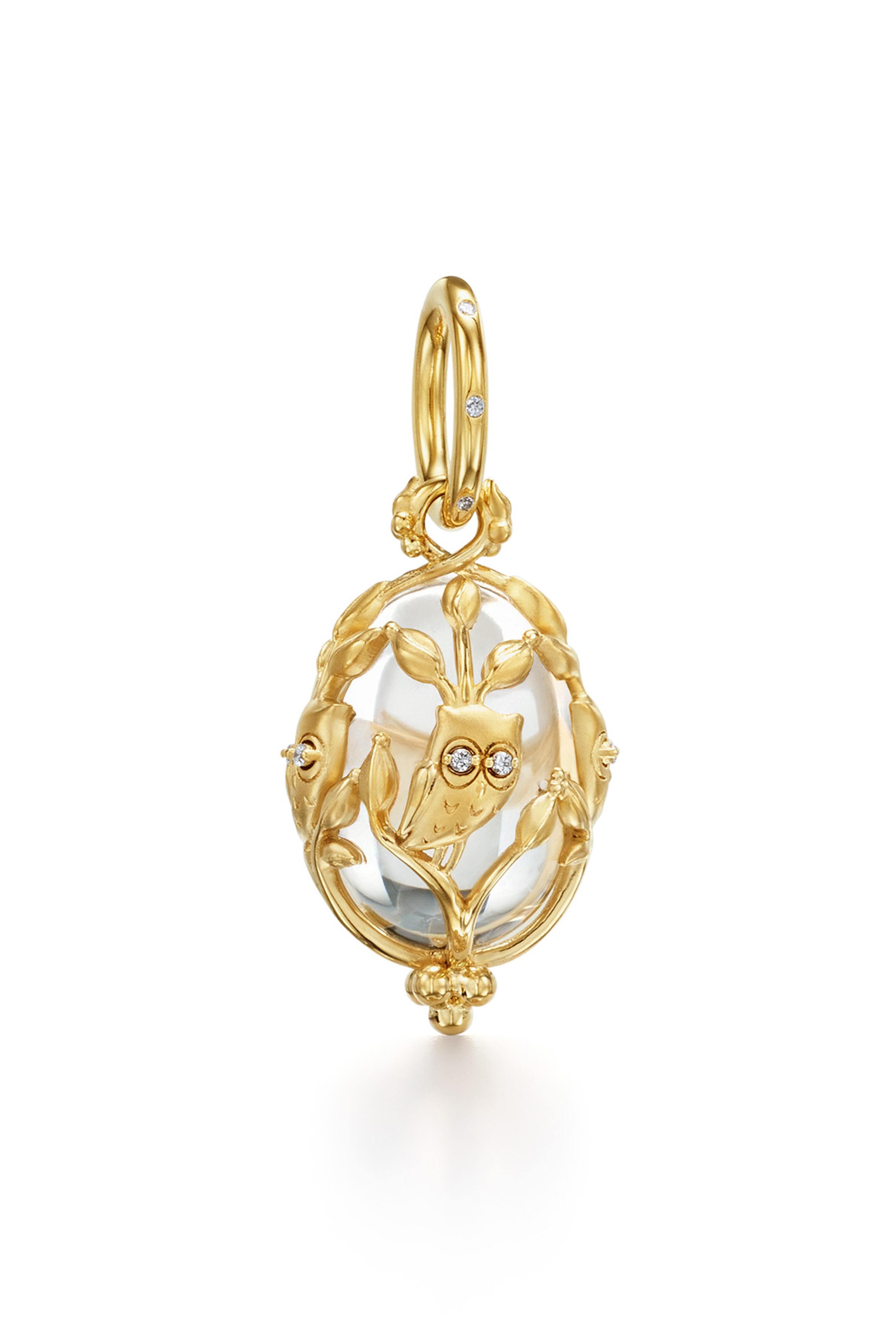The Owlwood Amulet is the most intricate in the series, featuring an expansive golden tree that fully wraps a polished egg of natural rock crystal. Among its branches, a full parliament of owls watches with gem-set eyes—a luminous tribute to wisdom, clarity, and feminine intelligence.