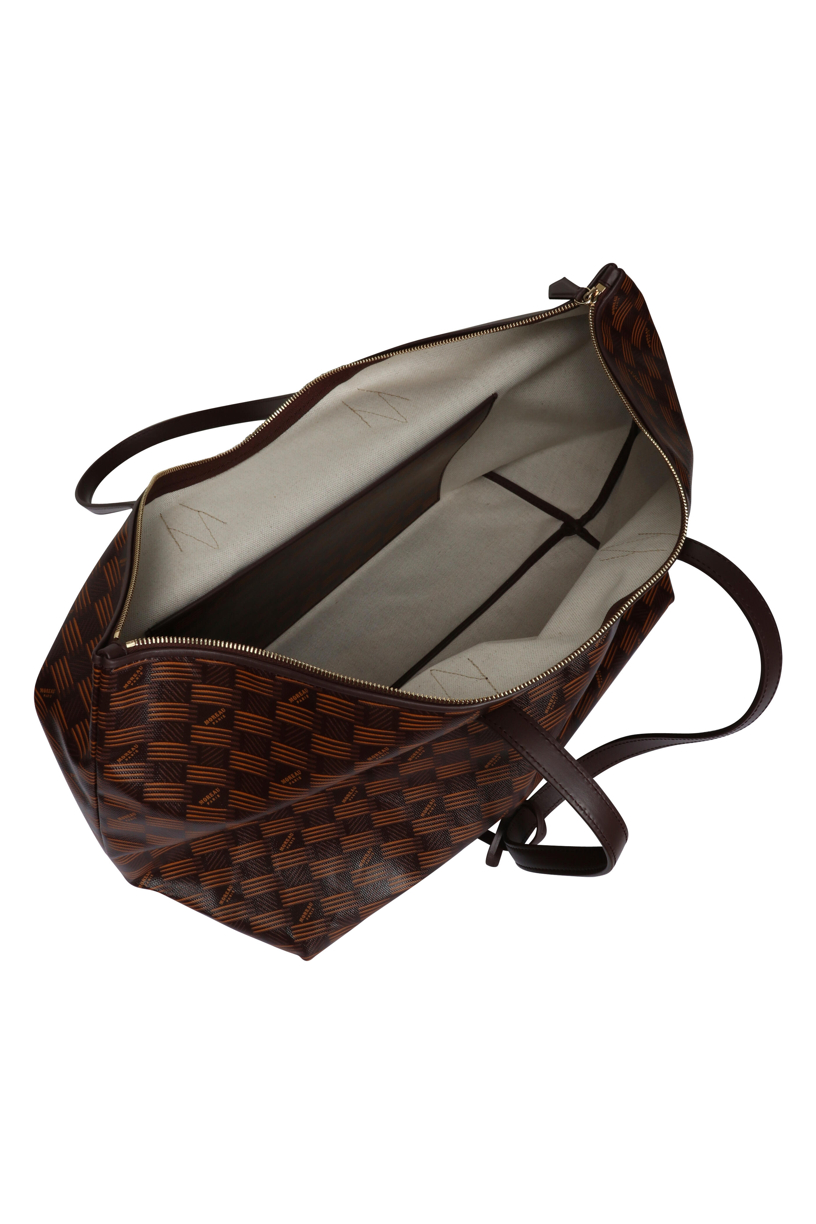Canvas outer. Canvas fabric lining. Top zipper. Dual top handles. Signature Moreanutte canvas. Gold-tone hardware. Includes luggage tag. Interior wall pocket. Made in Italy. Approx.: 13” x 10” x 6.3”.