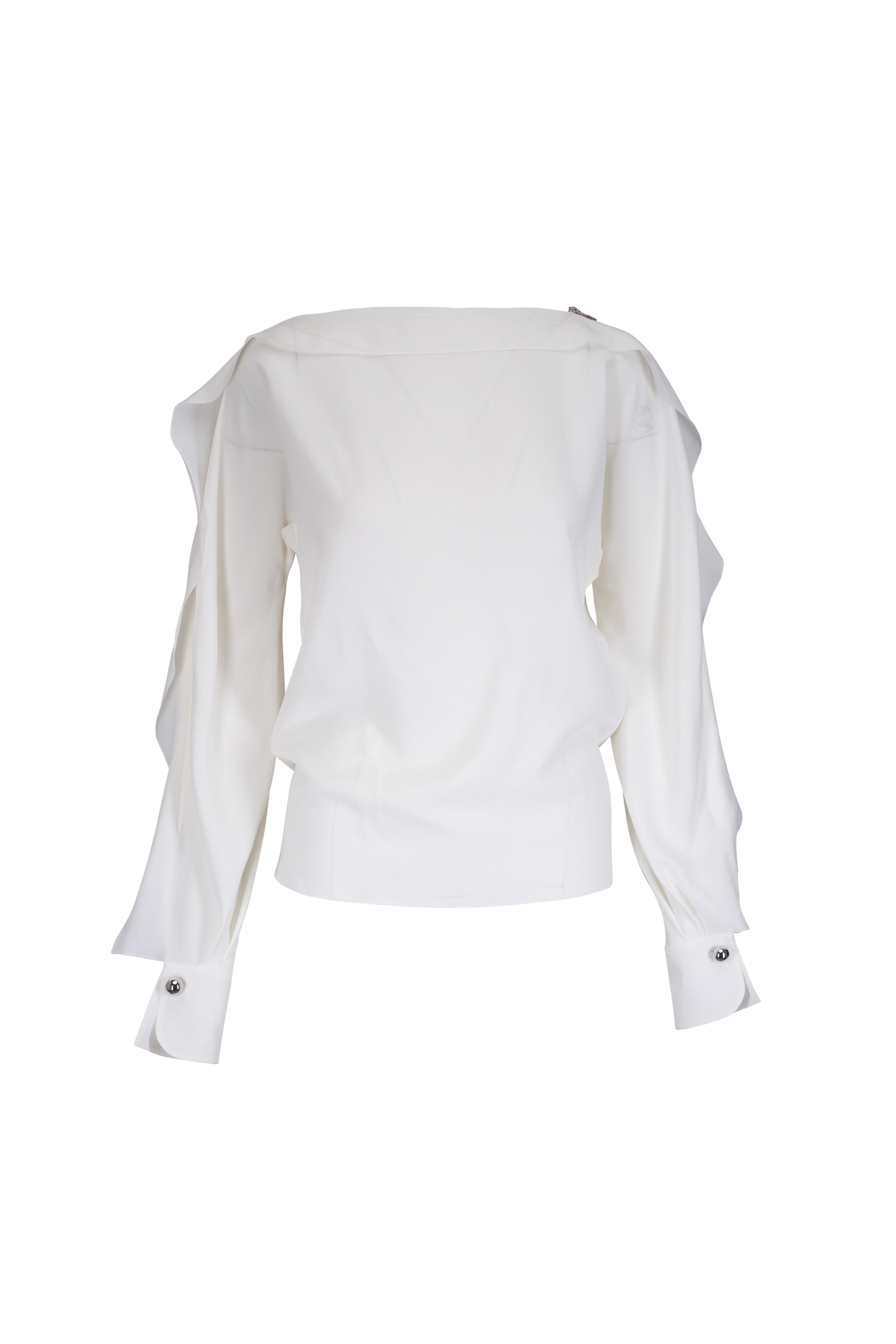Bateau neckline. Ruffle sleeves. Made in Italy. 70% viscose, 30% silk. Dry clean.