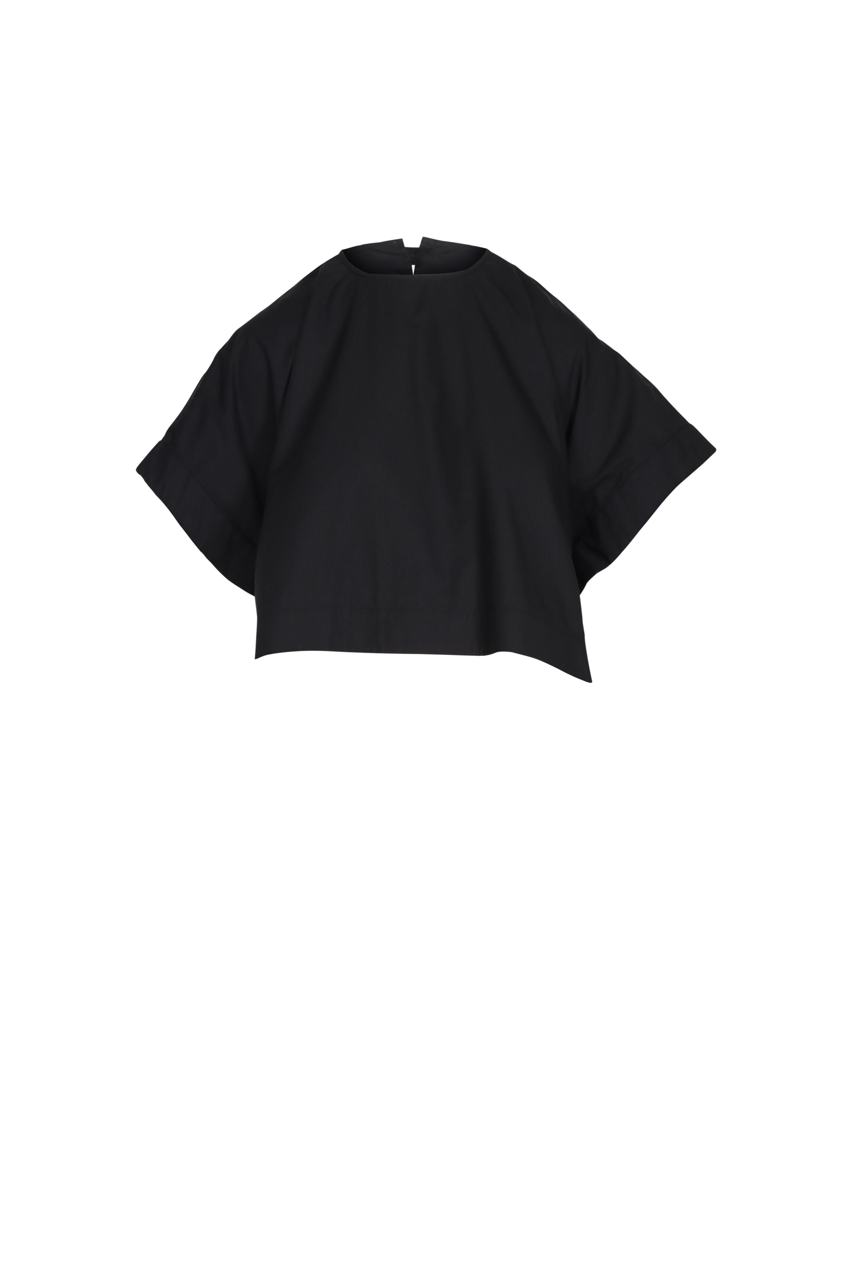 Round neck. Back button closure; keyhole detail. Short dolman sleeves. Boxy fit. Drape detail. Imported. Cropped length. 100% organic cotton. Dry clean.