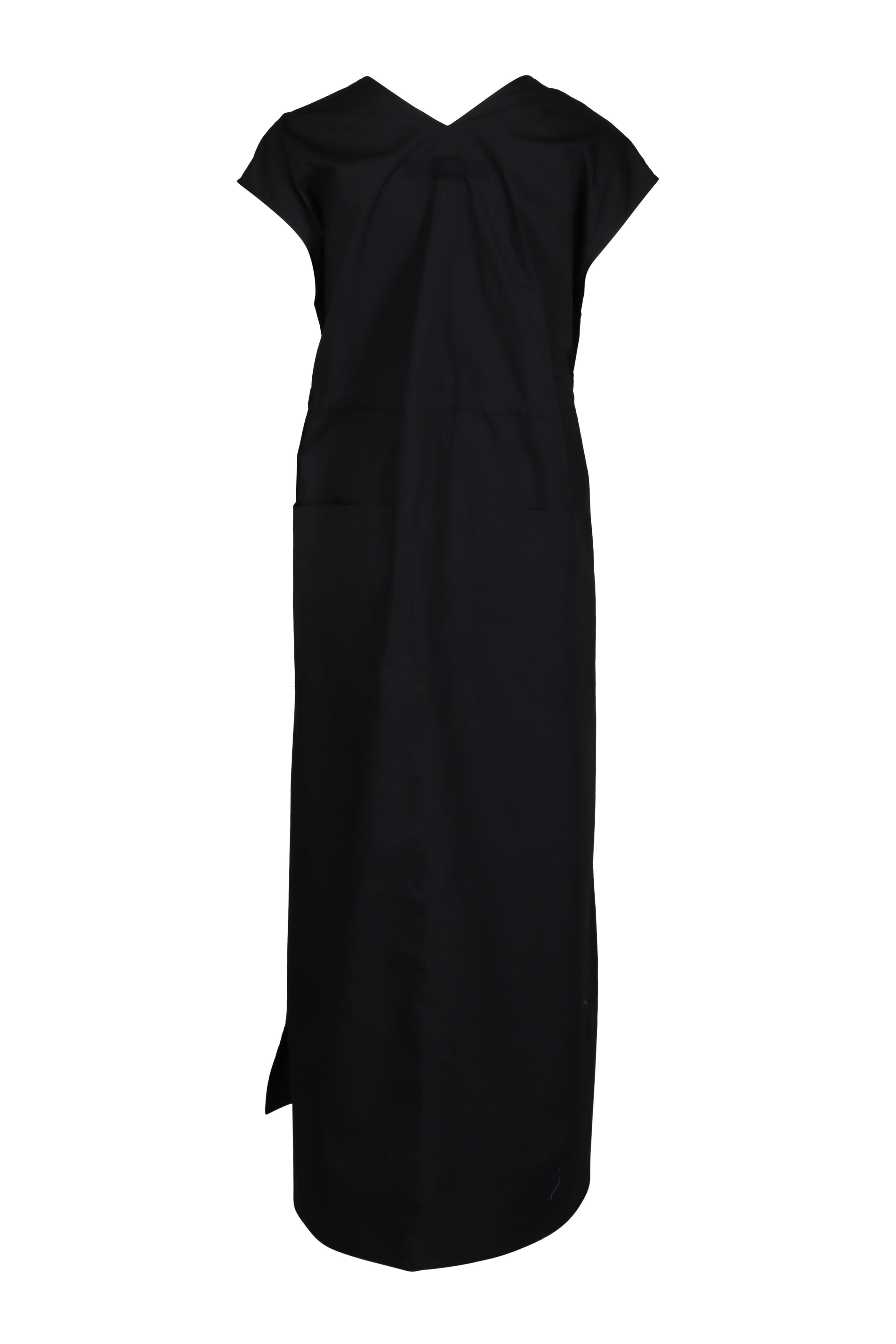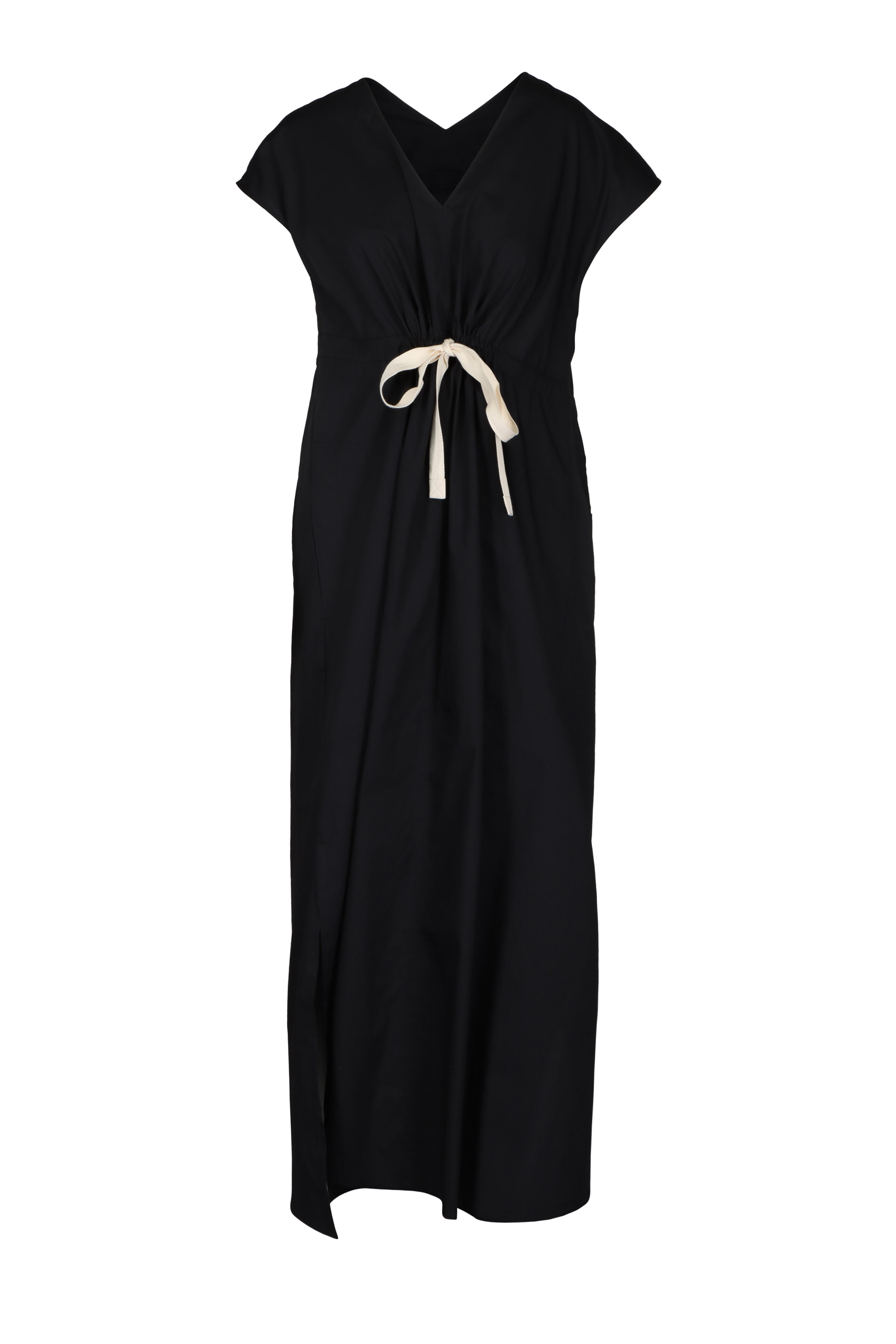 V-neckline with cap sleeves. Side splits. Adjustable self-tie waistband. Imported. Relaxed fit. 100% BCI Cotton Poplin. Dry clean.