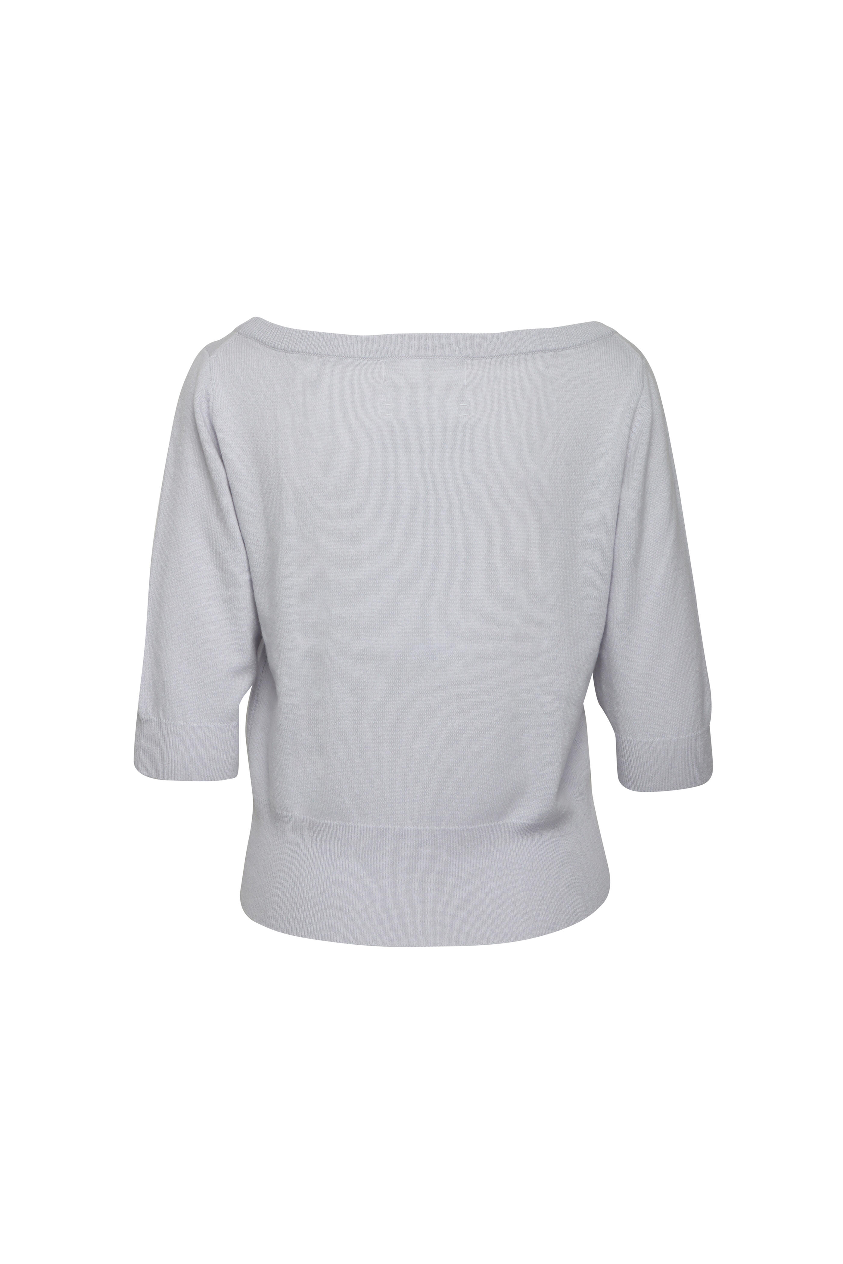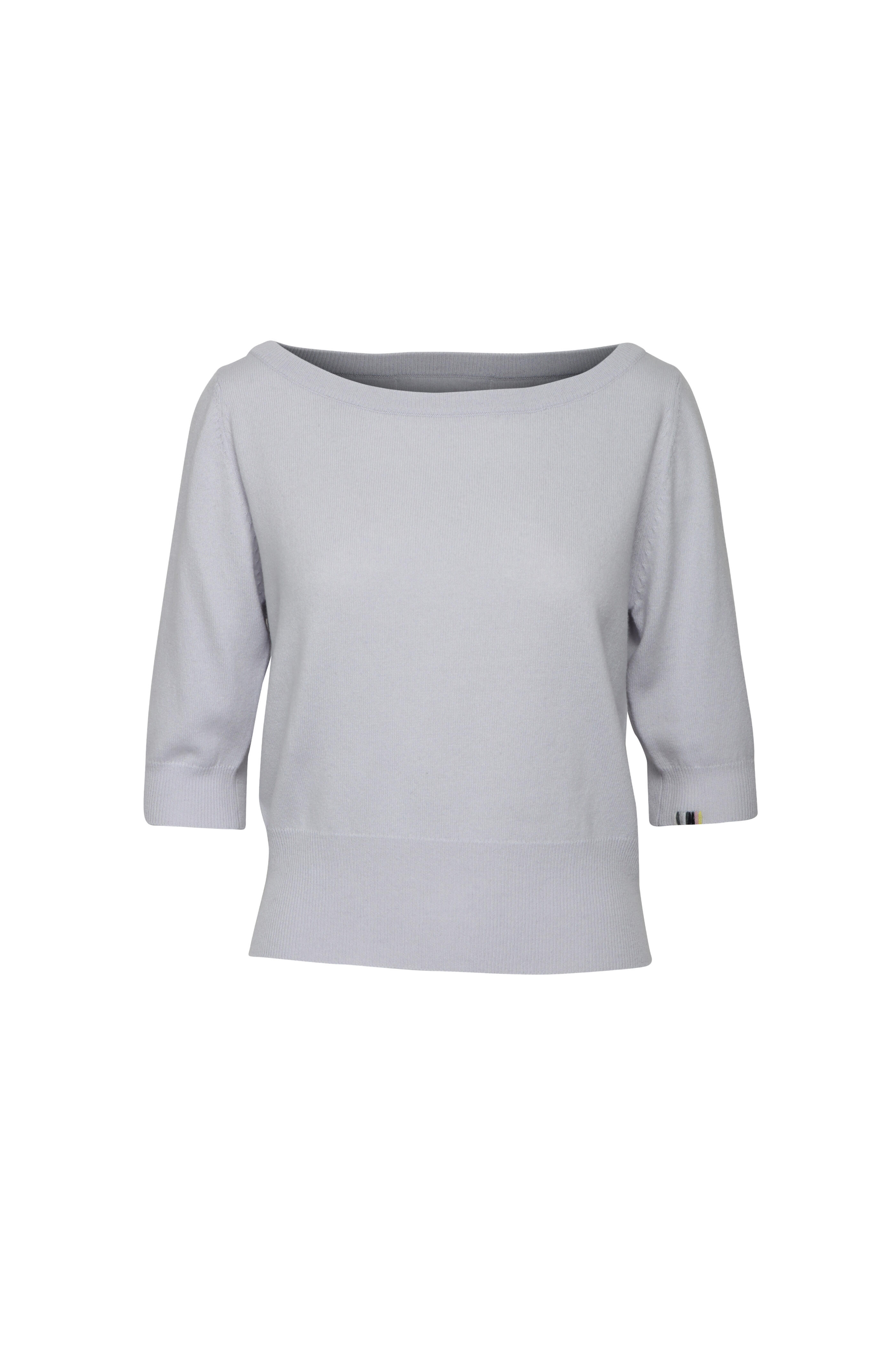 Boatneck. Elbow length sleeves. Relaxed fit. Ribbed neck, cuffs, and hem. Imported. Bust 56 cm. Length 52 cm. Hip length. 100% cashmere. Machine washable.