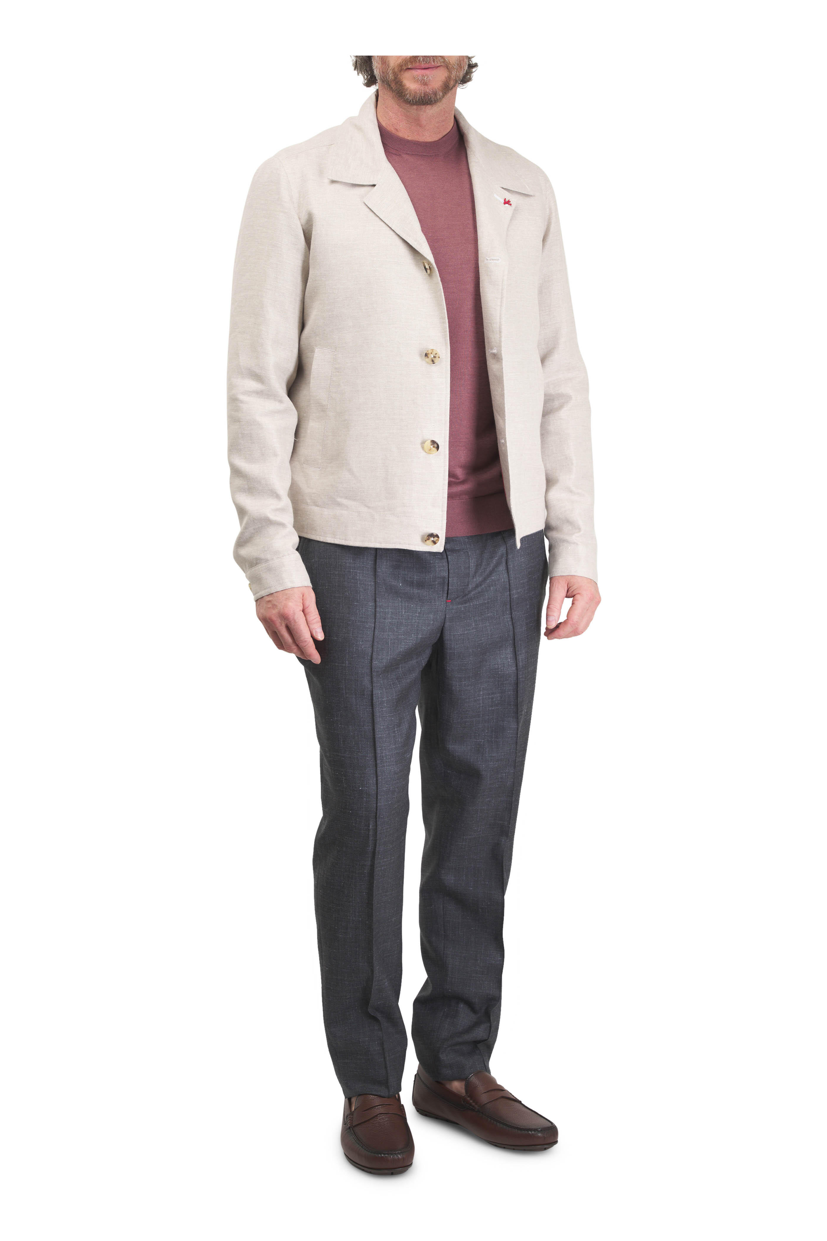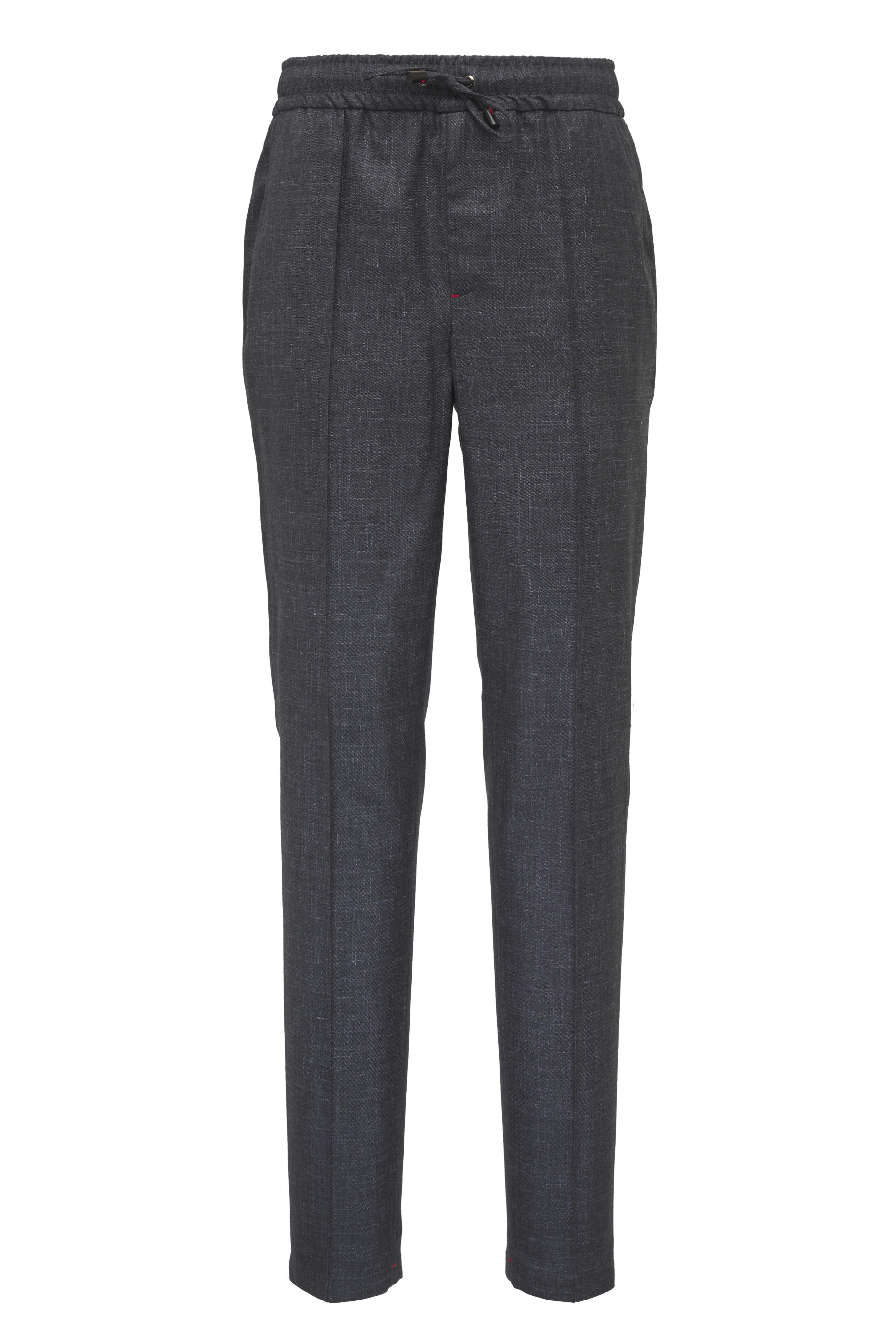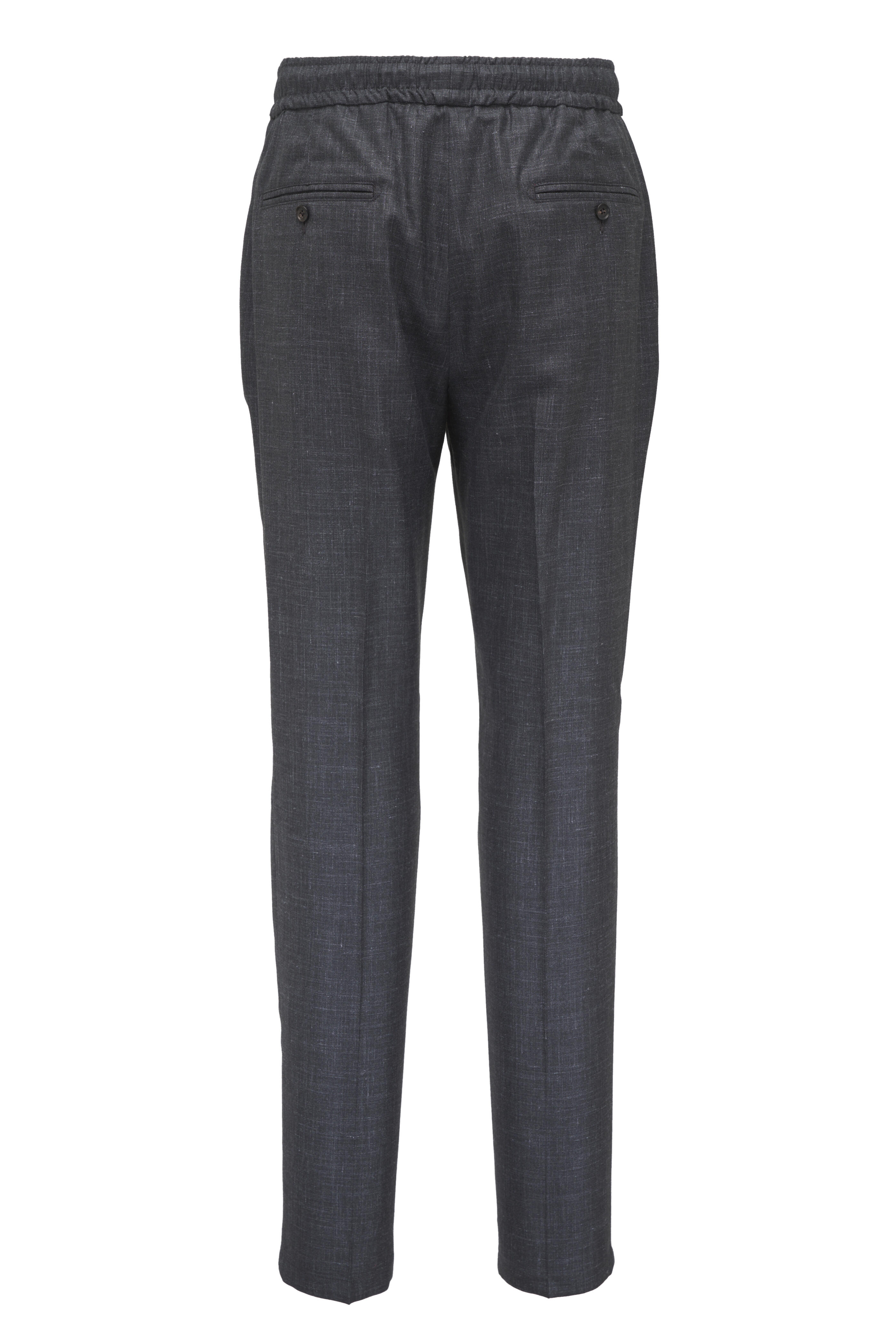 Drawstring; zip fly. Slip on style. Waist slip pockets; back besom pockets. Straight hem. Made in Italy. 90% Wool, 5% cashmere, 3% polyamide, 2% elastane. Dry clean.