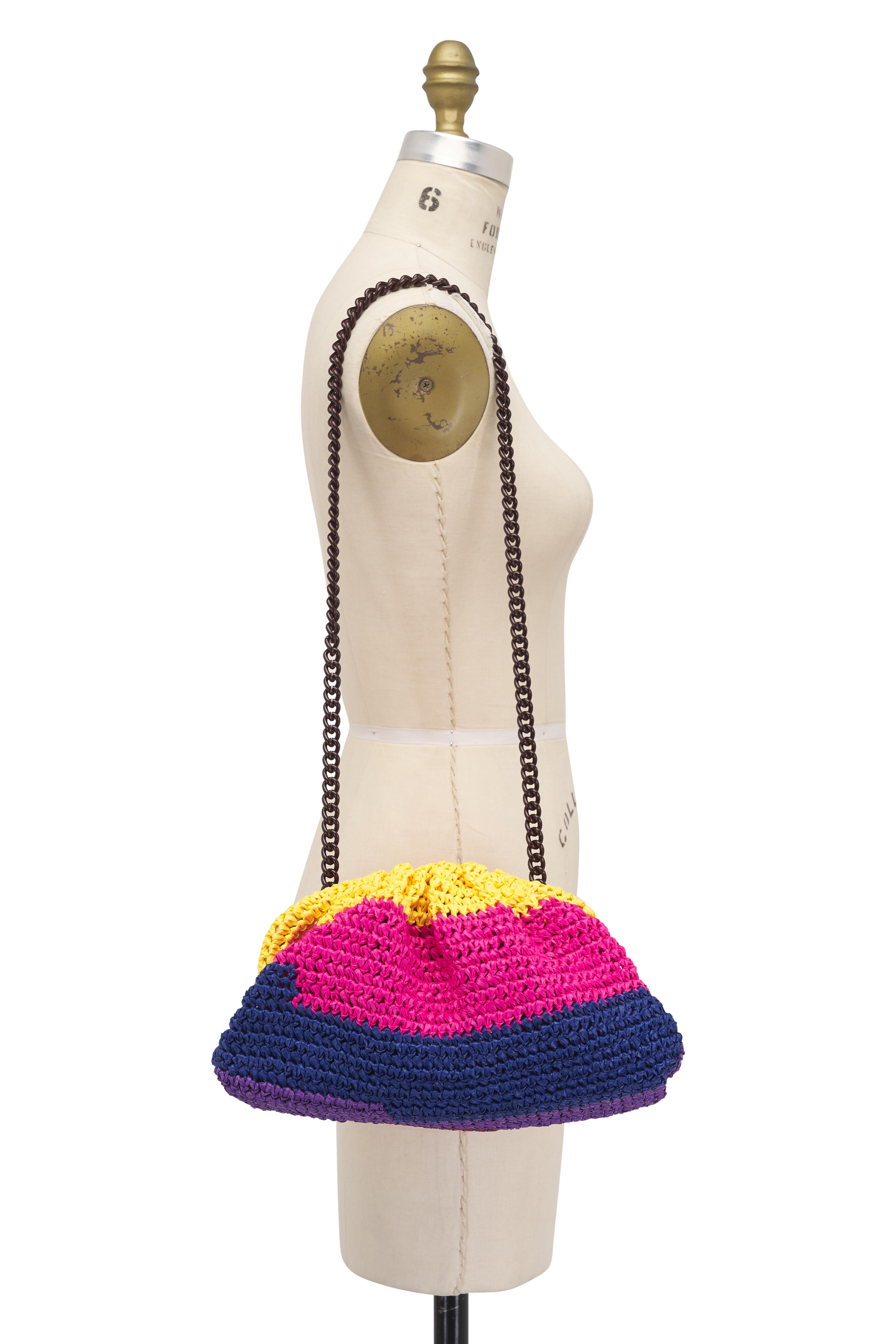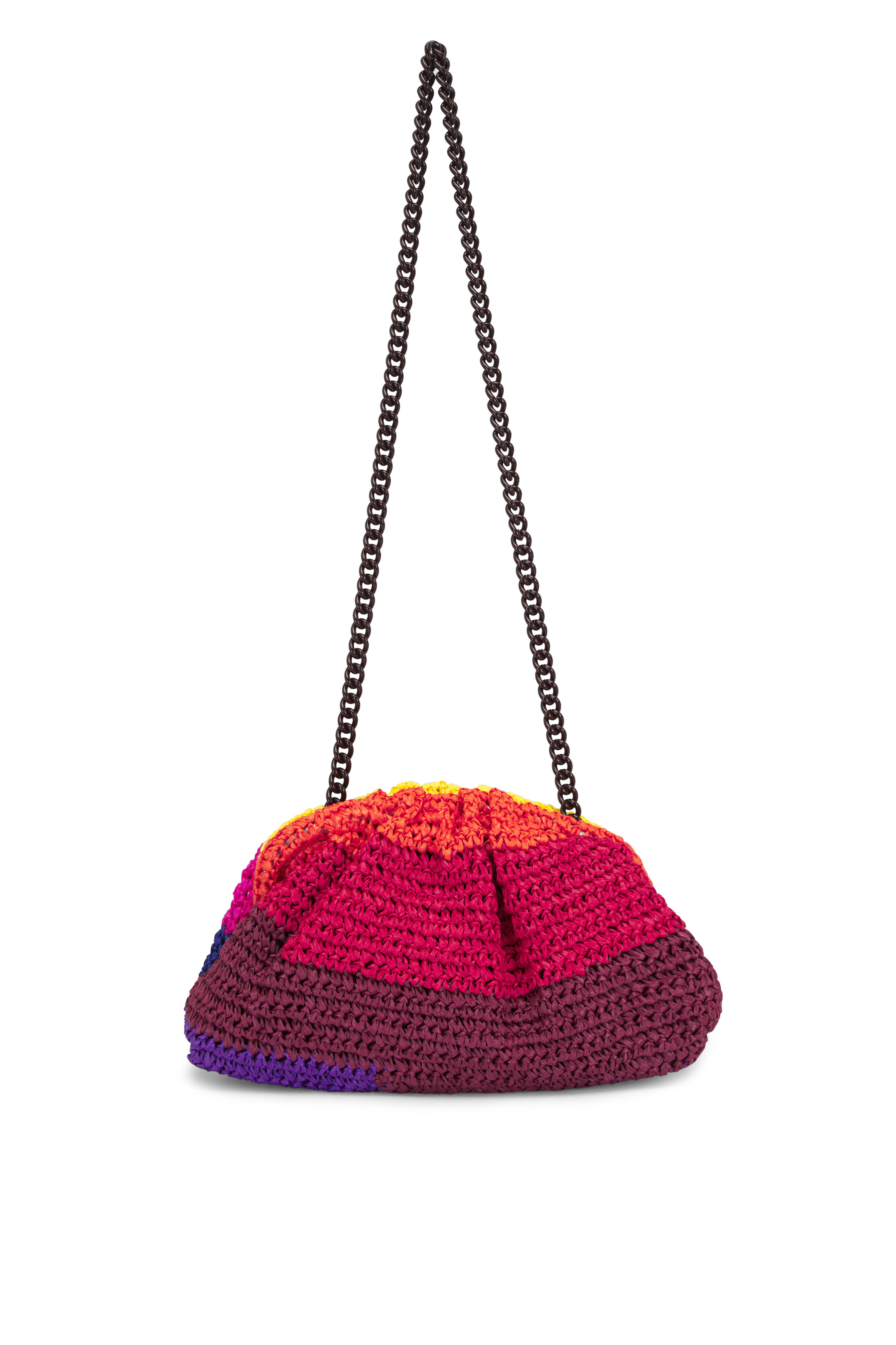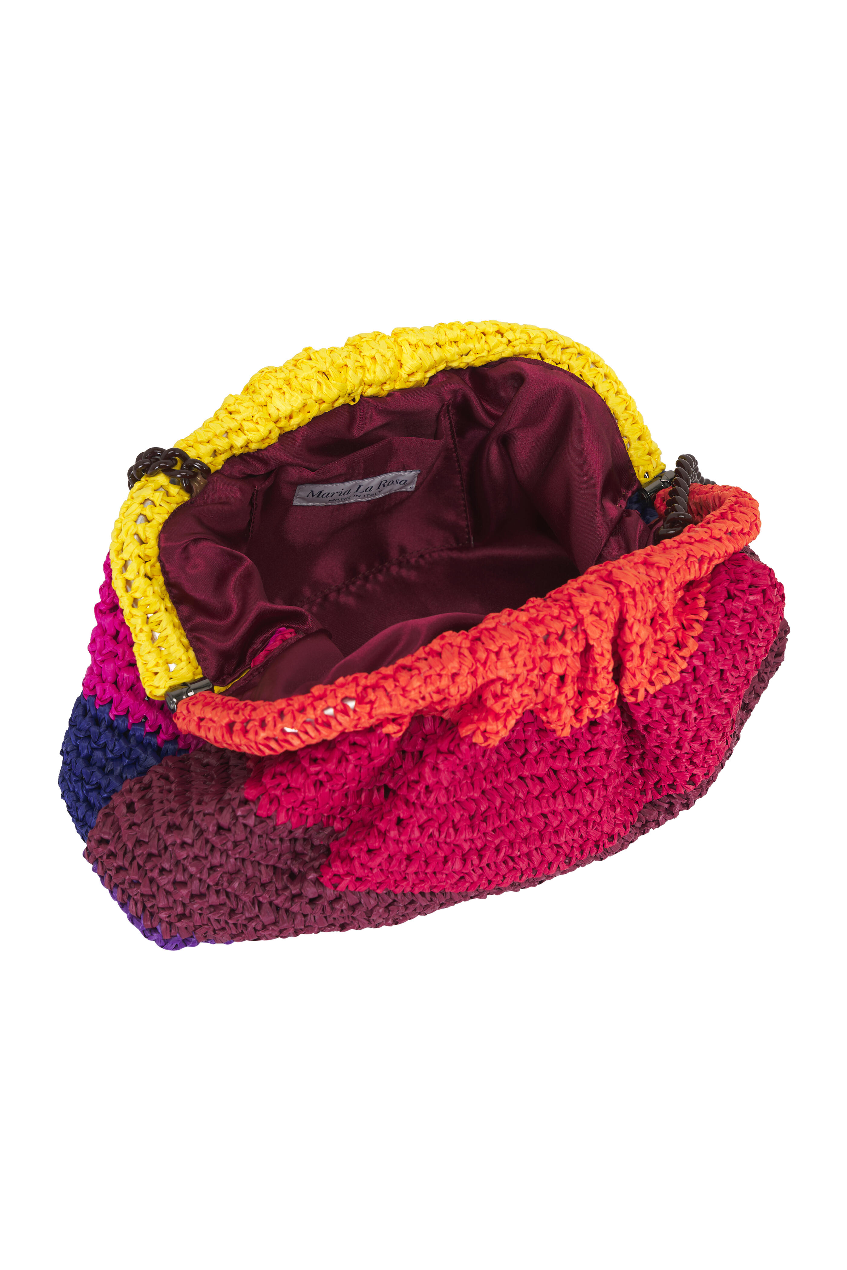 Framed top with snap closure. Made by hand with the crochet technique. Interior patch post. Made in Italy. Dimensions: 11.8" W x 7.8" H x 1.9" D. Shoulder strap drop: 39". 100% viscose raffia. 100% viscose satin lining. 100% aluminum shoulder chain.