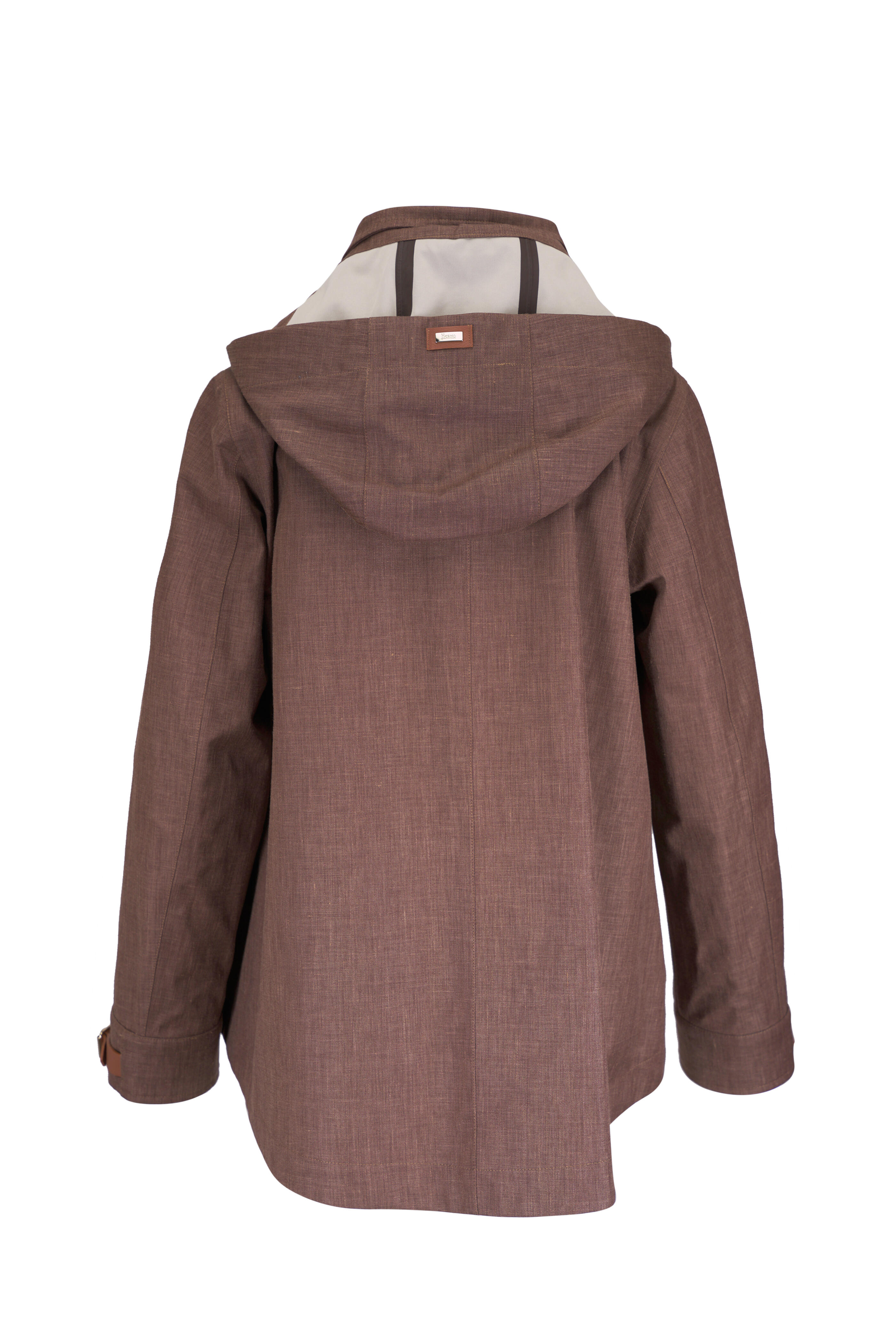 Drawstring hood; stand collar. Front concealed two-way zip; snap placket. Adjustable leather tab cuffs. Lower slip pockets. Imported with Loro Piana fabric. 50% linen, 45% wool, 5% silk. Dry clean.