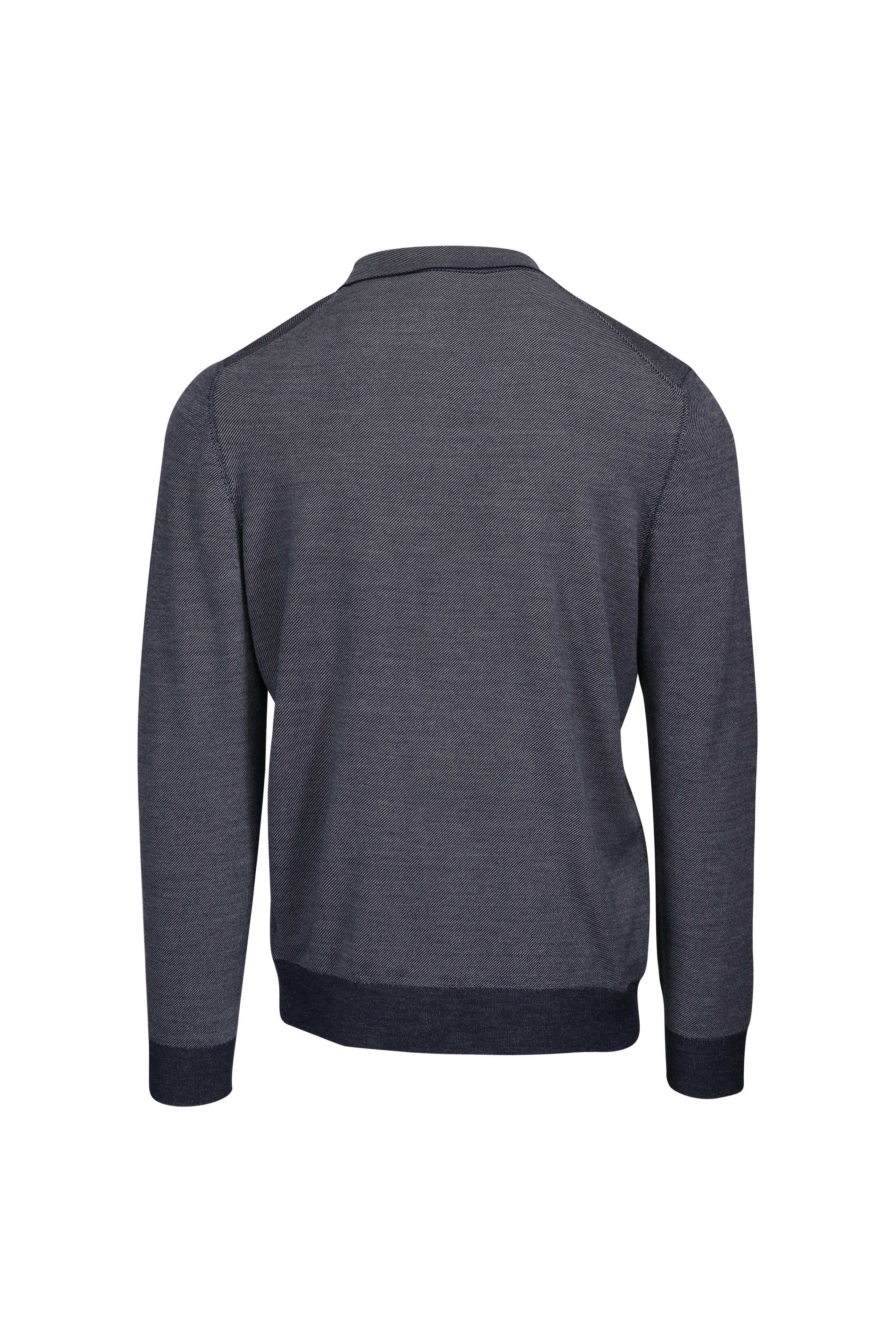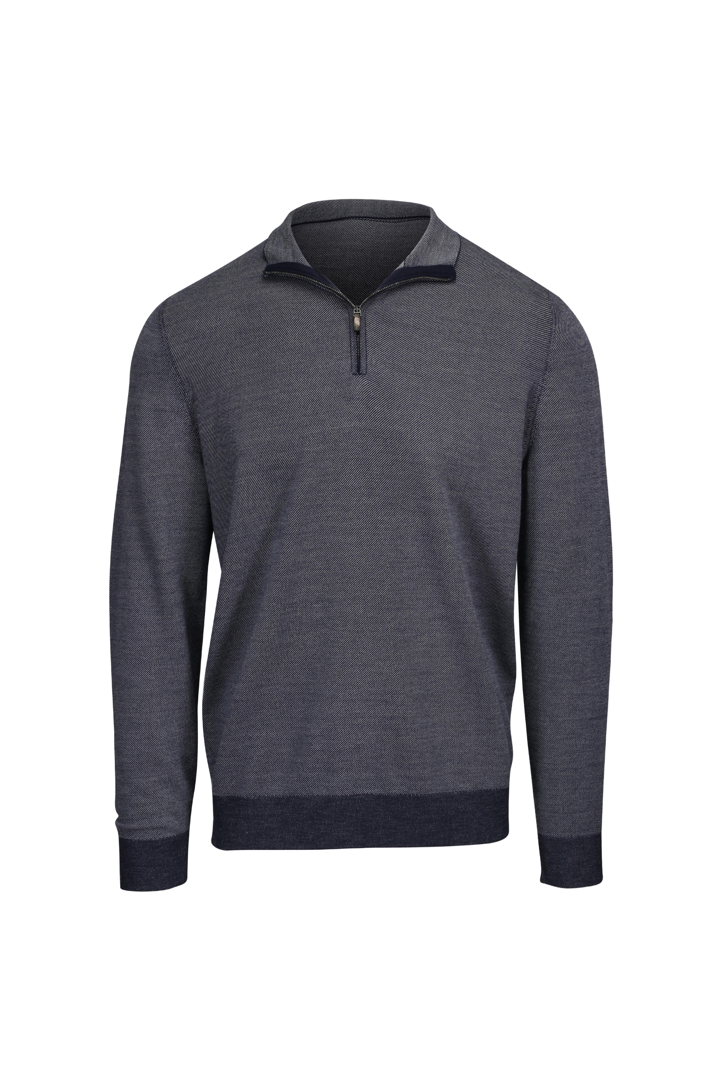 Spread collar. Quarter zip placket. Ribbed trims. Made in Italy. 100% kid wool. Dry clean.