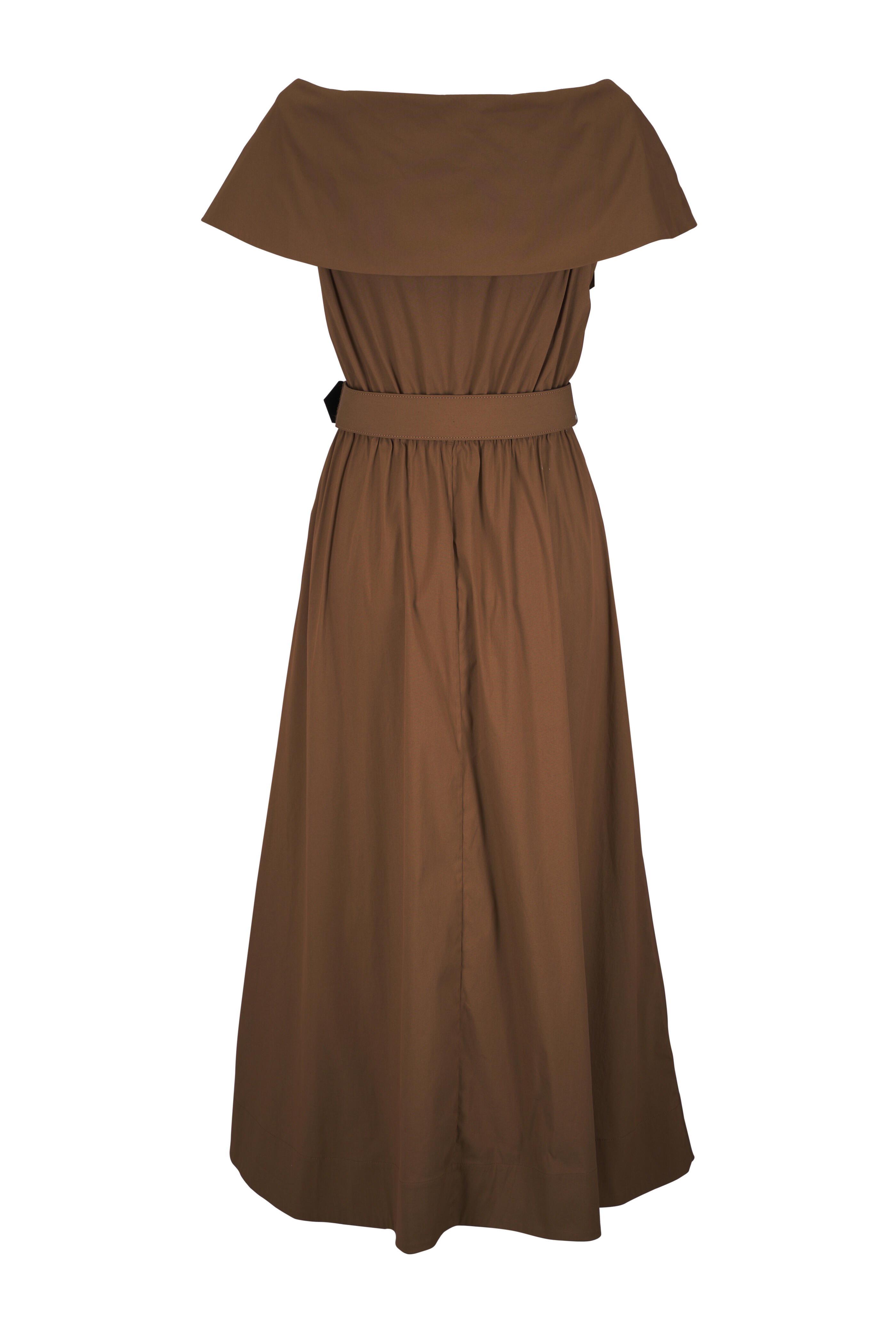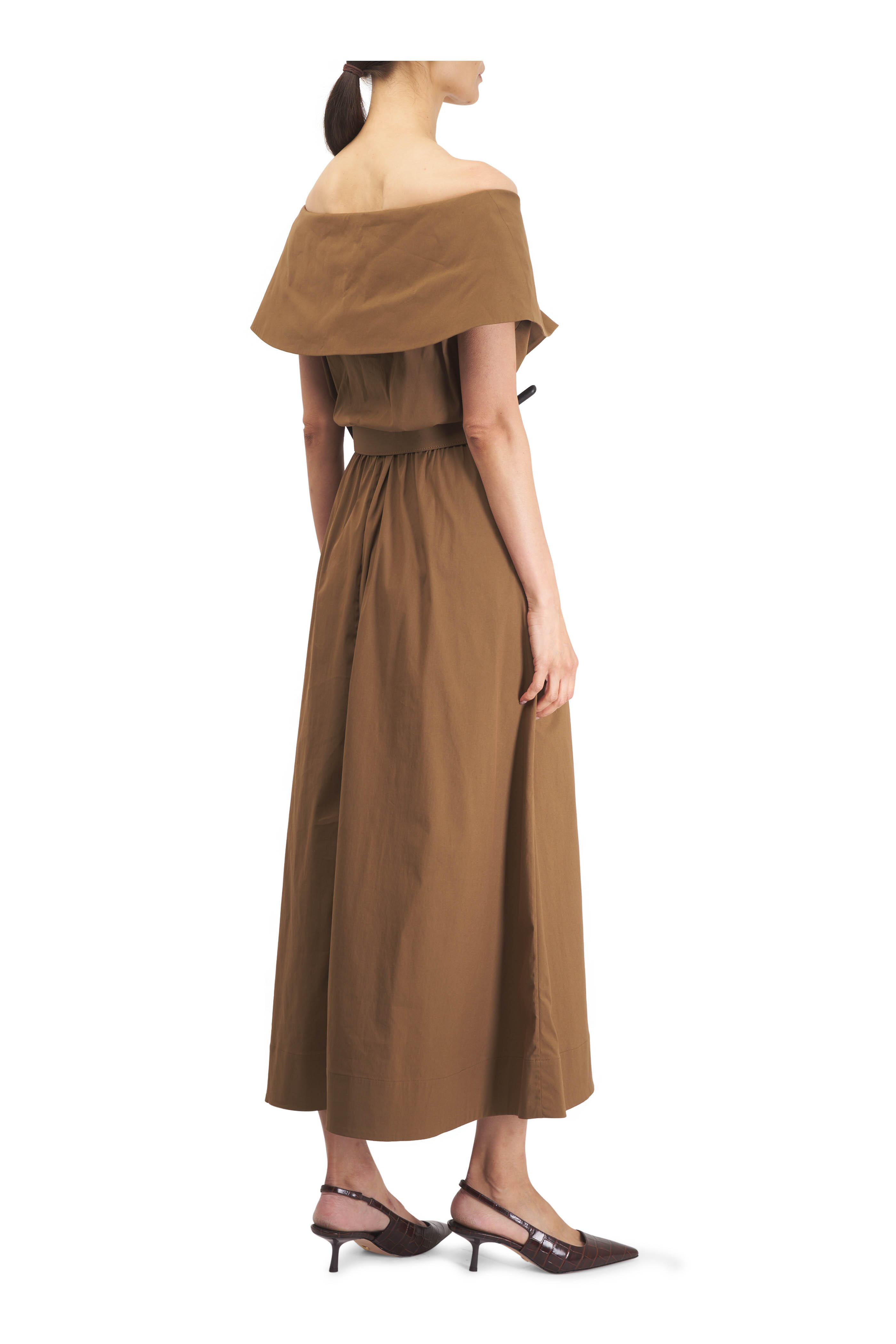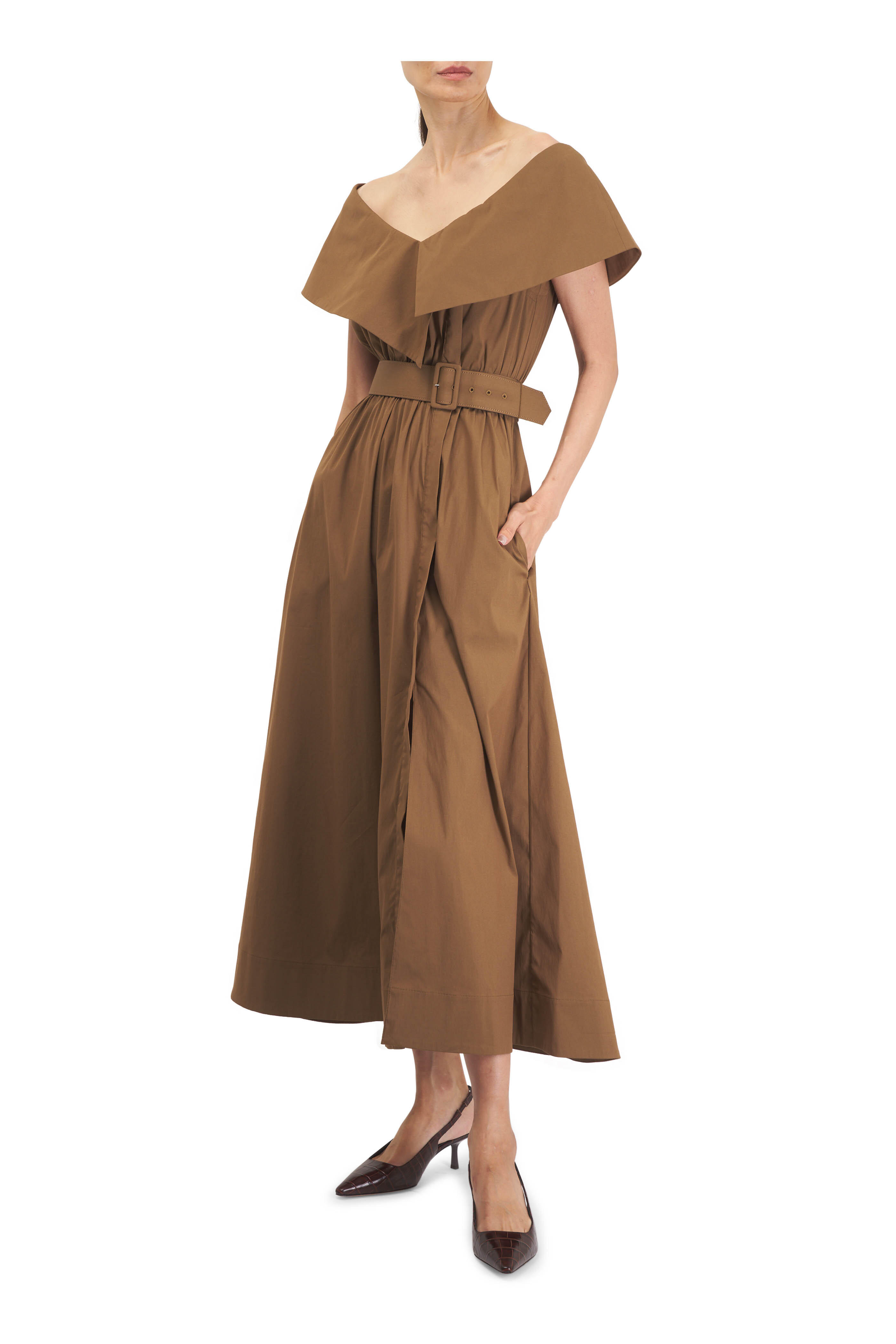 Asymmetrical cuff front neckline. Hidden elastic waistband. Belt loops; removable self covered belt with buckle. Slip-on style. Side slip pockets. Front slit. Made in the USA. Color: Camel. Approximately 52" shoulder to hem (measurements taken from size 6). 78% cotton, 18% polyester, 4% elastane. Dry clean.