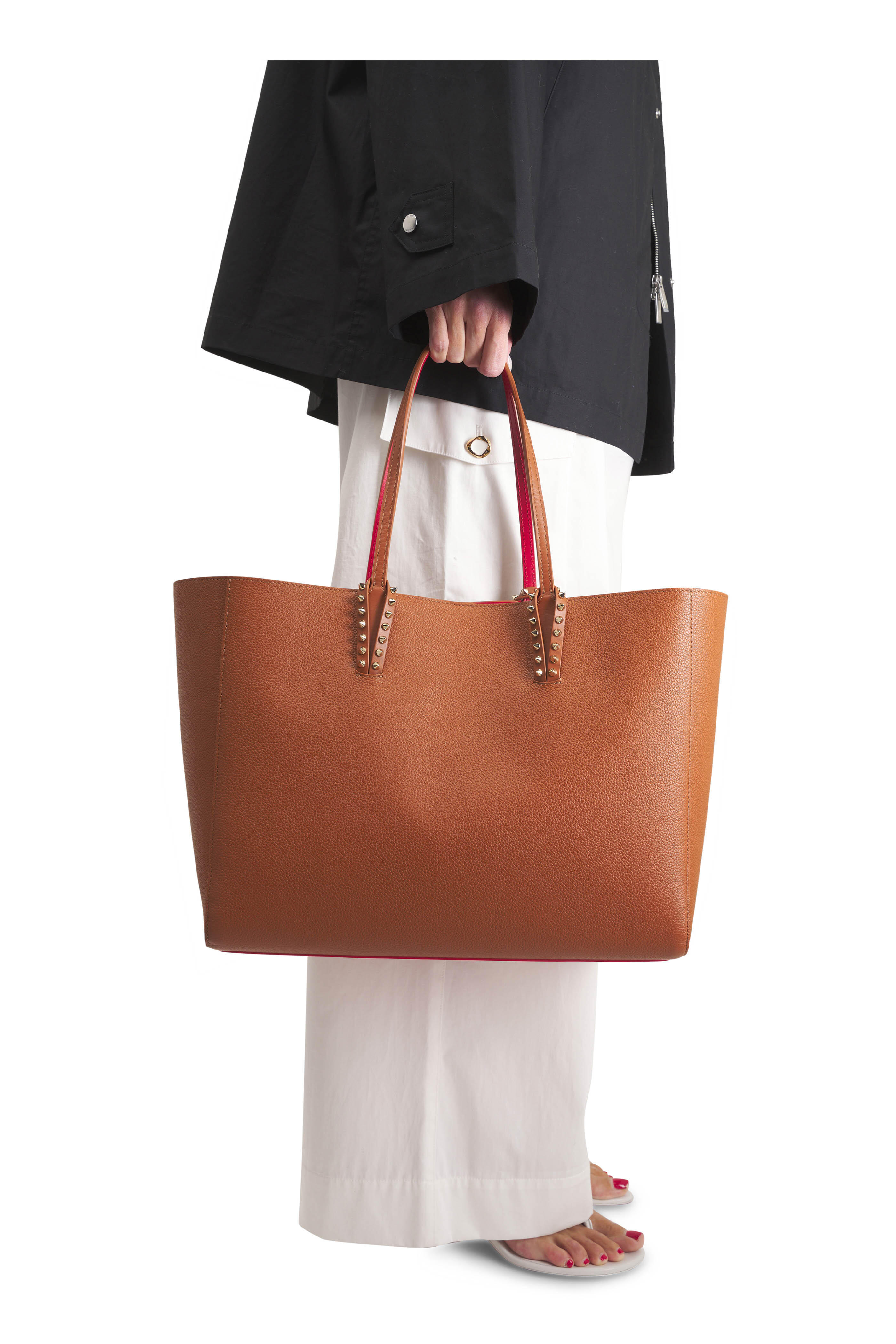 Leather. Dual-top handles. Toggle closure. Interior leashed zip pouch. Spike details at strap. Red leather lining. Signature red Louboutin base. Made in Italy. Height: 11.4". Length: 15.4". Width: 6.3". Handle drop: 8.4".