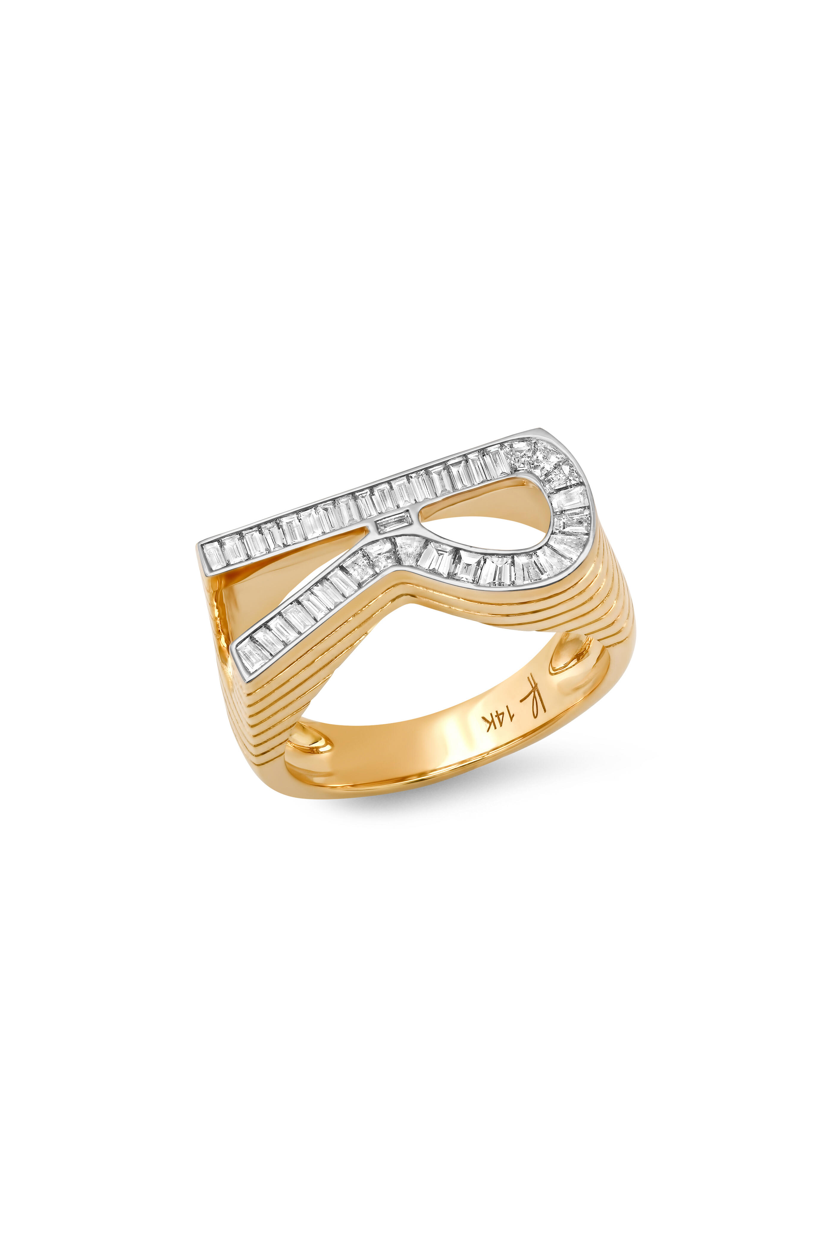 14k Yellow Gold. 0.66 ct Diamonds, varies slightly per letter. Textured Sides. Set with over 40 baguettes. Size 7. Character dimensions - 20.5 mm x 9.5 mm, width varies slightly per letter.