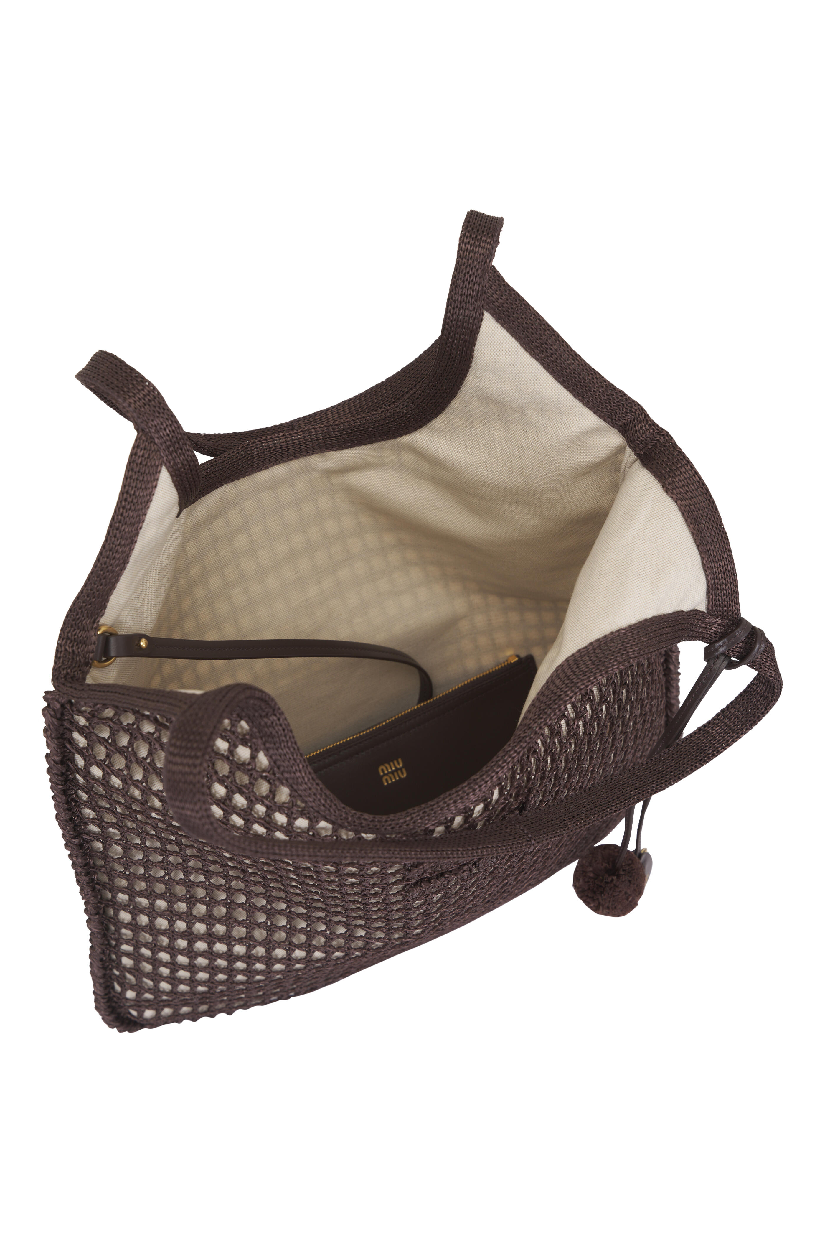 Crochet mesh outer. Canvas lining. Open top. Dual top handles. Attached logo charm. Includes zipper pouch. Imported. Dimensions: 15.7" H x 13.8" W x 0.78" D.