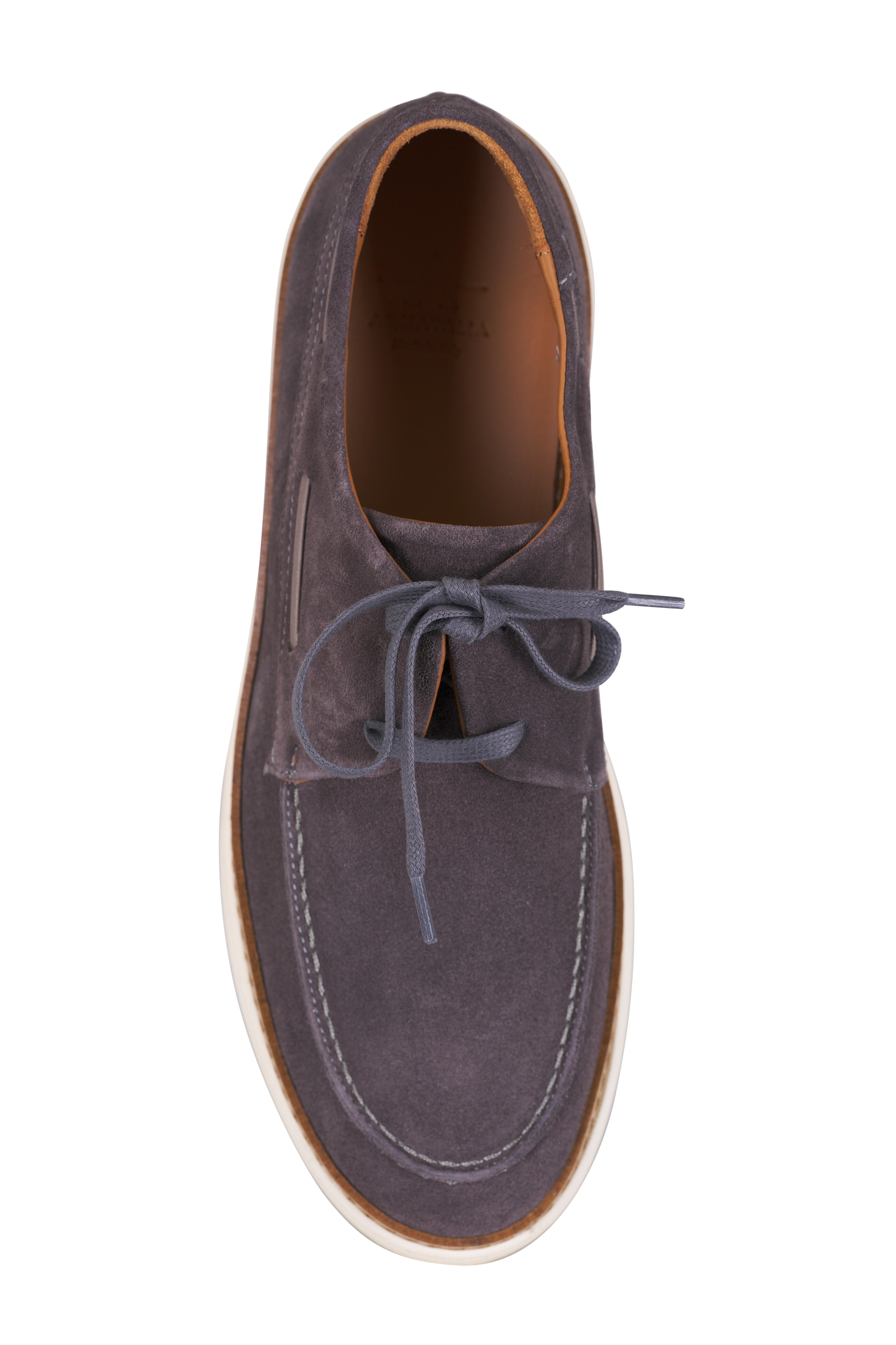 Suede upper. Round toe. Lace-up vamp. Waxed laces. Tonal stitching. Leather lining and insole. Rubber sole. Made in Italy.
