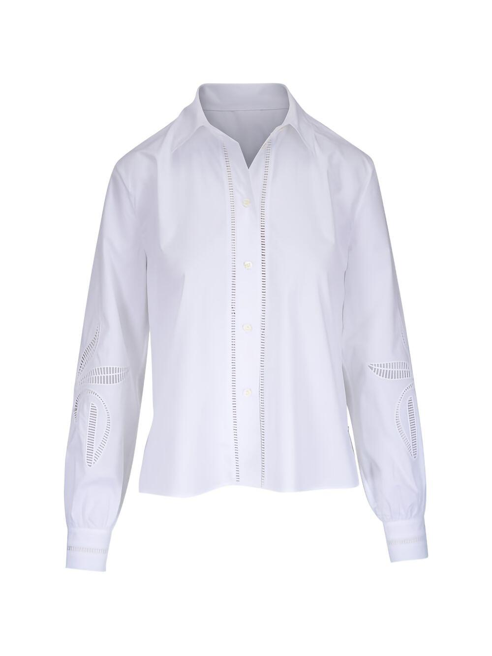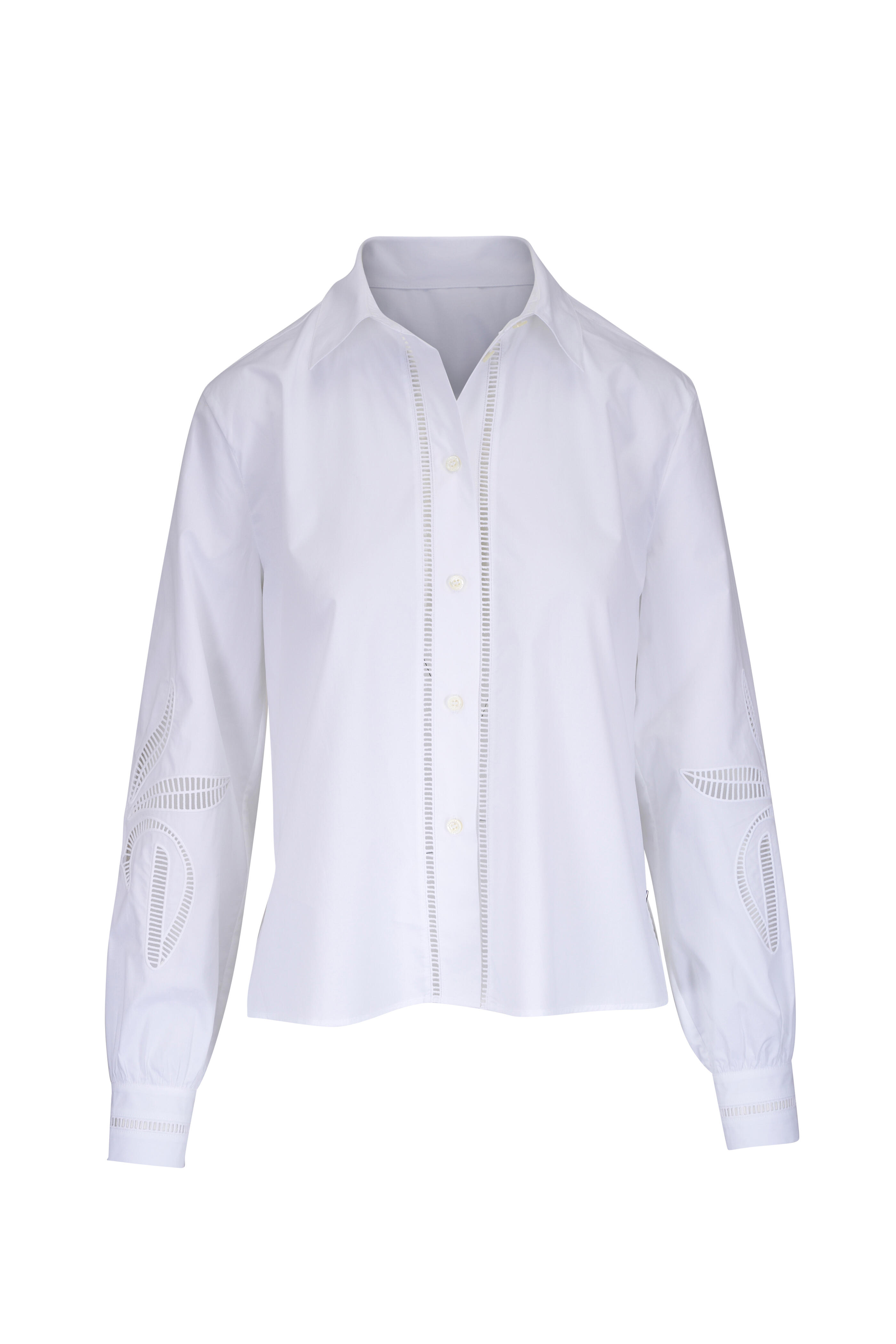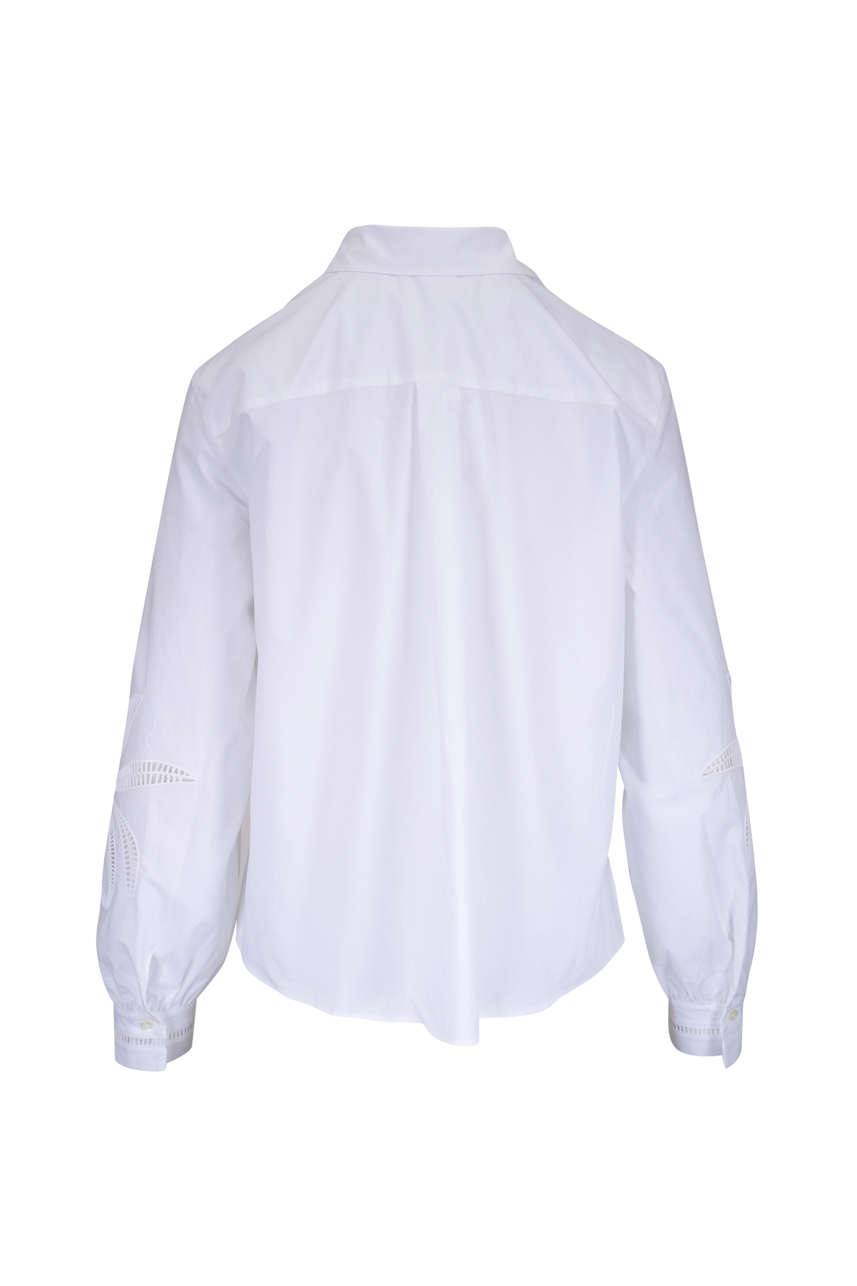 Spread collar. Front button placket. Single button cuffs. Embroidered detailing. Vented, shirttail hem. Made in Portugal. Approximately 22" shoulder to hem (measurements taken from size 6). 100% cotton. Machine wash.