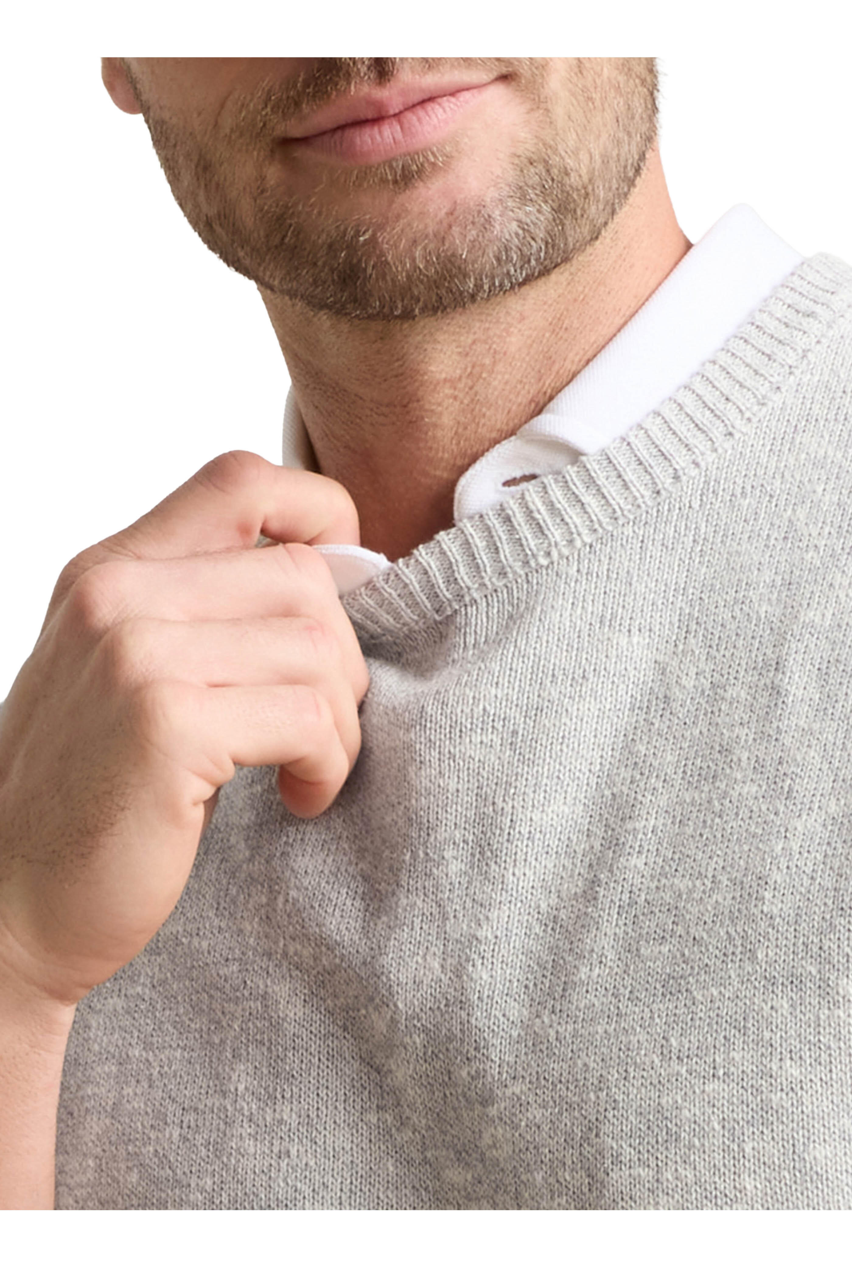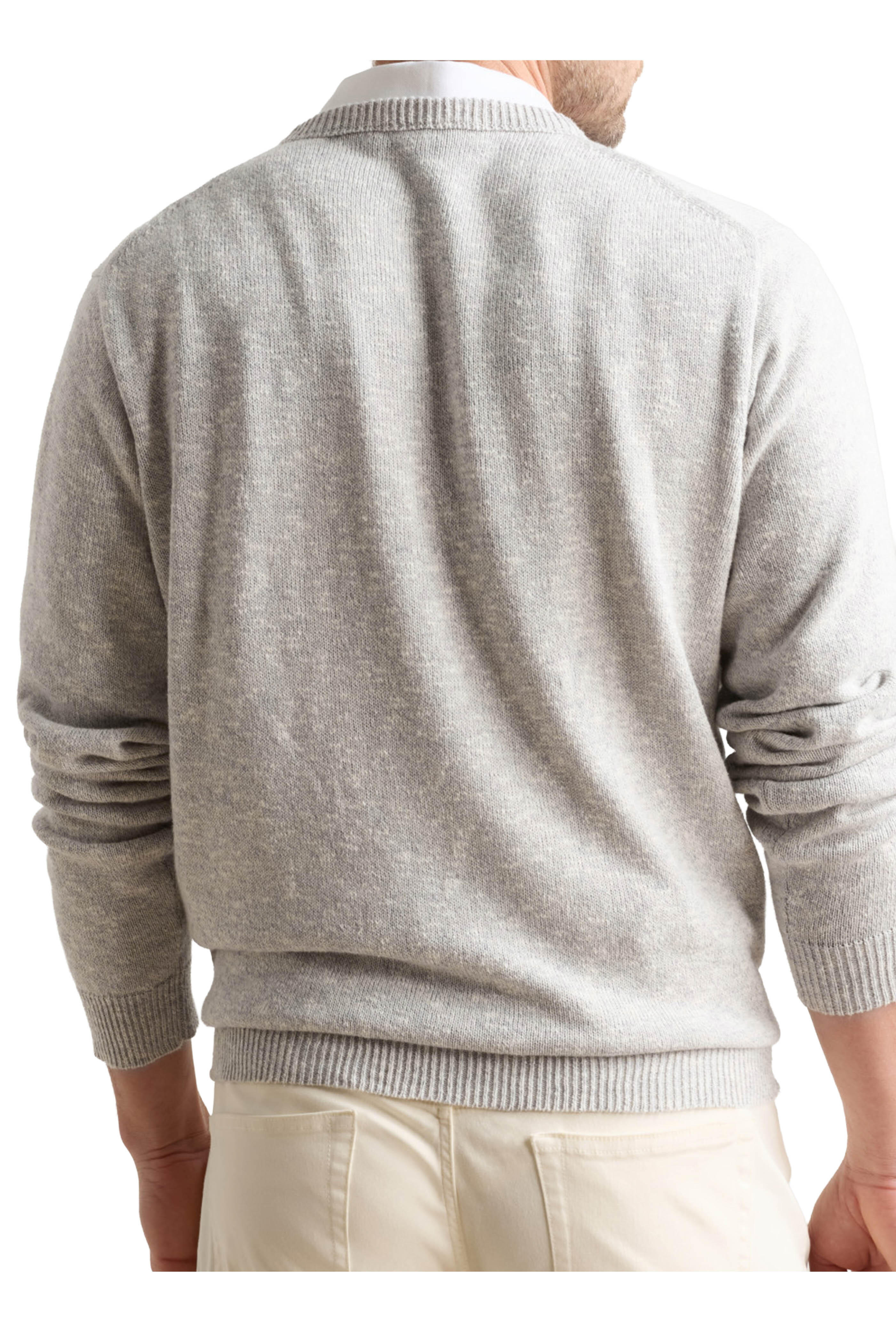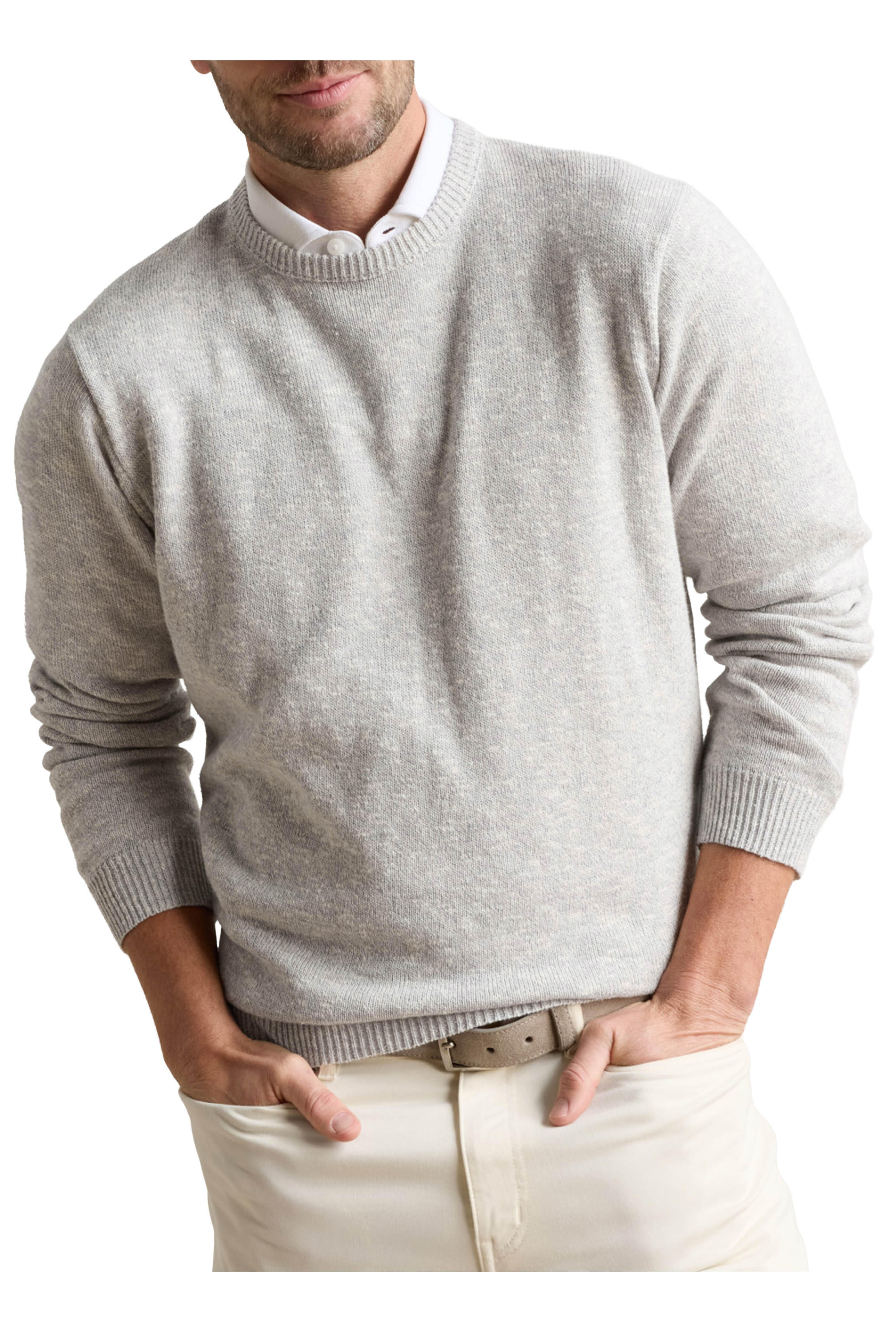 Crew neckline. Ribbed trims. Imported. 60% cotton, 24% linen, 12% silk, 4% cashmere. Hand wash.