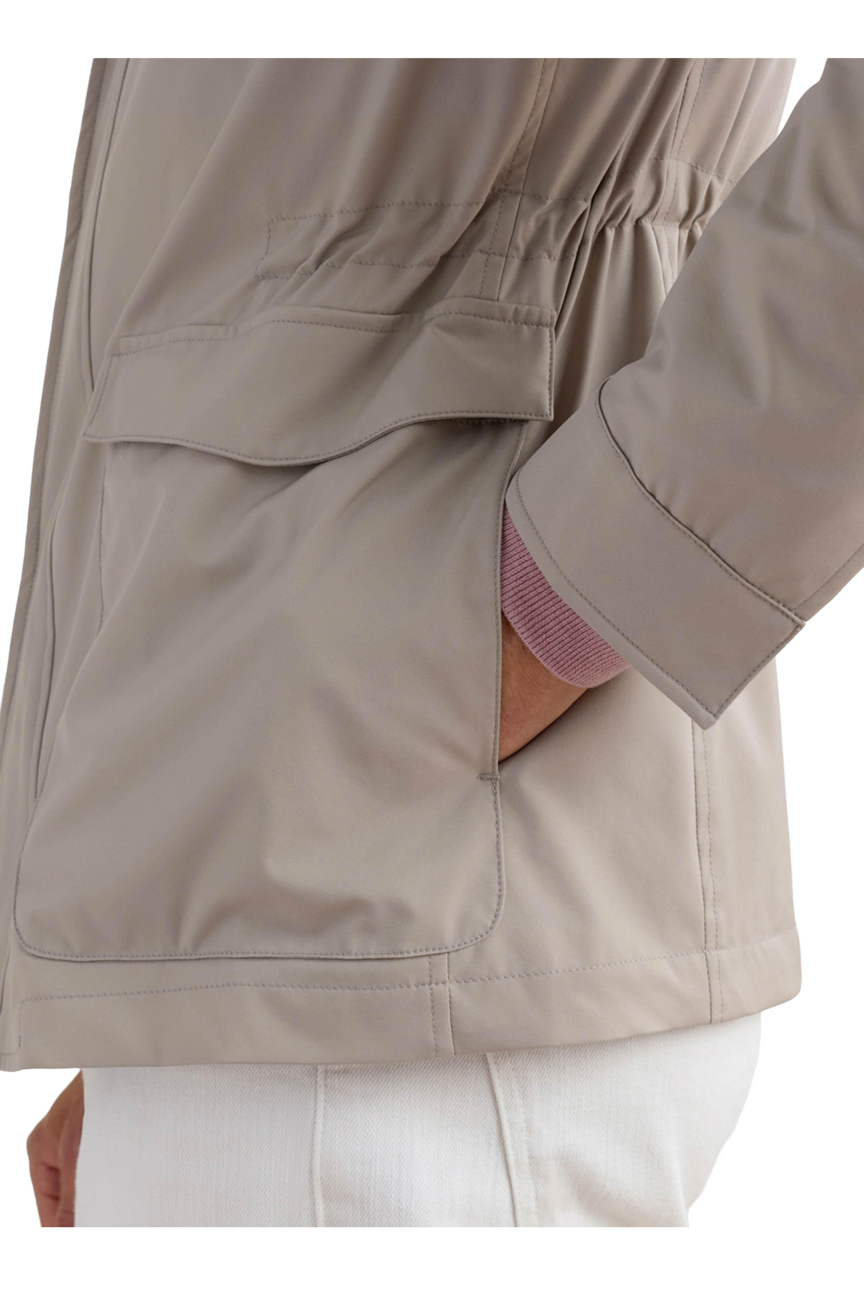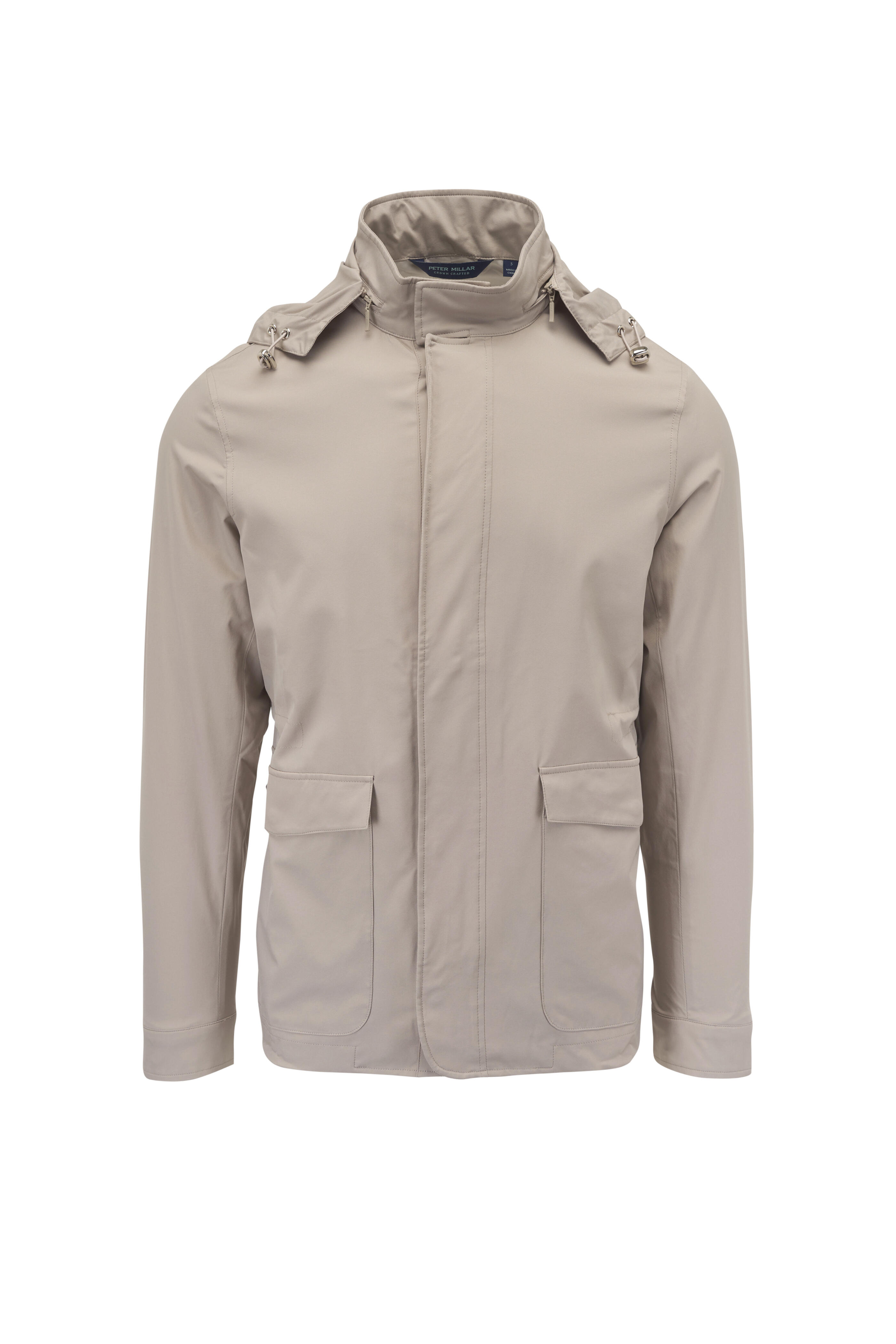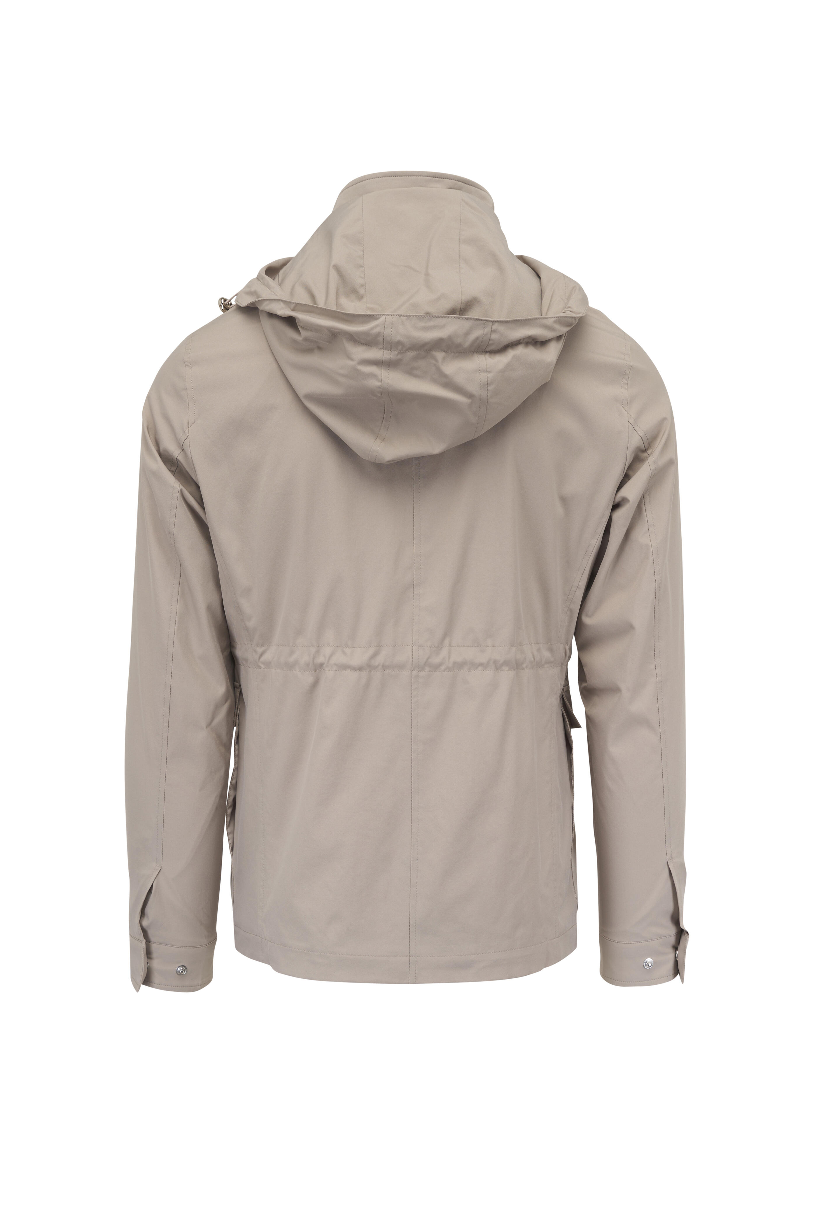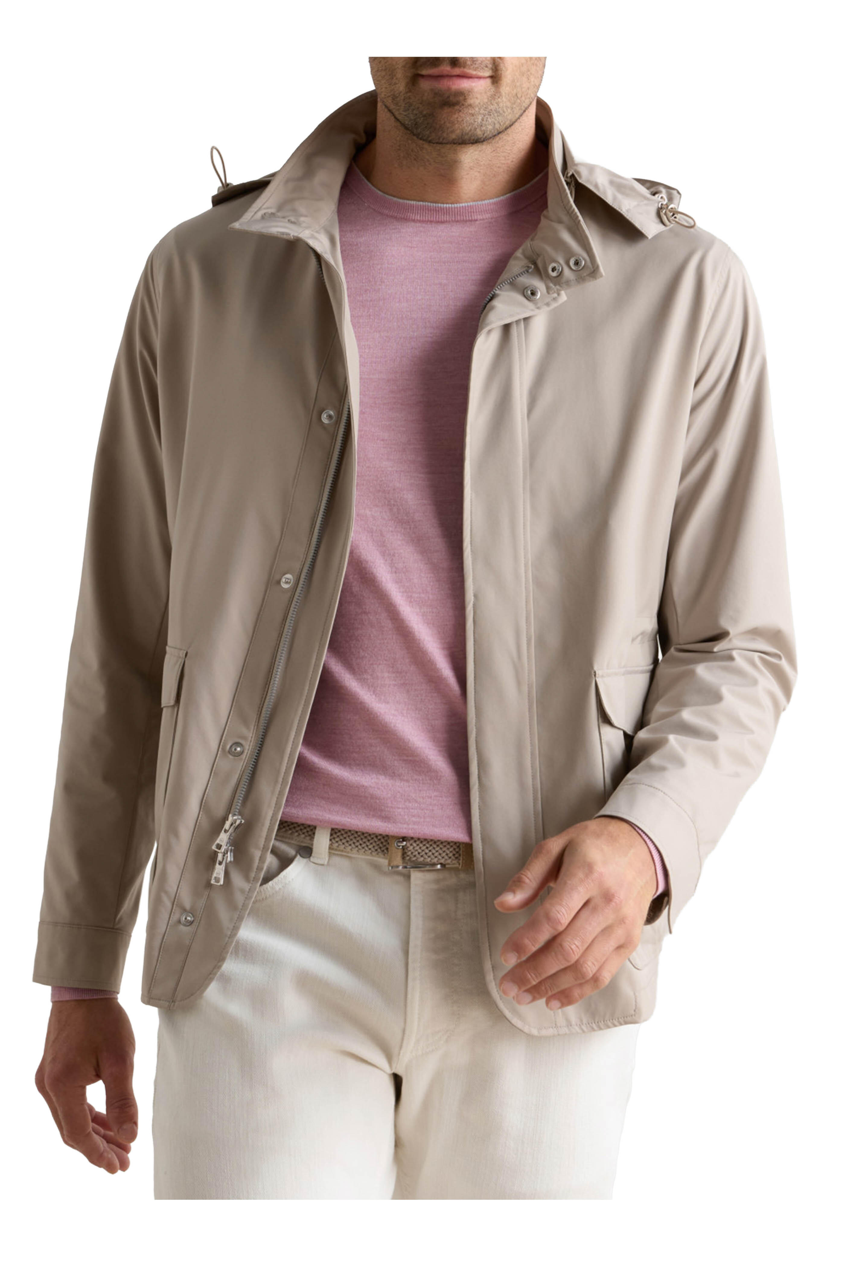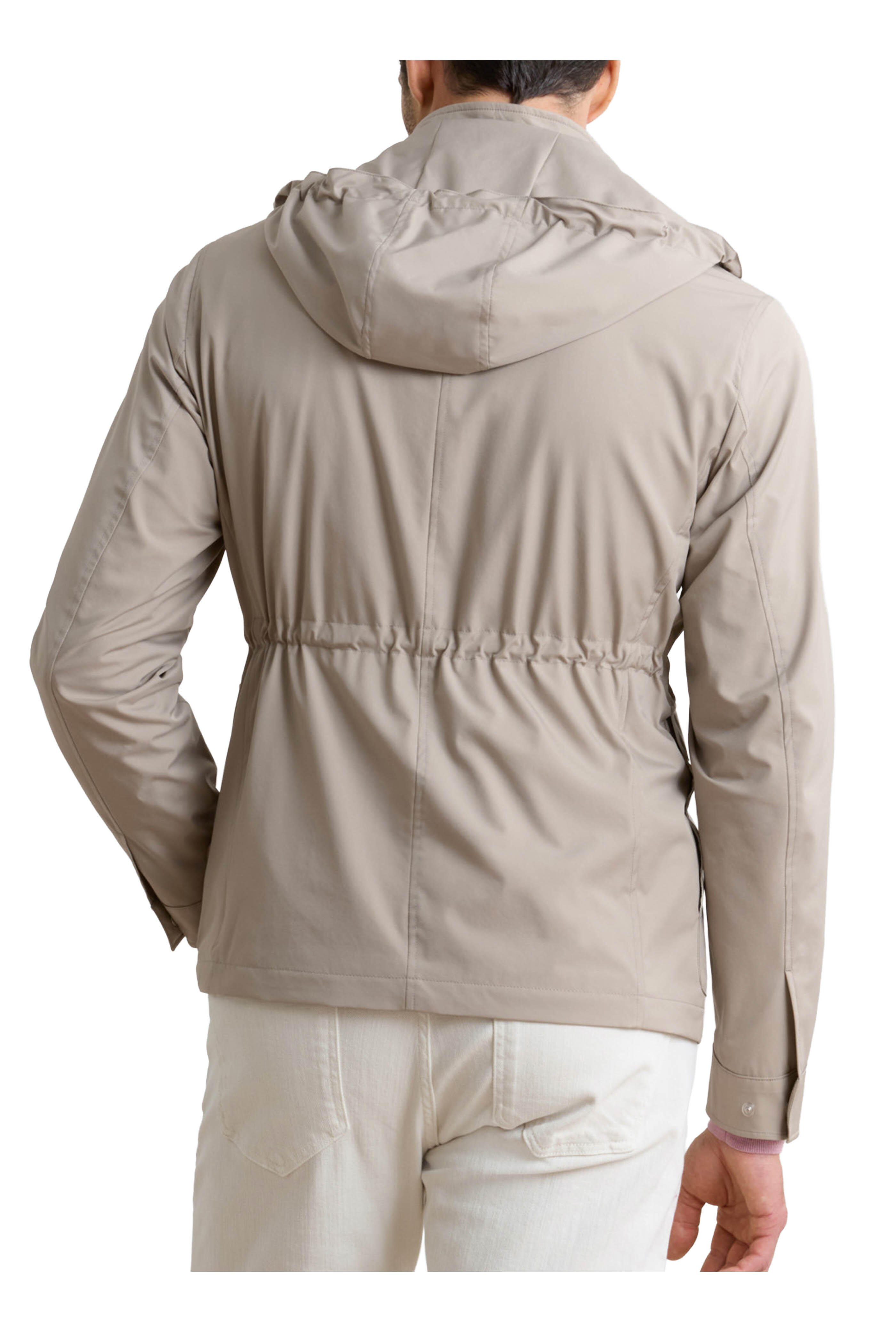 Stand collar. Removable; drawstring hood. Concealed two-way front zip with snaps. Lower snap pockets; internal pockets. Single button square cuffs. Imported. Wind and water-resistant. Tailored fit. 93% nylon, 7% PU membrane. Machine wash.