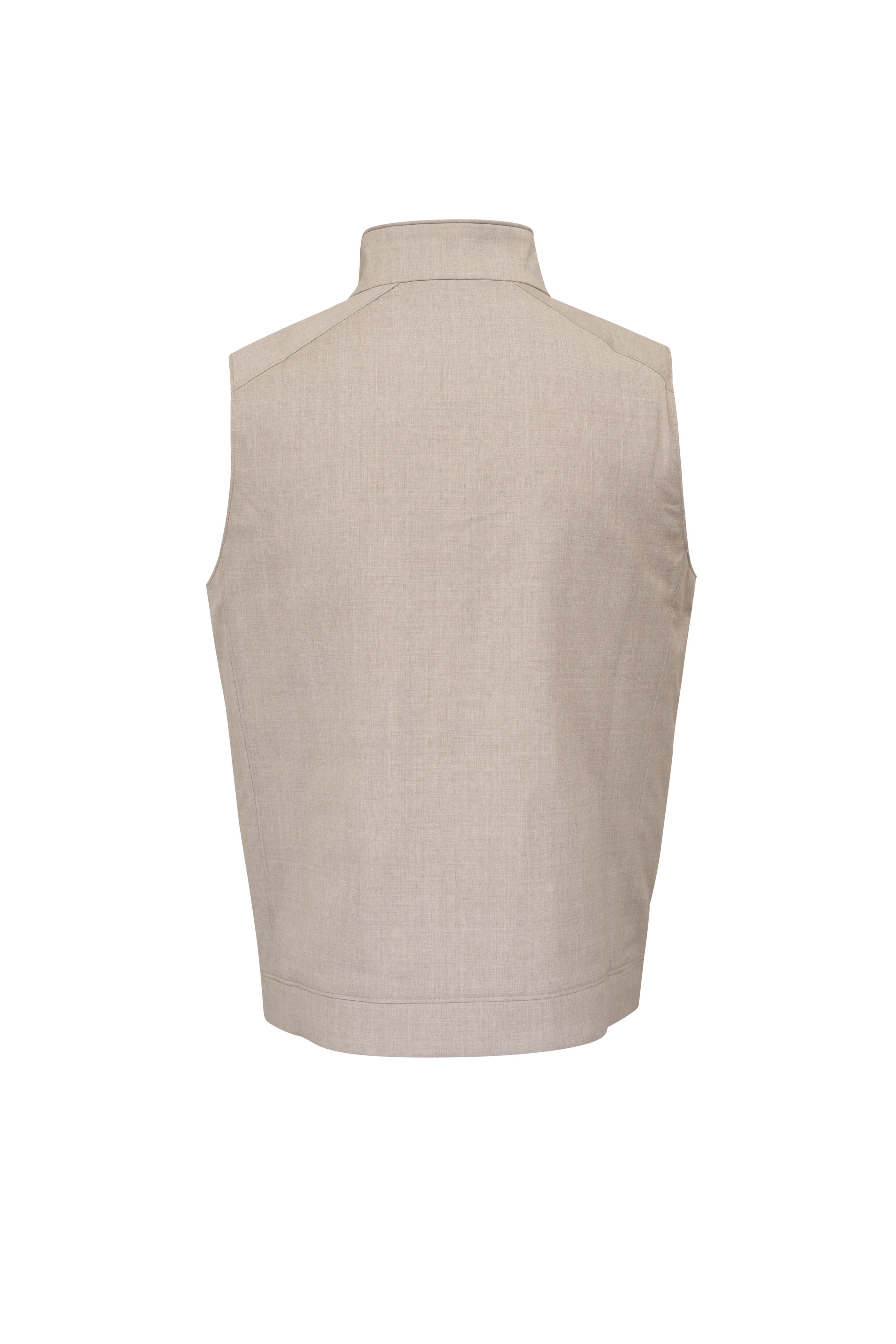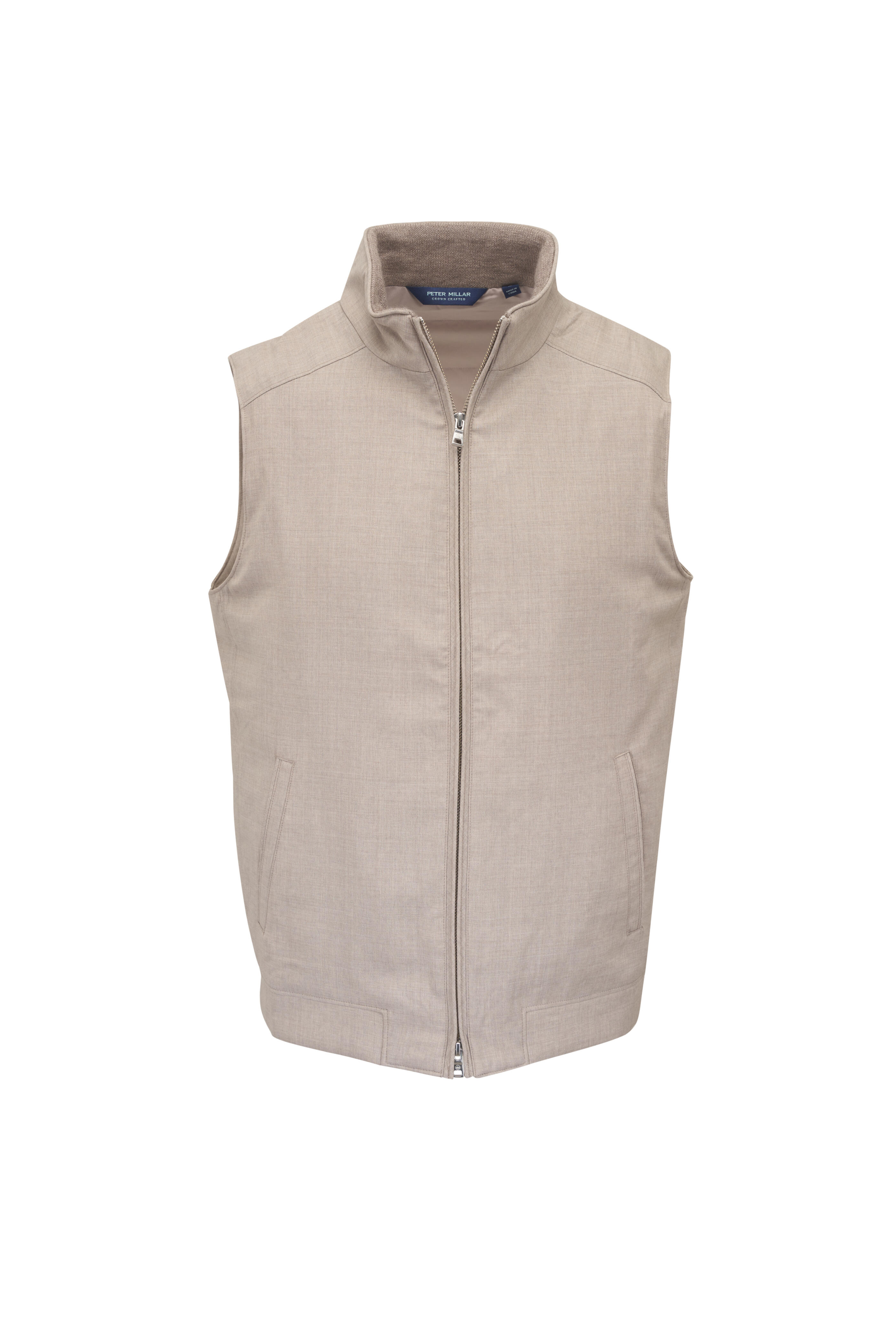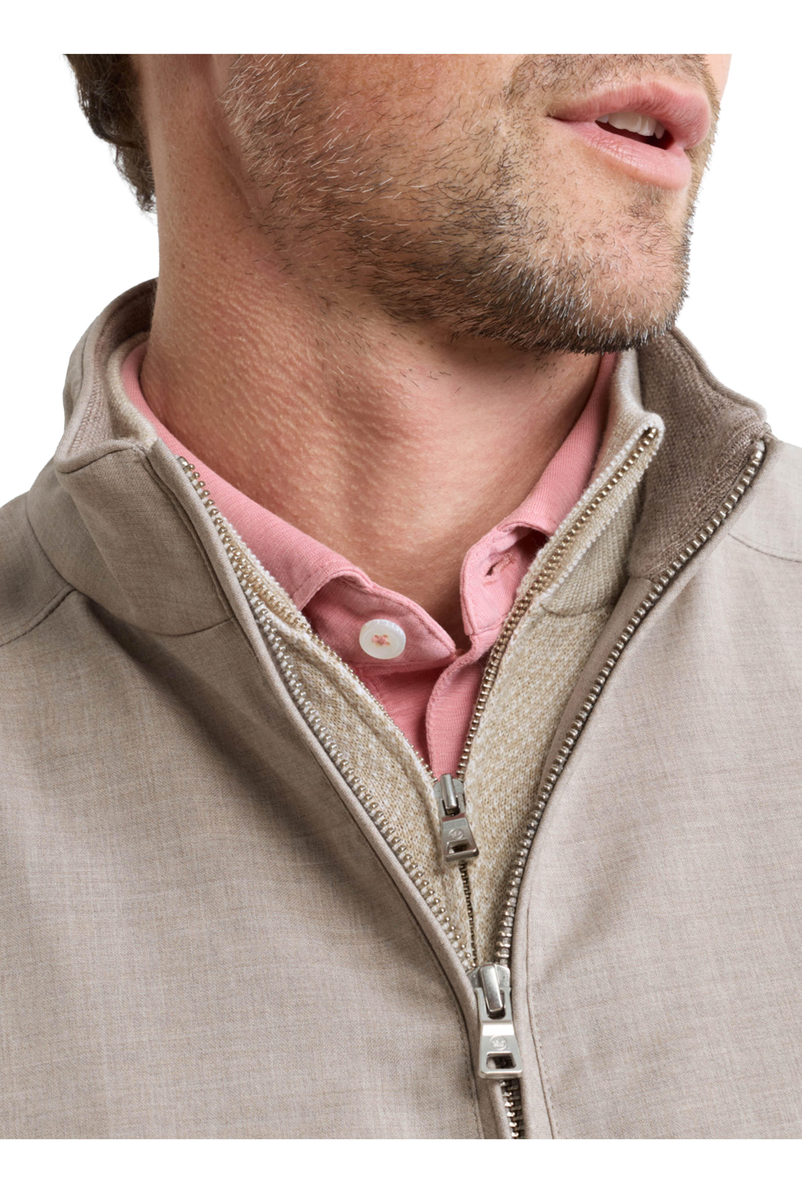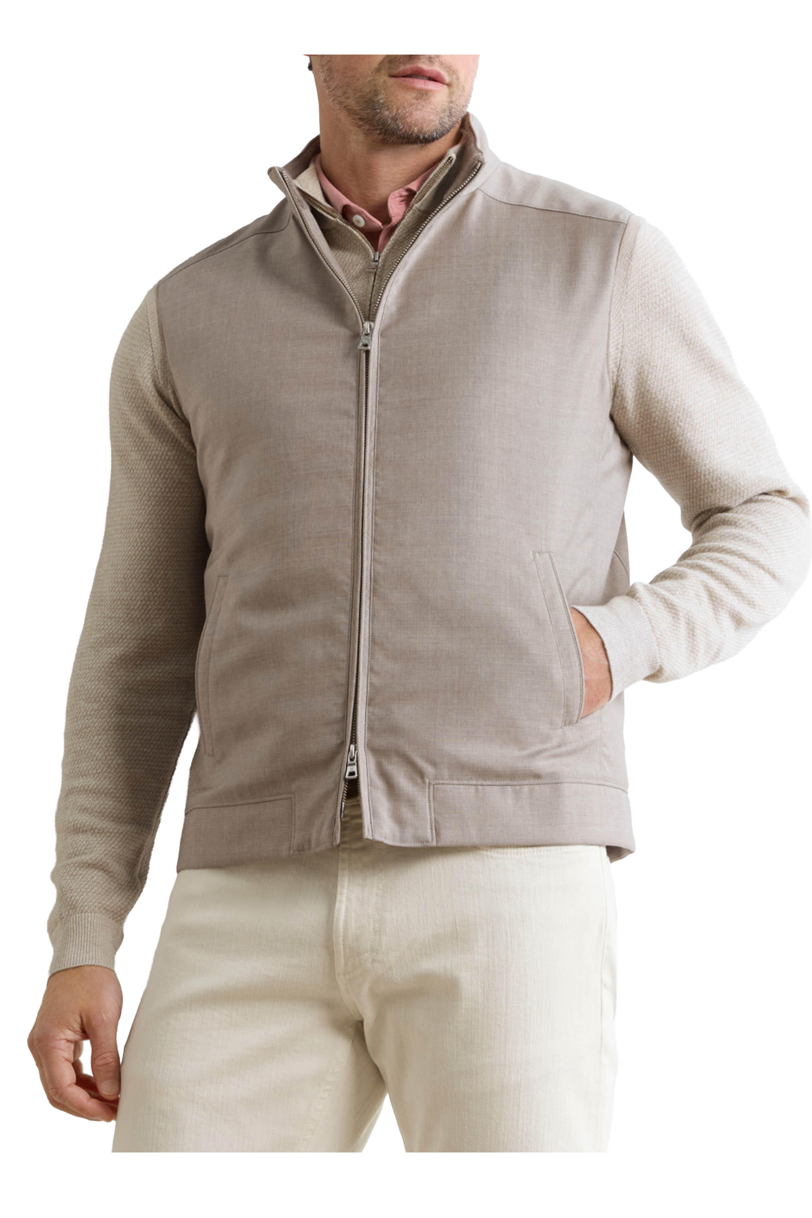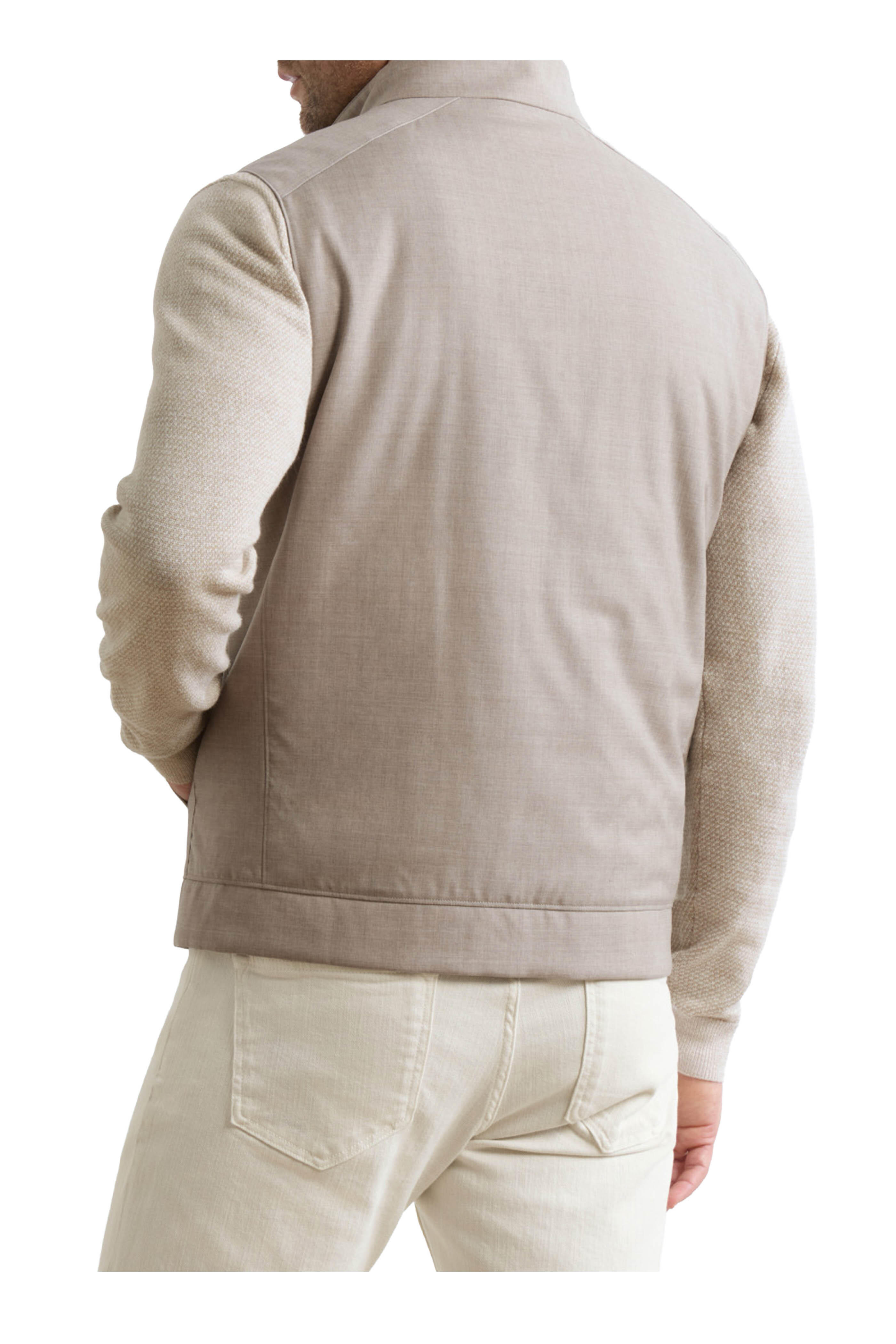 Stand collar. Two-way zip placket. Lower slip pockets. Water resistant. Imported. Tailored fit. 100% wool. Dry clean.