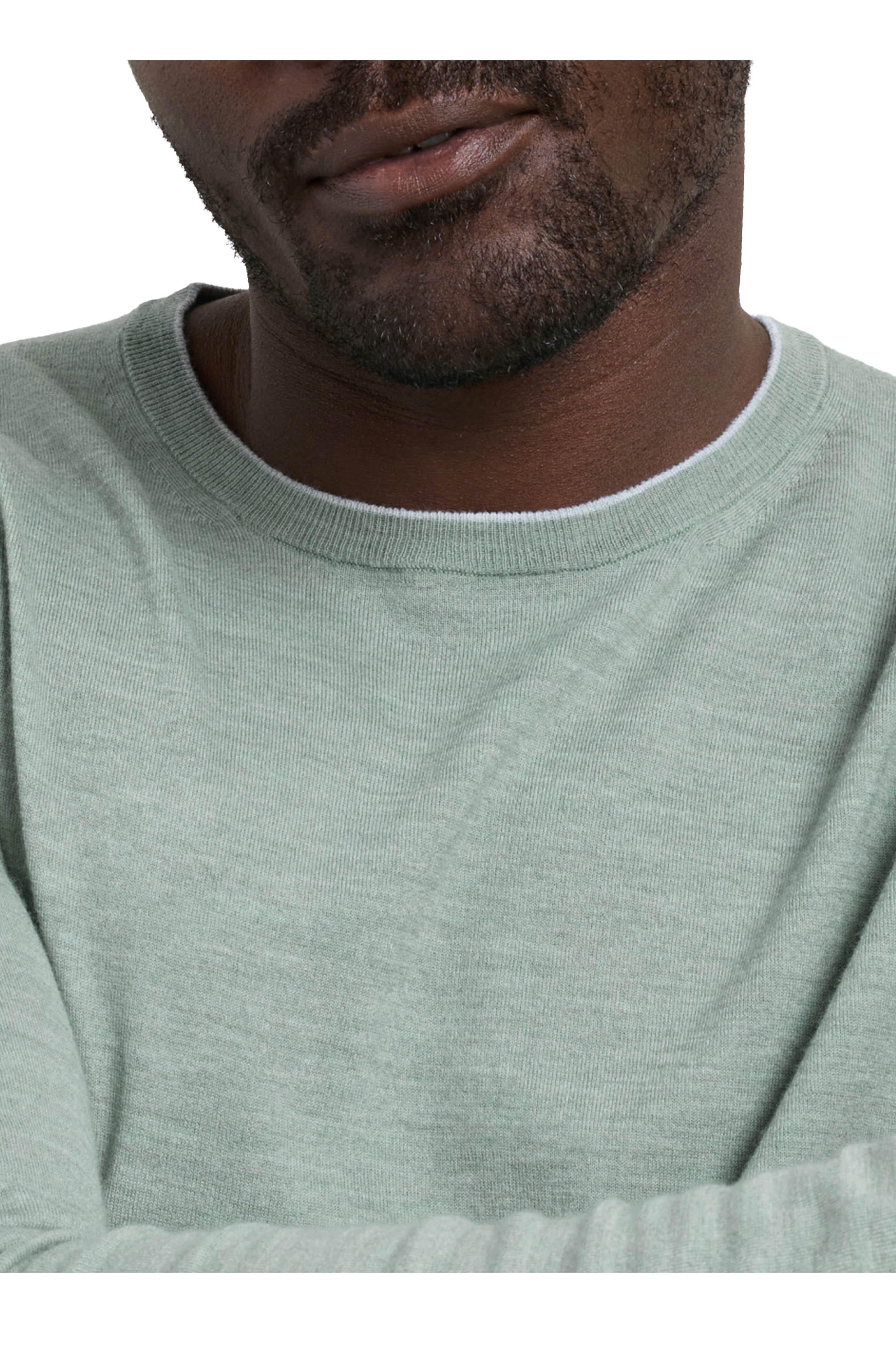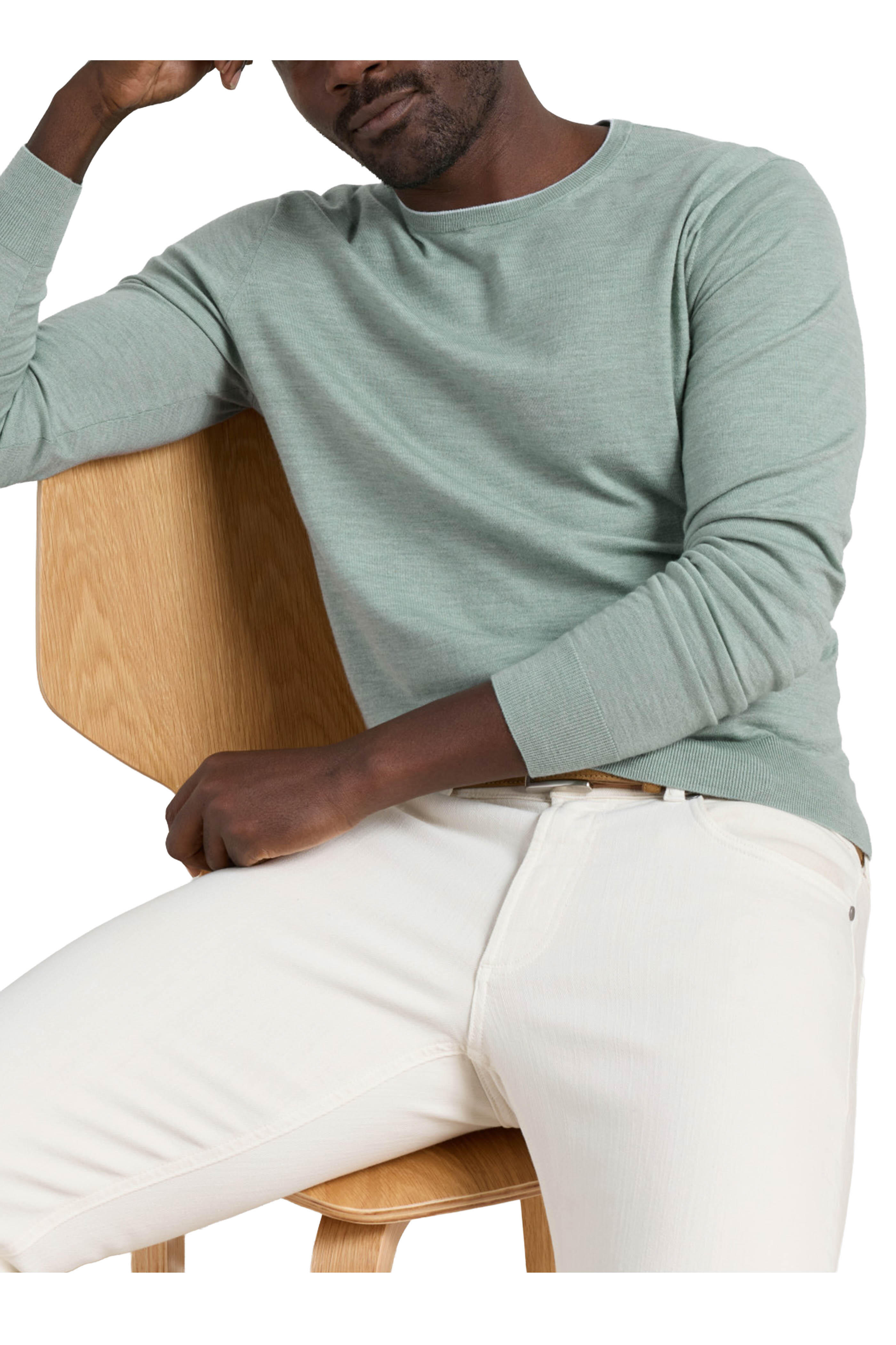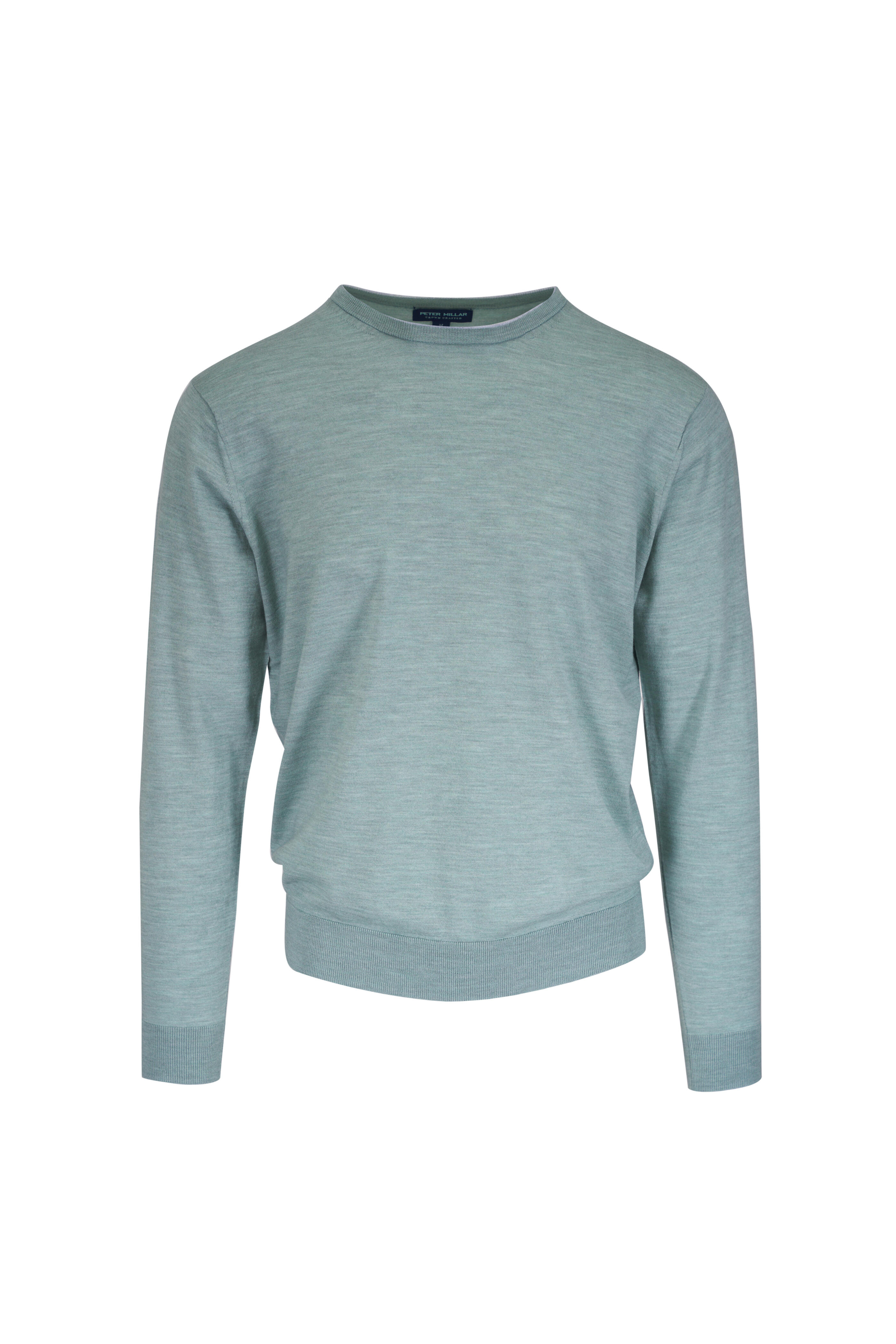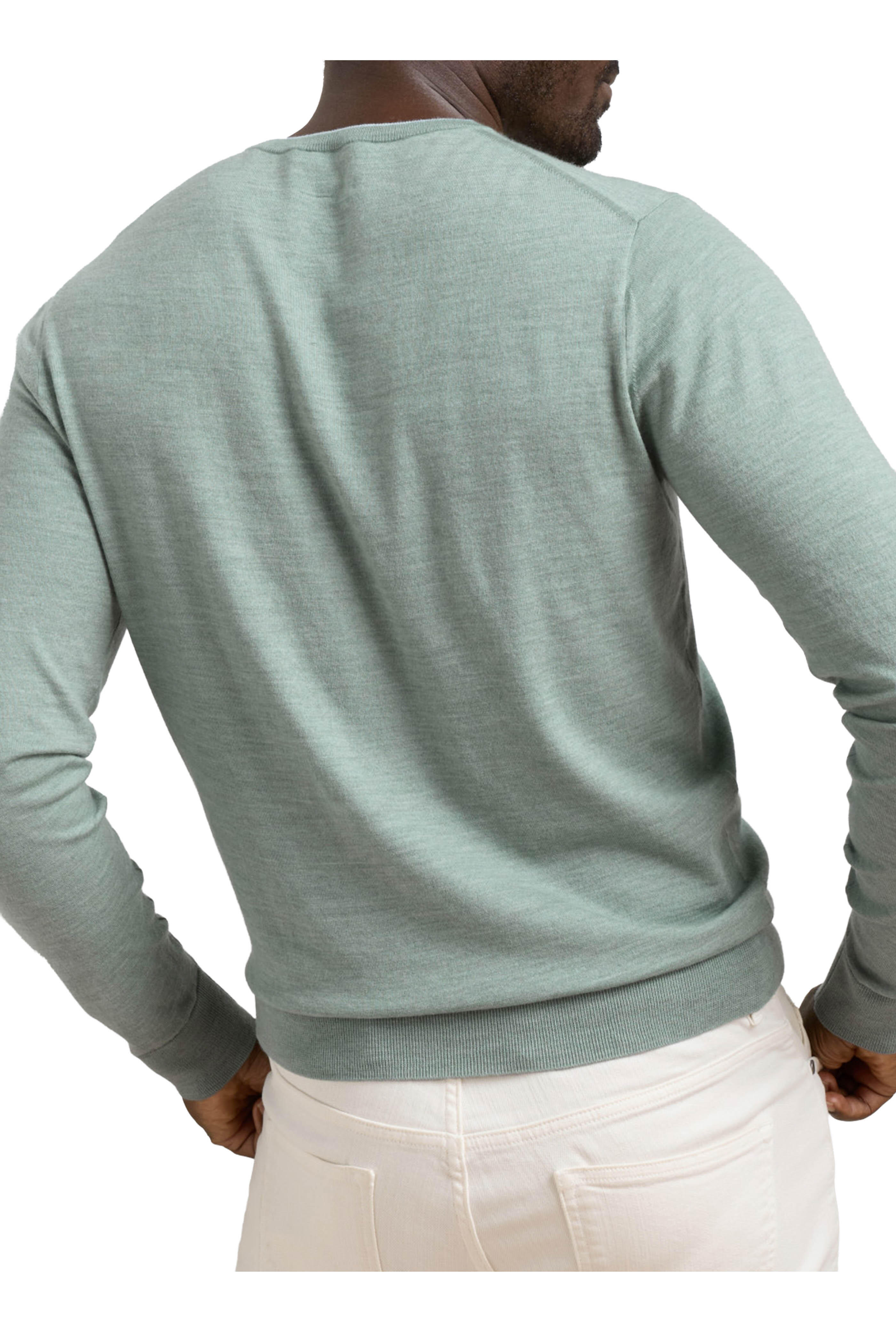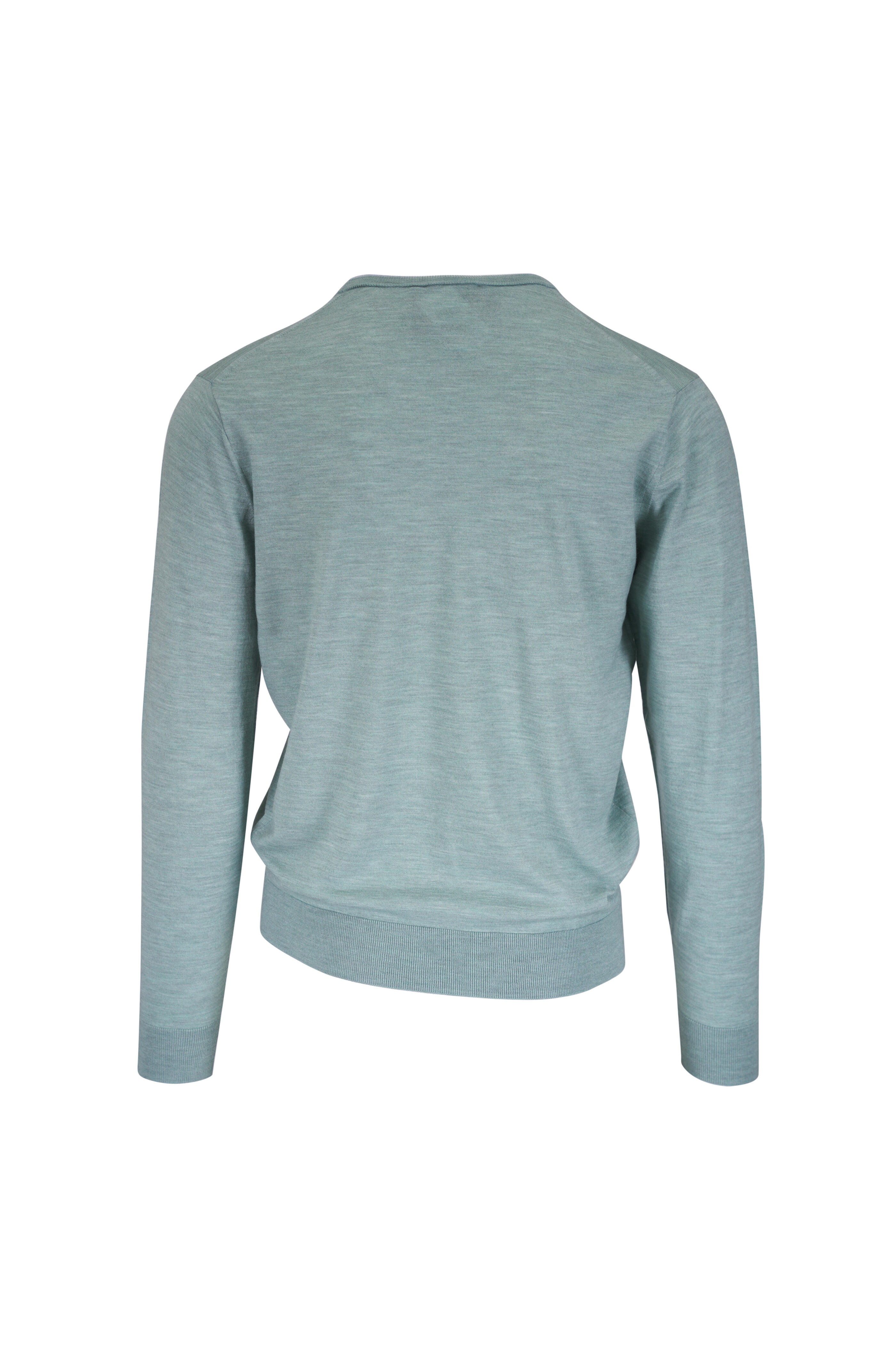Crew neckline. Ribbed knit trim. Imported. Tailored fit. 93% merino wool, 7% polyester. Dry clean.