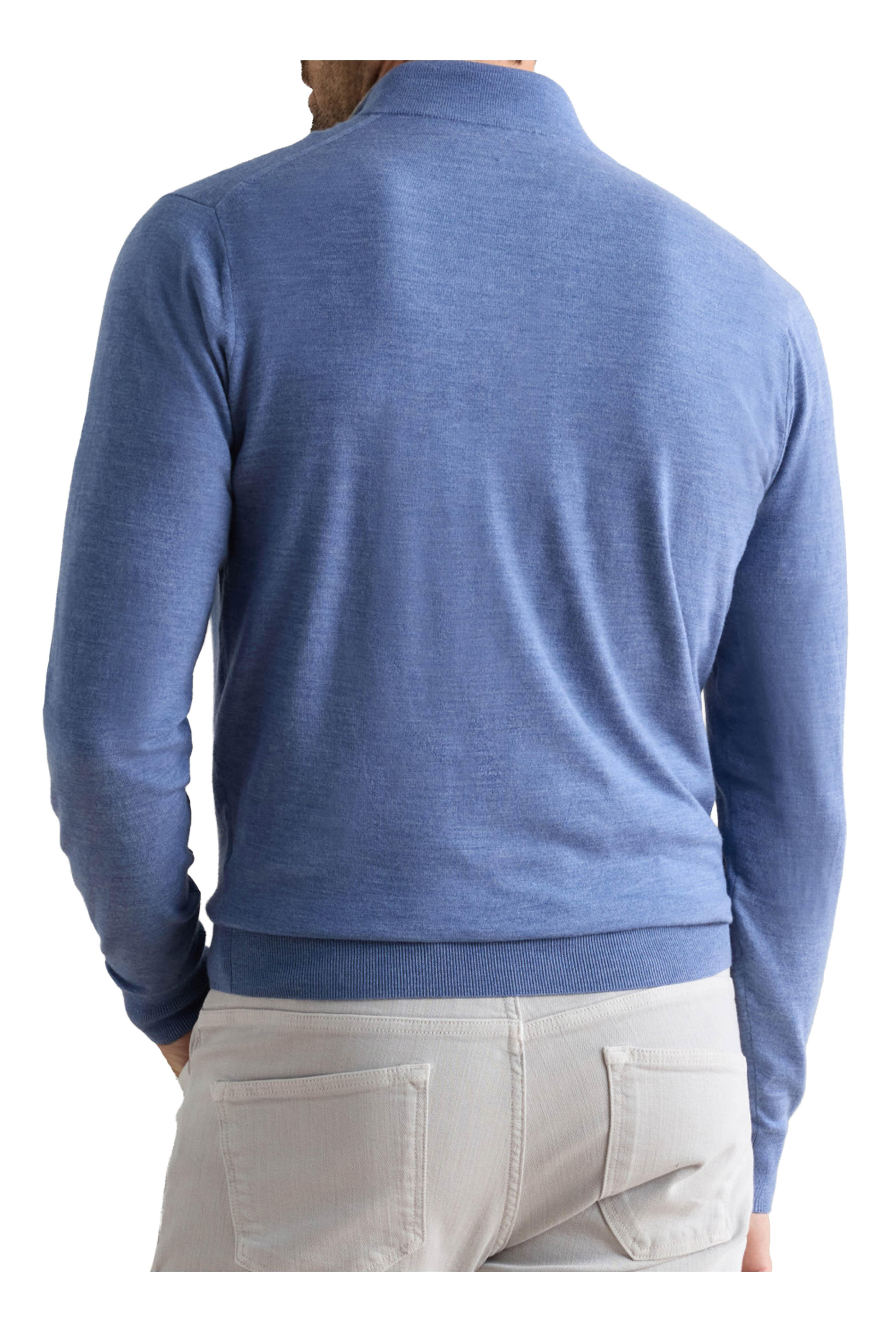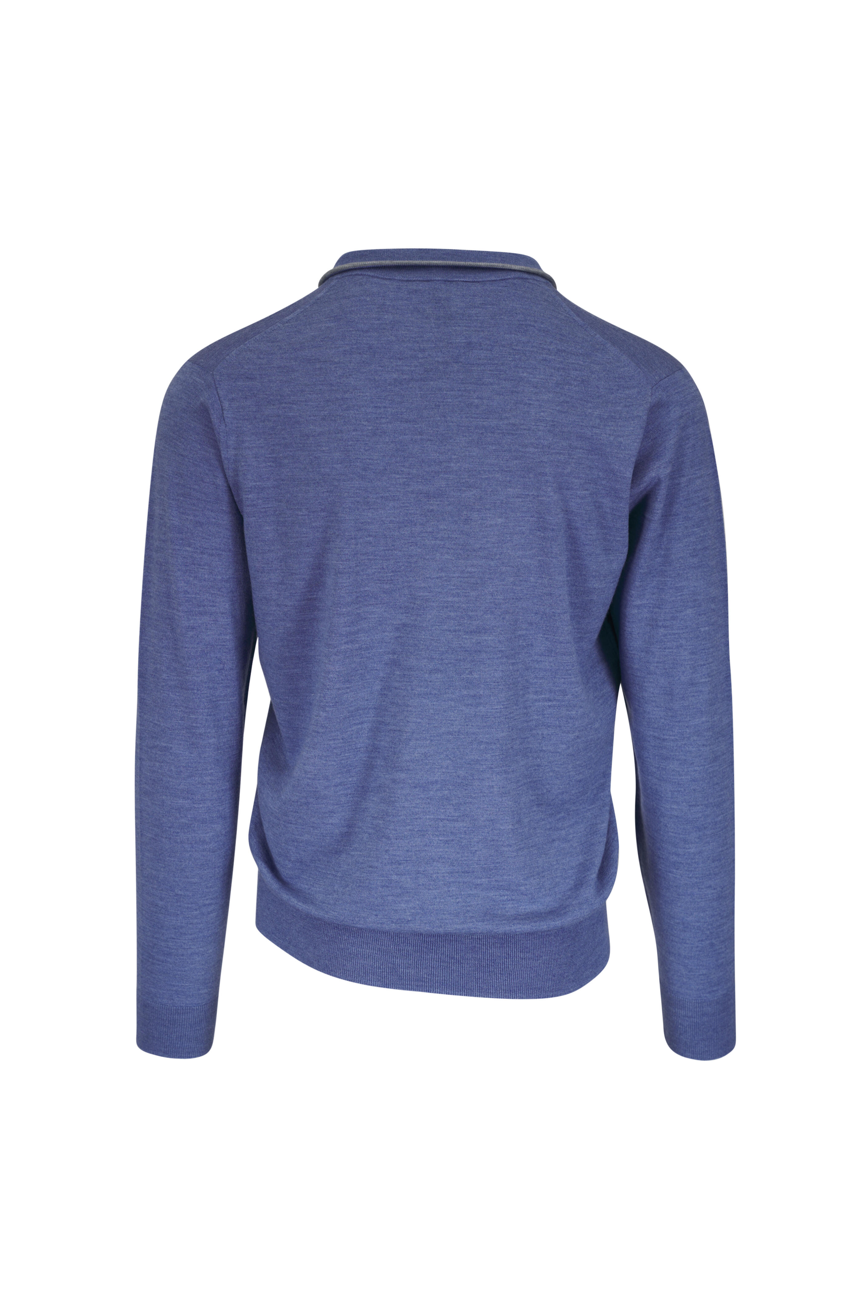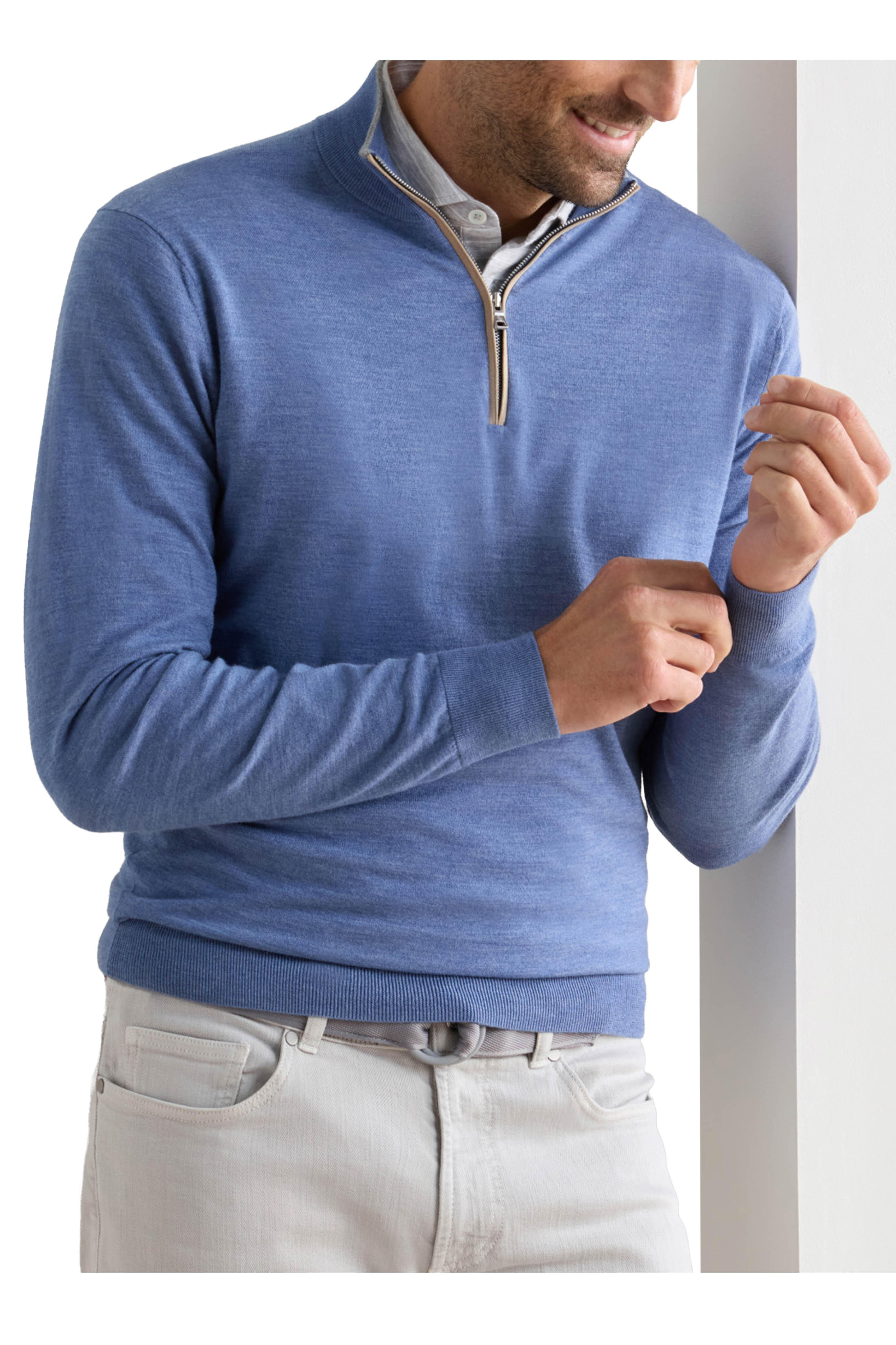 Stand collar. Quarter zip placket. Pullover style. Ribbed knit trim. Imported. Tailored fit. 93% merino wool, 7% polyester. Dry clean.