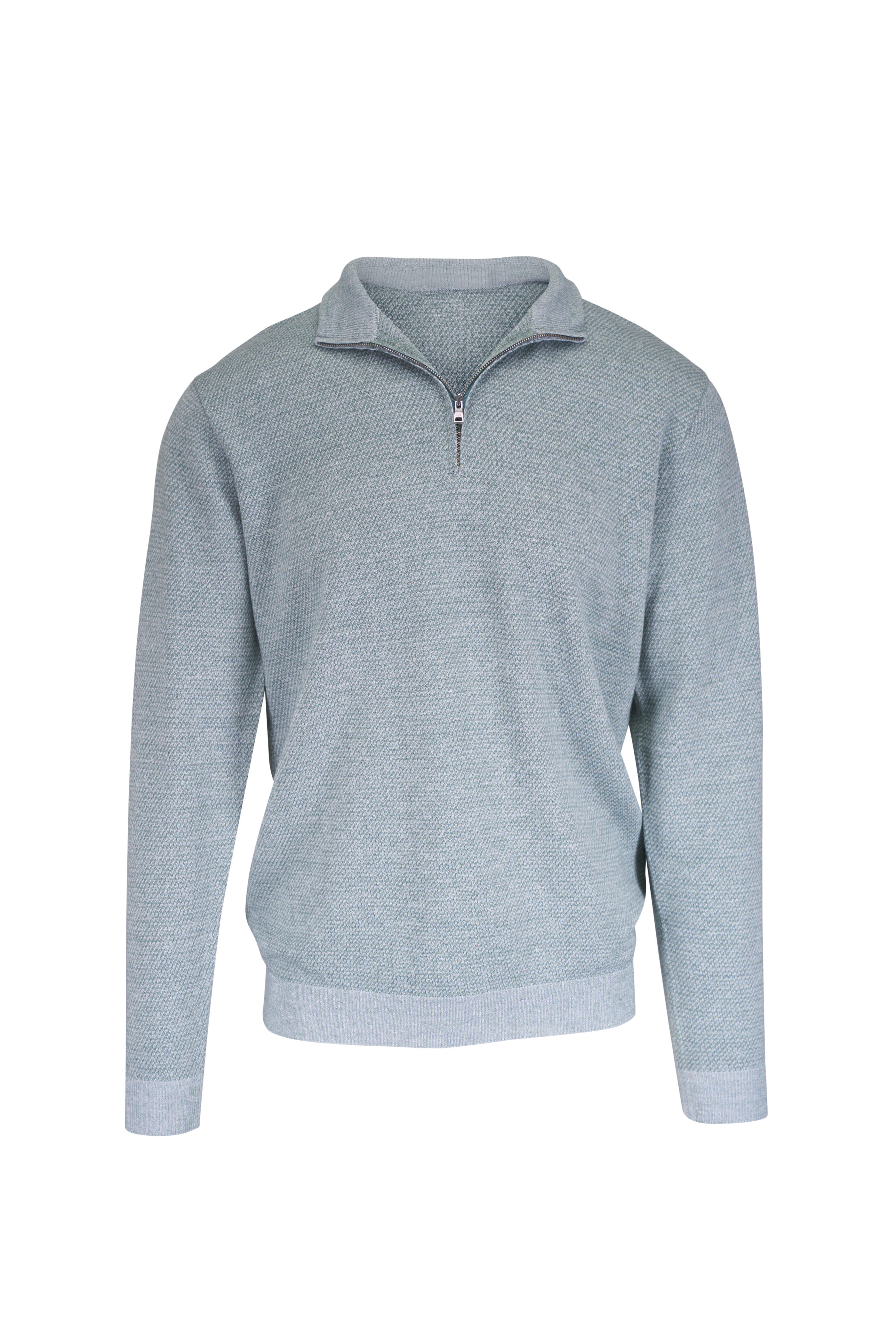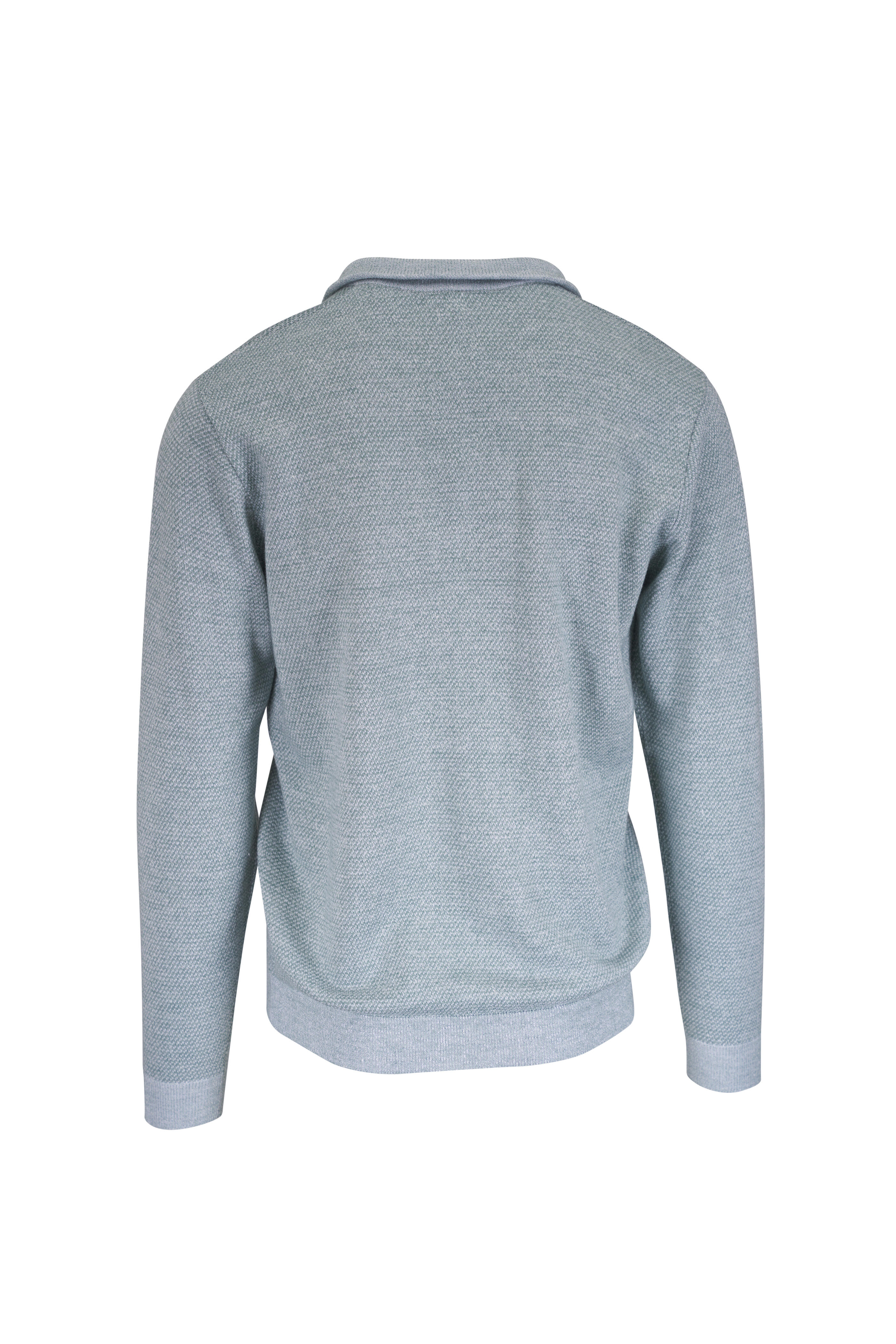 Concealed quarter zip placket. Ribbed trims. Straight hem. Made in the United Kingdom. 55% merino wool, 32% linen, 13% cotton. Dry clean.