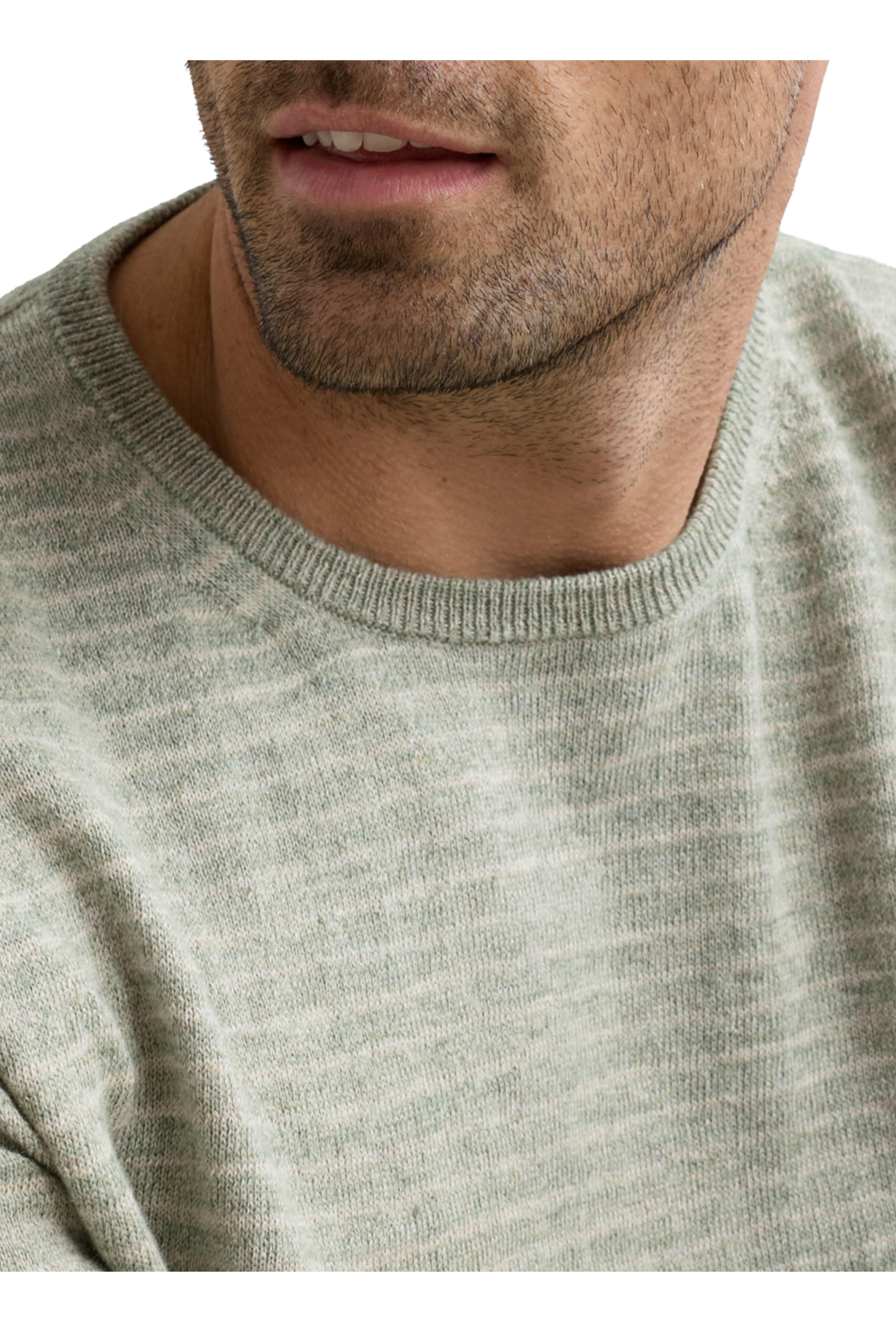 Crew neckline. Ribbed trims. Made in the United Kingdom. 50% linen, 27% alpaca, 18% cotton, 5% merino wool. Machine wash.