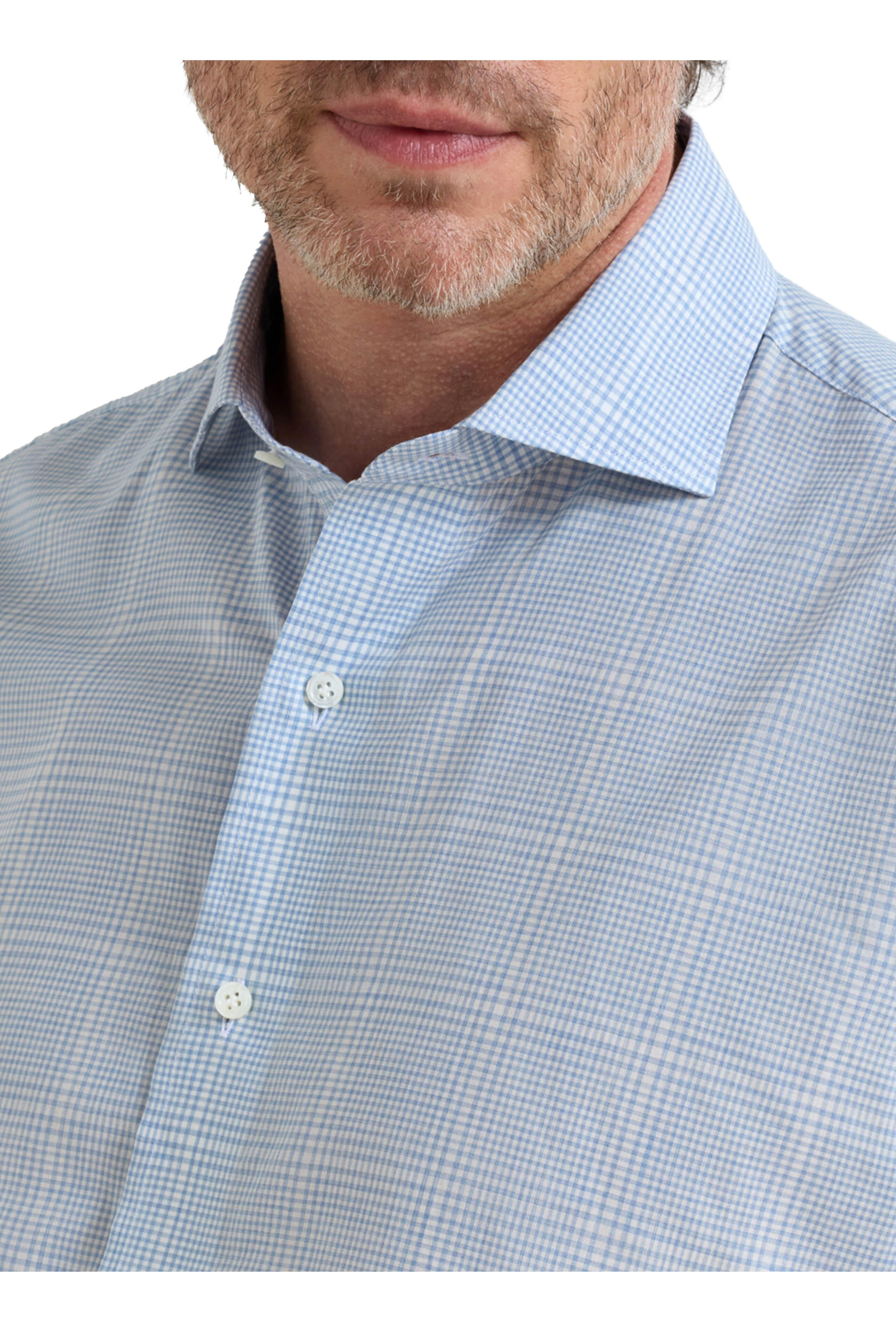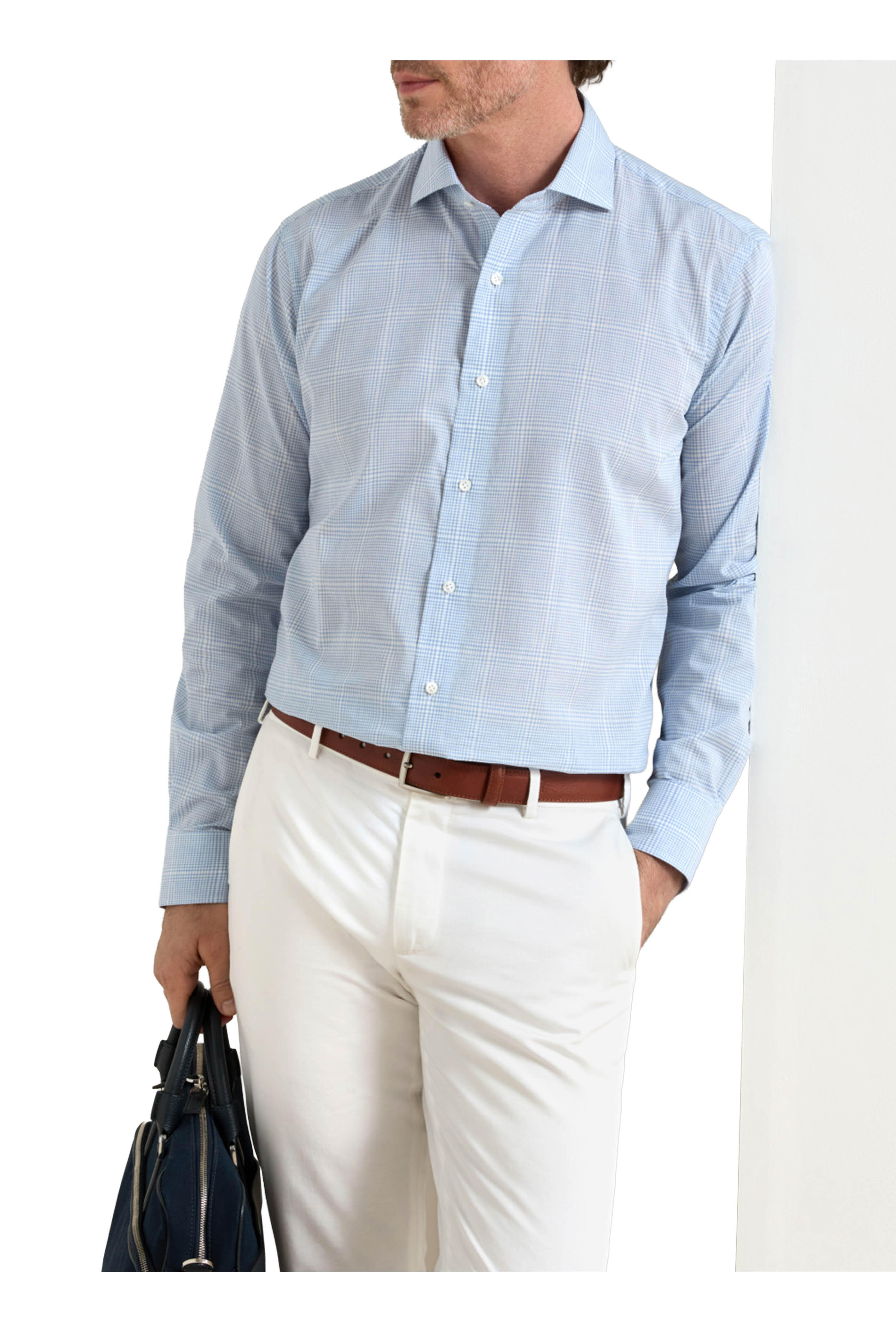 Spread collar. French front button placket. Single button adjustable mitered cuffs. Fabric from Italy. Tailored fit. 100% cotton. Machine wash.