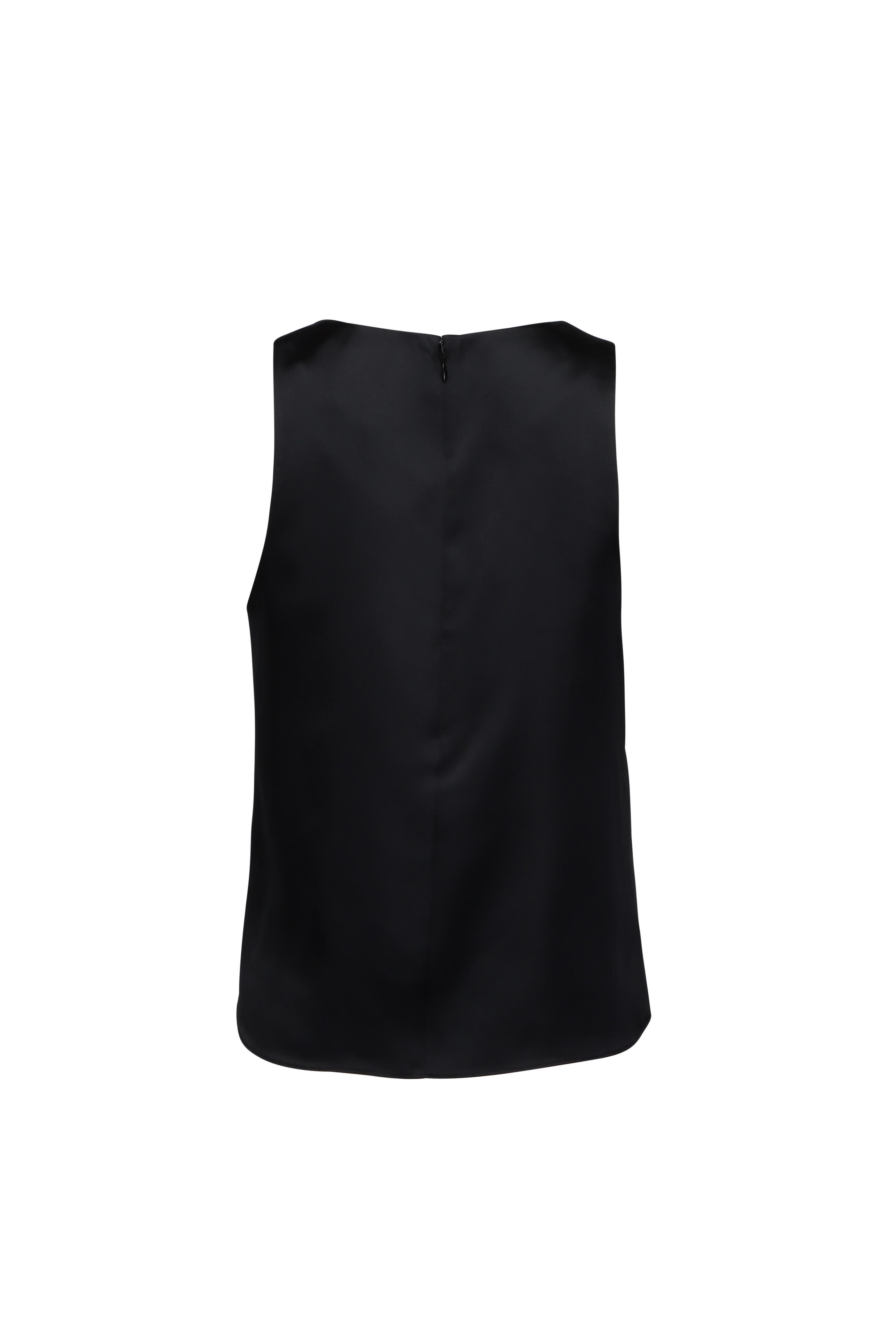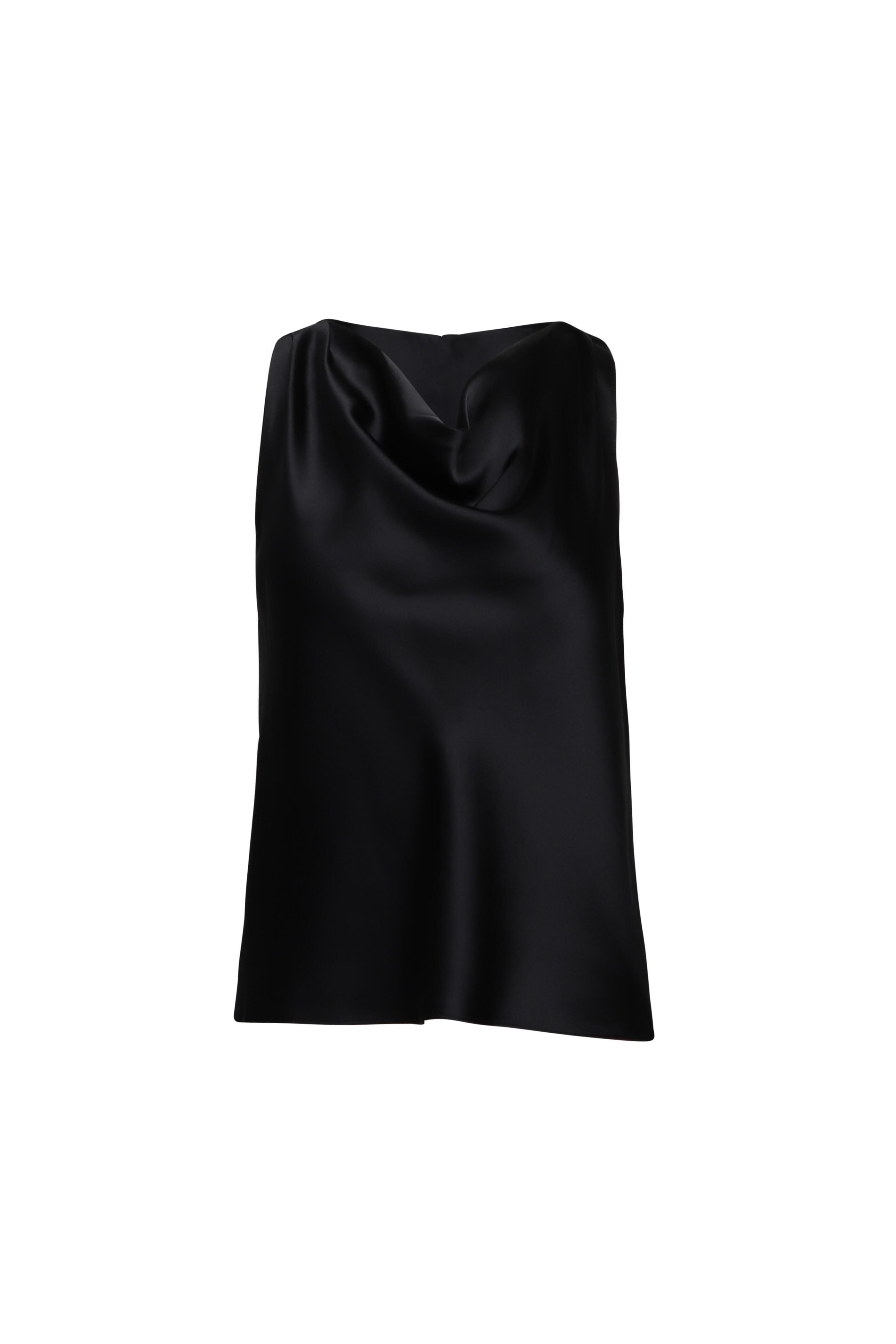 Cowl neck. Sleeveless. Concealed back zip closure. Bias cut. Relaxed fit. Straight hem. Imported. Bust 34.5” (US 4). Waist 27.5” (US 4). Hip 37.5” (US 4). 98% polyester, 2% elastane outer, 100% polyester lining. Dry clean.
