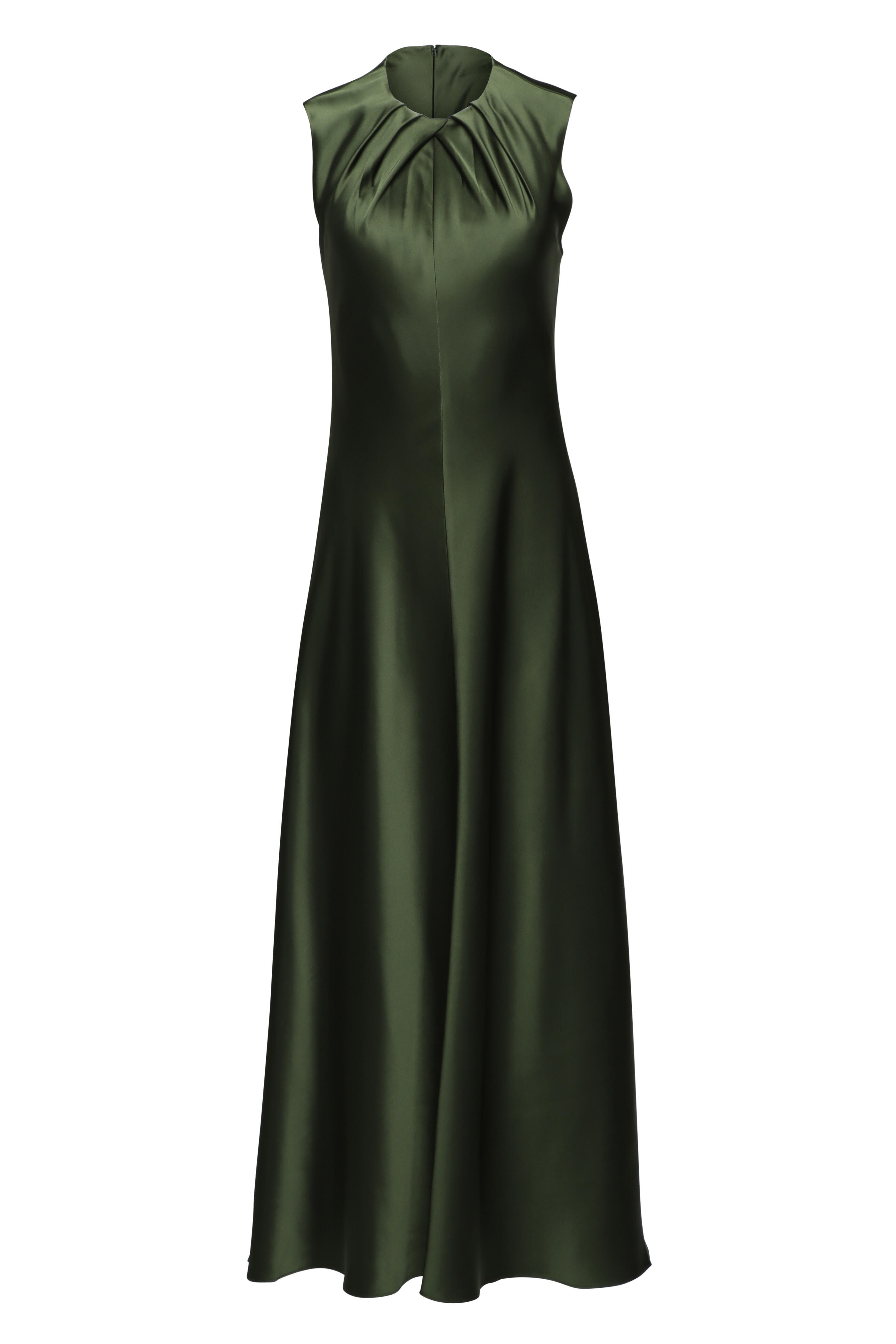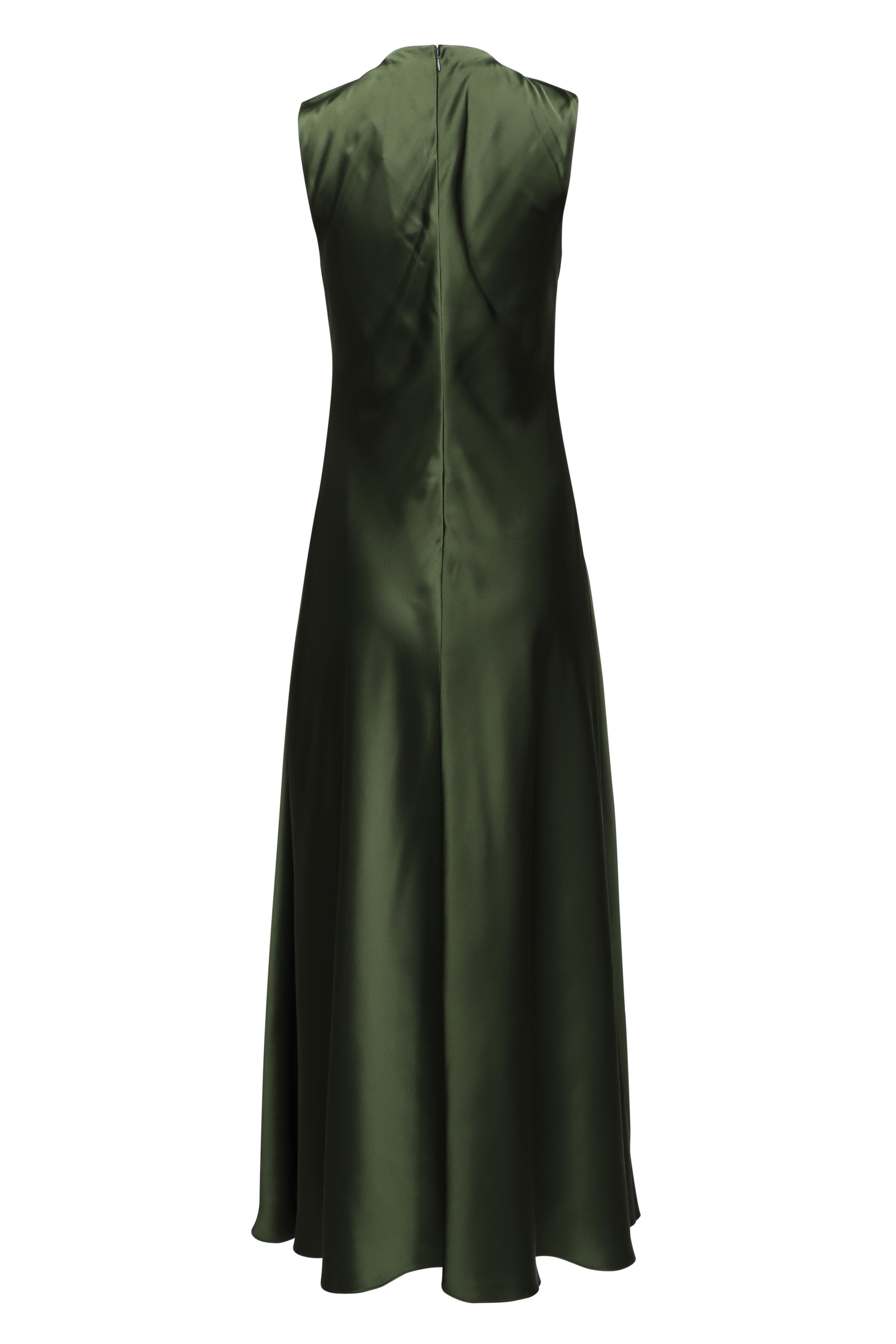 Round neck. Sleeveless. Concealed back zip closure. Slim through waist. Aline skirt. Imported. Bust 34.5” (US 4). Waist 27.5” (US 4). Hip 37.5” (US 4). Maxi length. 98% polyester, 2% elastane outer, 100% polyester lining. Dry clean.