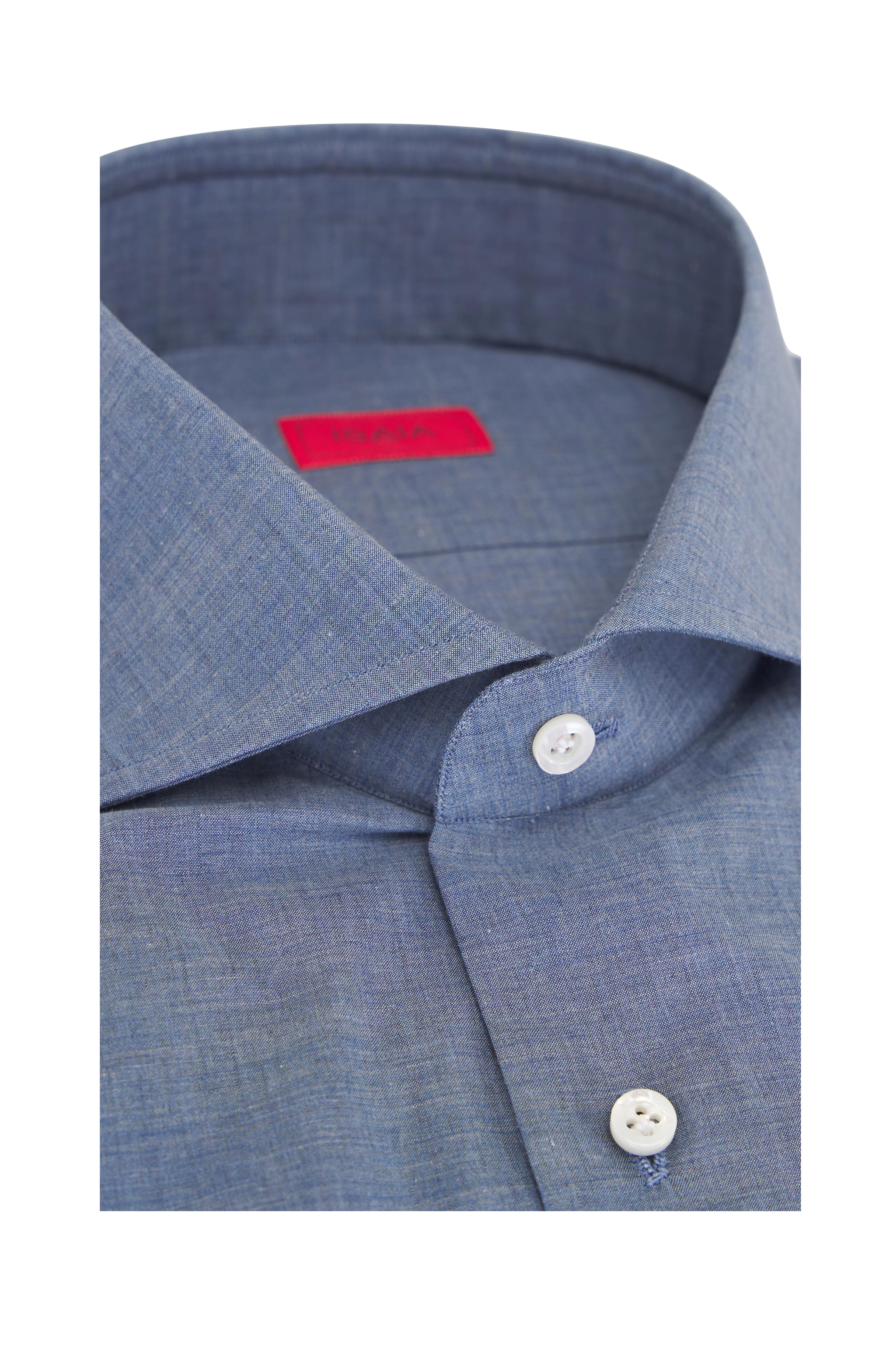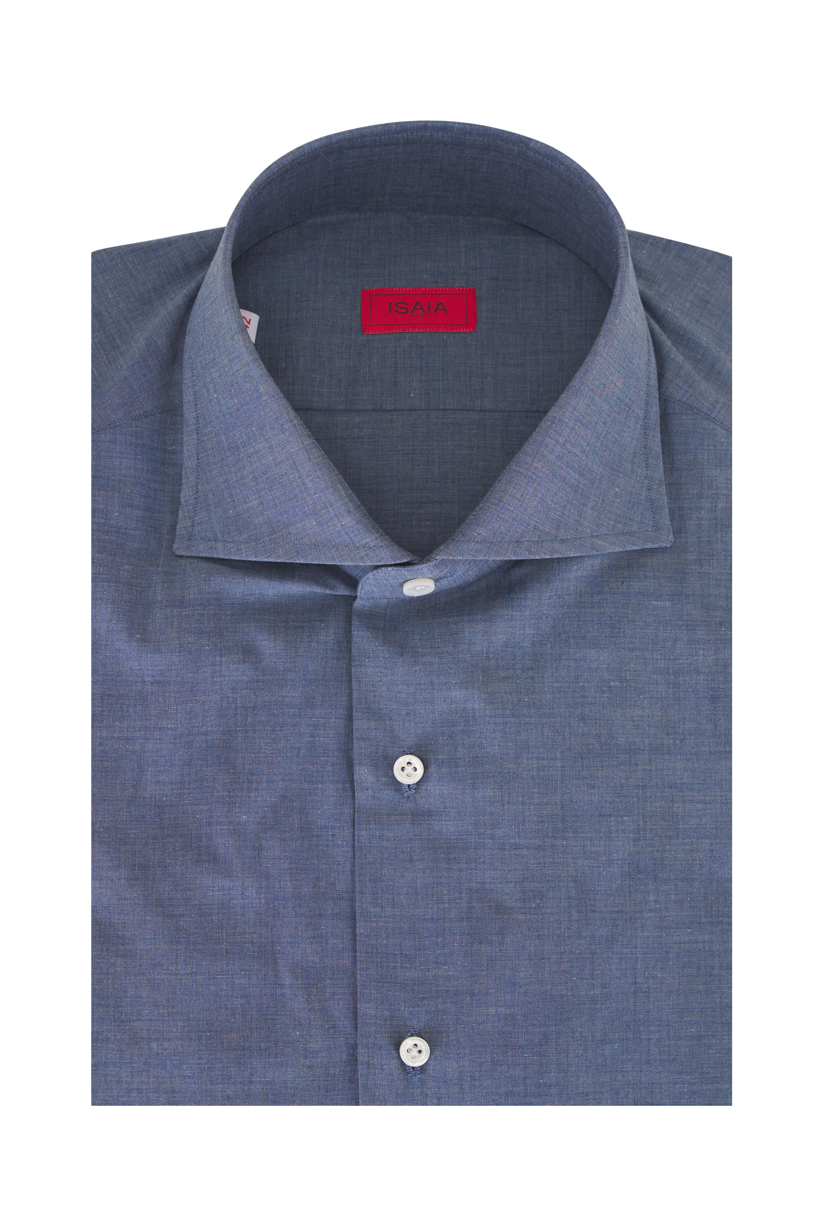 Spread collar. French front button placket. Single-button barrel cuffs. Made in Italy. 100% cotton. Machine wash.