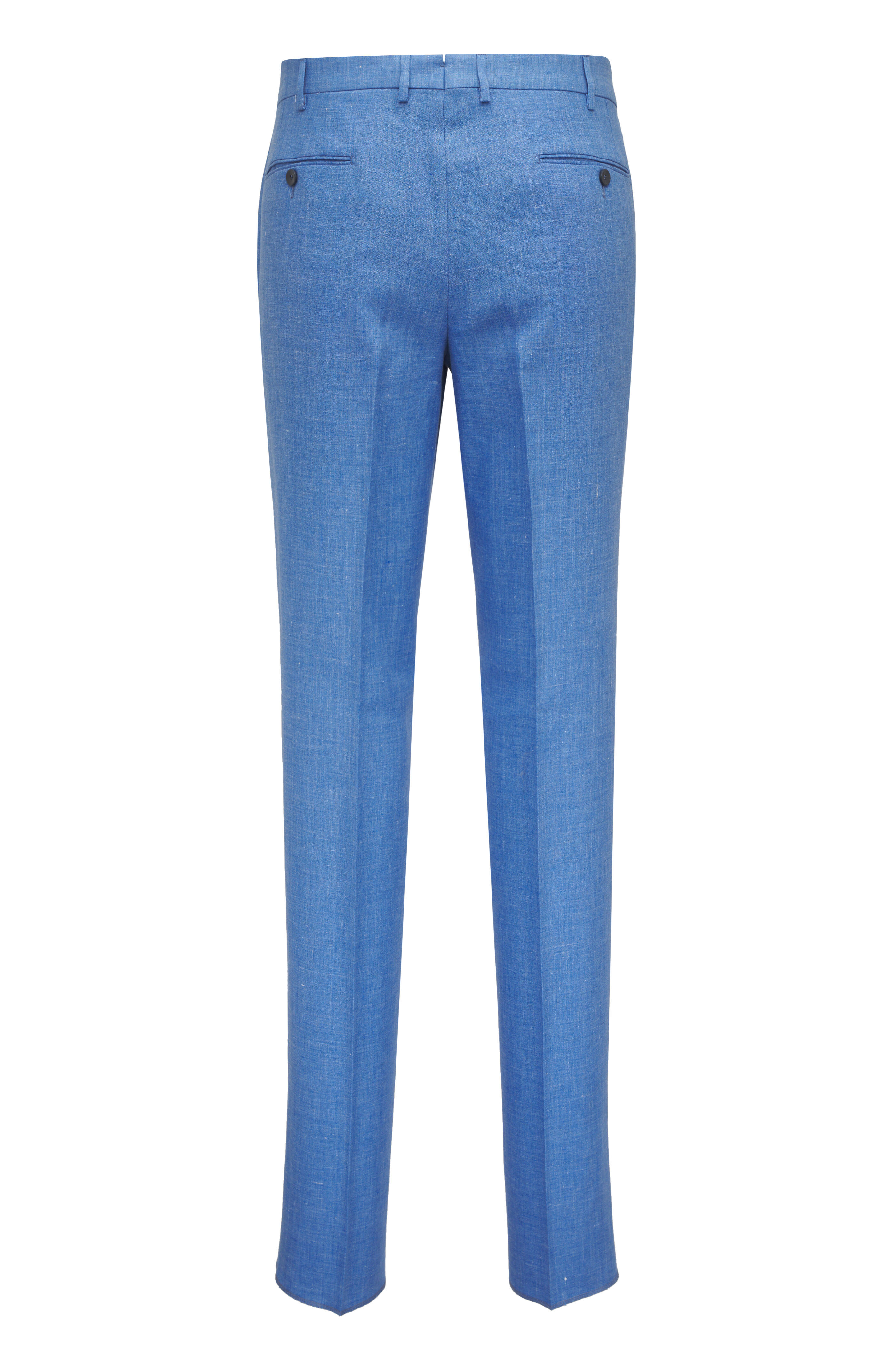 Banded waist; extended waist tab. Front slash pockets, back button-besom pockets. Unfinished hem. Mad in Italy. Regular fit. 100% Stretch linen. Dry clean.