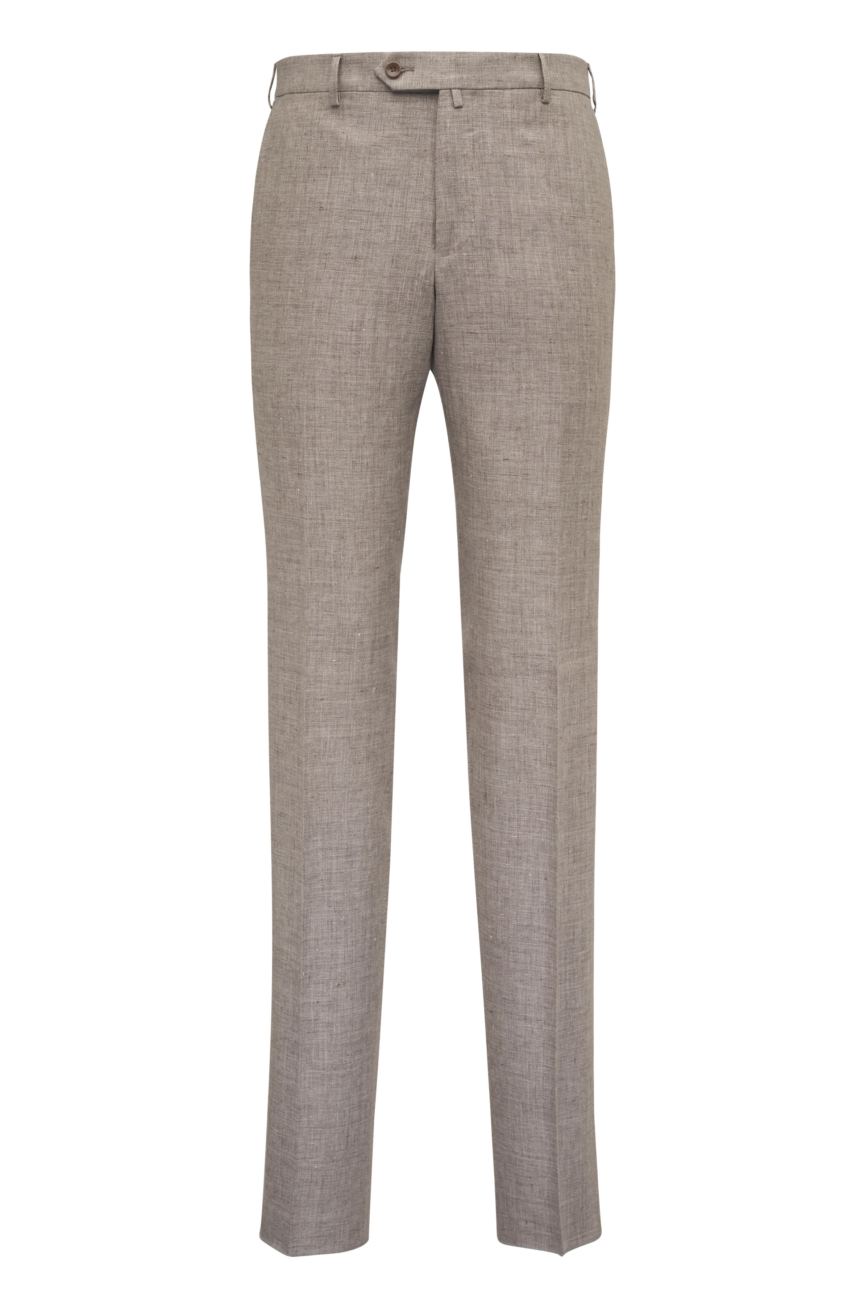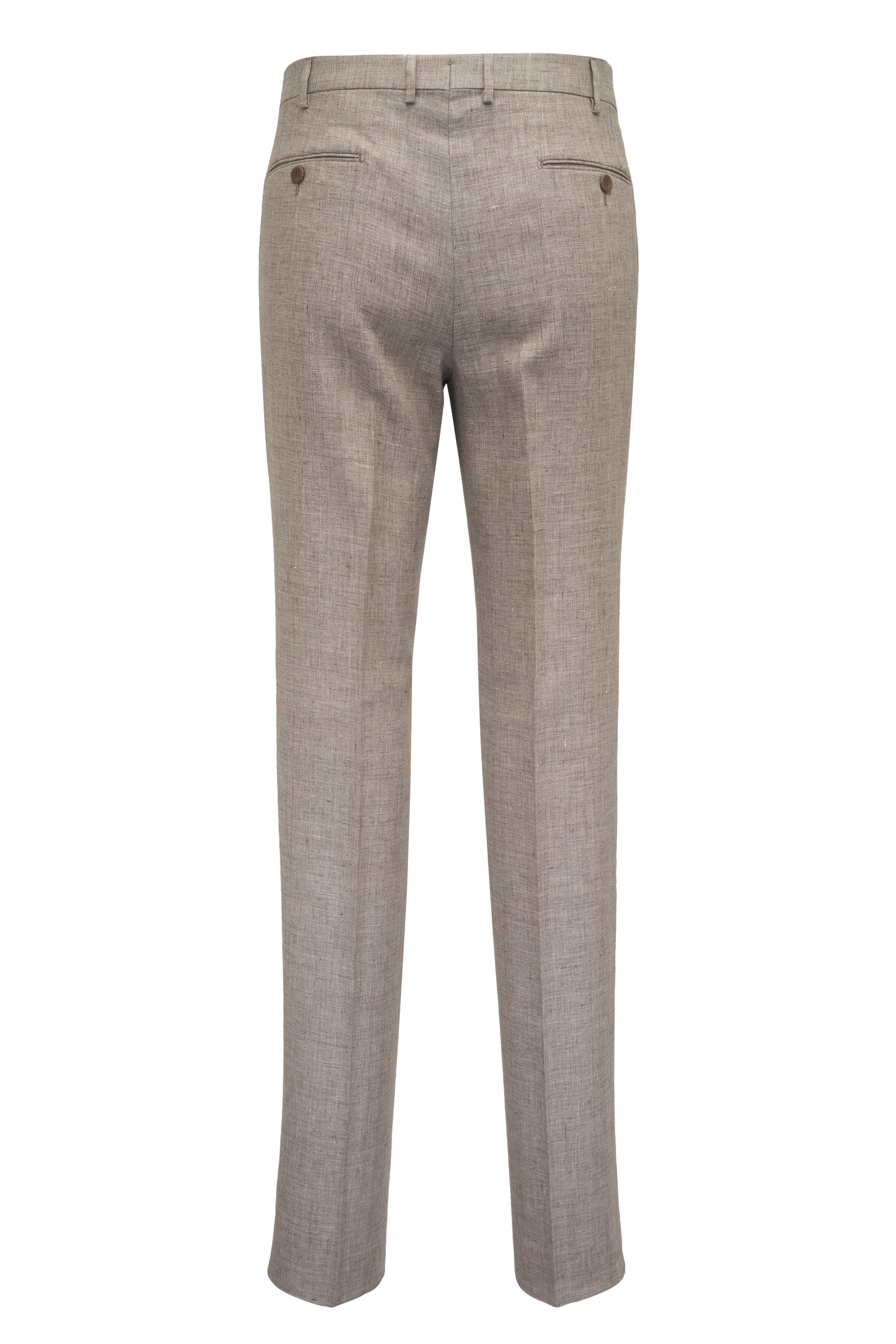 Banded waist; extended waist tab. Front slash pockets, back button-besom pockets. Unfinished hem. Mad in Italy. Regular fit. 100% stretch linen. Dry clean.