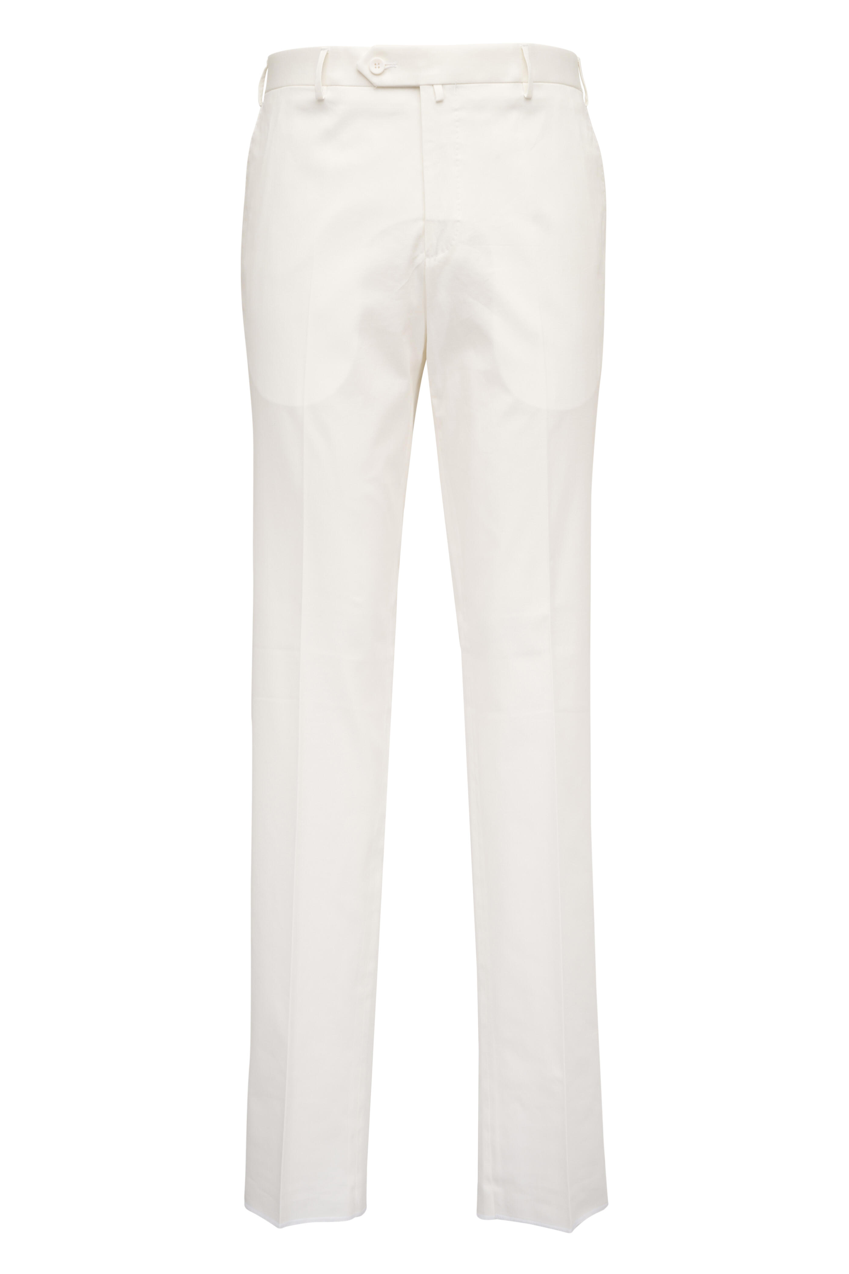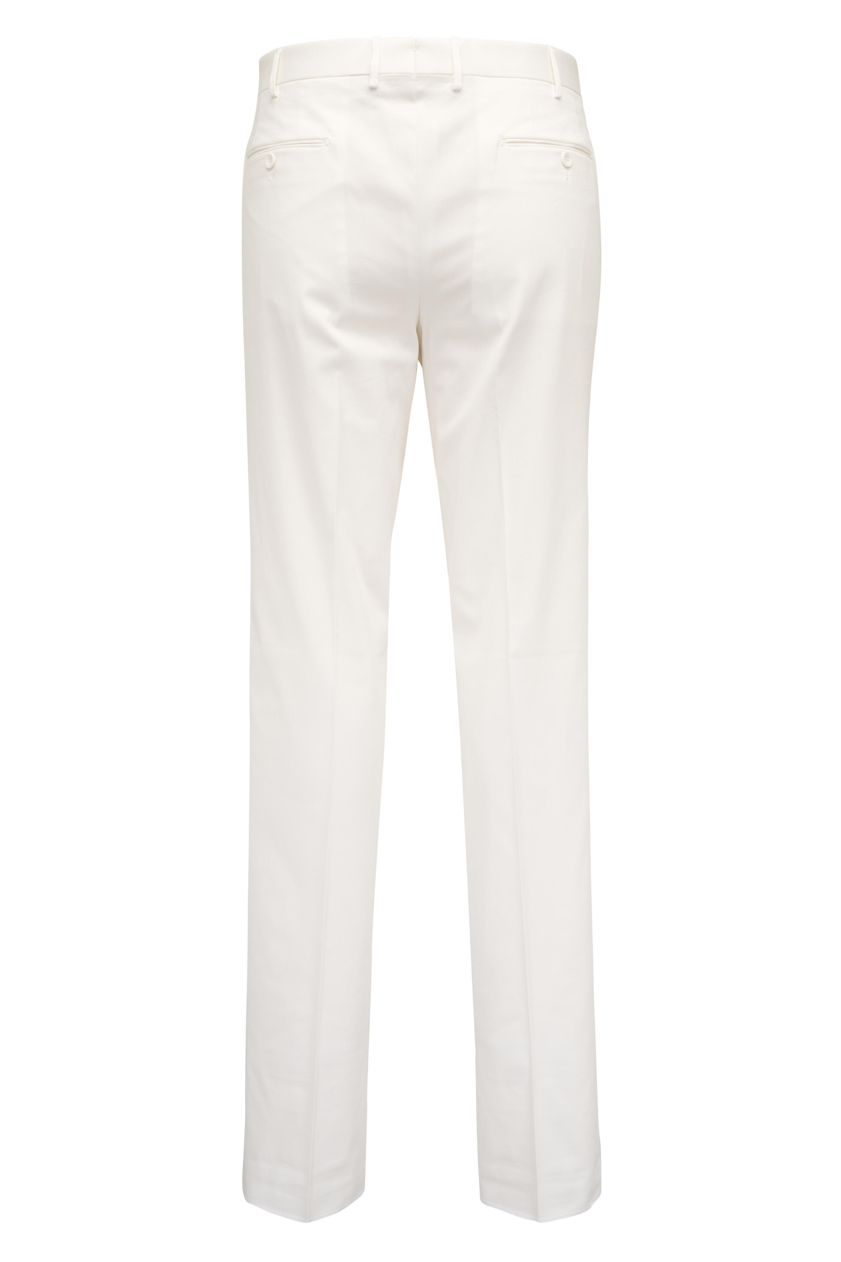 Banded waist; extended waist tab. Front slash pockets, back button-besom pockets. Unfinished hem. Imported. Regular fit. 85% Cotton, 11% silk, 4% elastane. Dry clean.