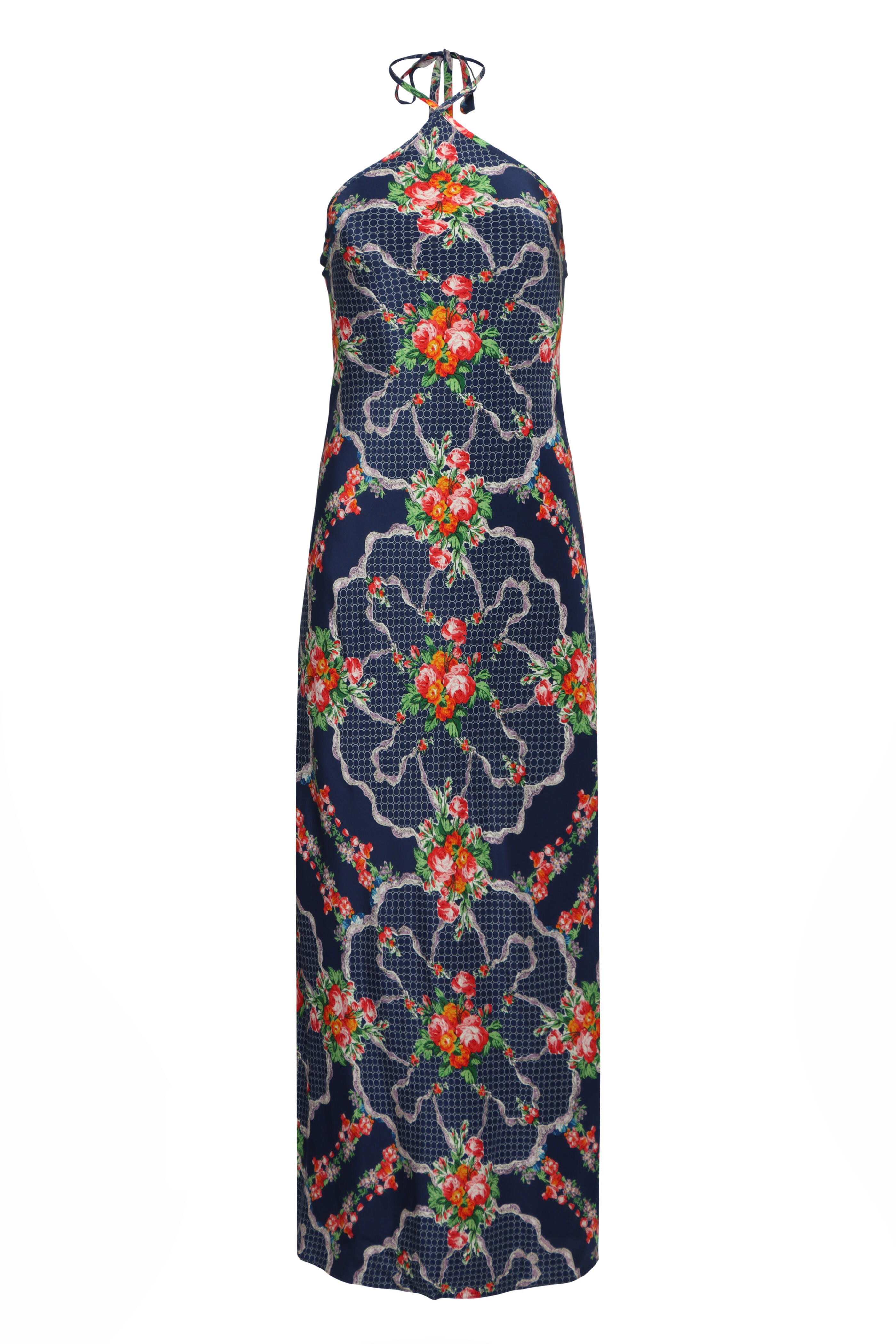 Self-tie halter neck. Sleeveless. Open upper back. Concealed back zip closure. Slim through waist. Aline skirt. Imported. Bust 35” (US 4). Waist 28” (US 4). Hip 38” (US 4). Maxi length. 100% silk outer, 100% polyester lining. Dry clean.