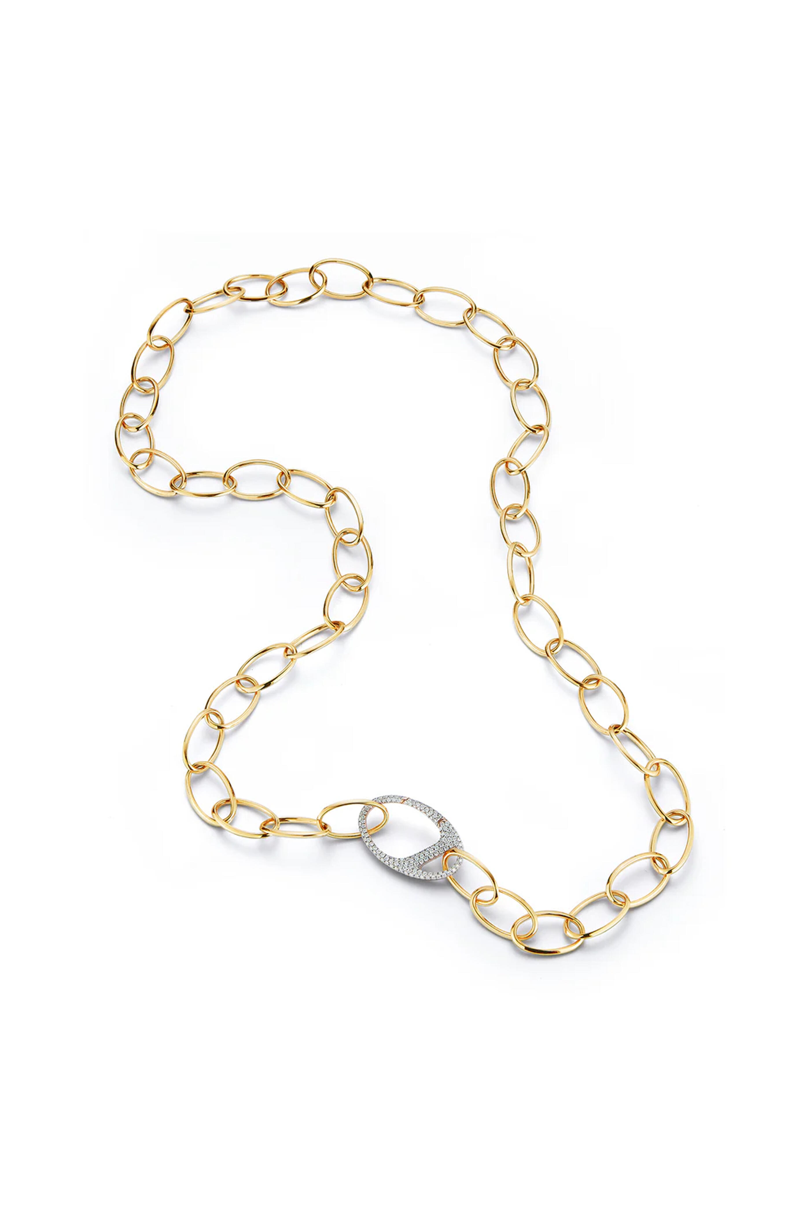 18k yellow gold. Diamond 2.05 total carat weight. Oval. Links. Diamond oval ink clasp. Made in New York. Length: 30”. Link measurements: 21mm.