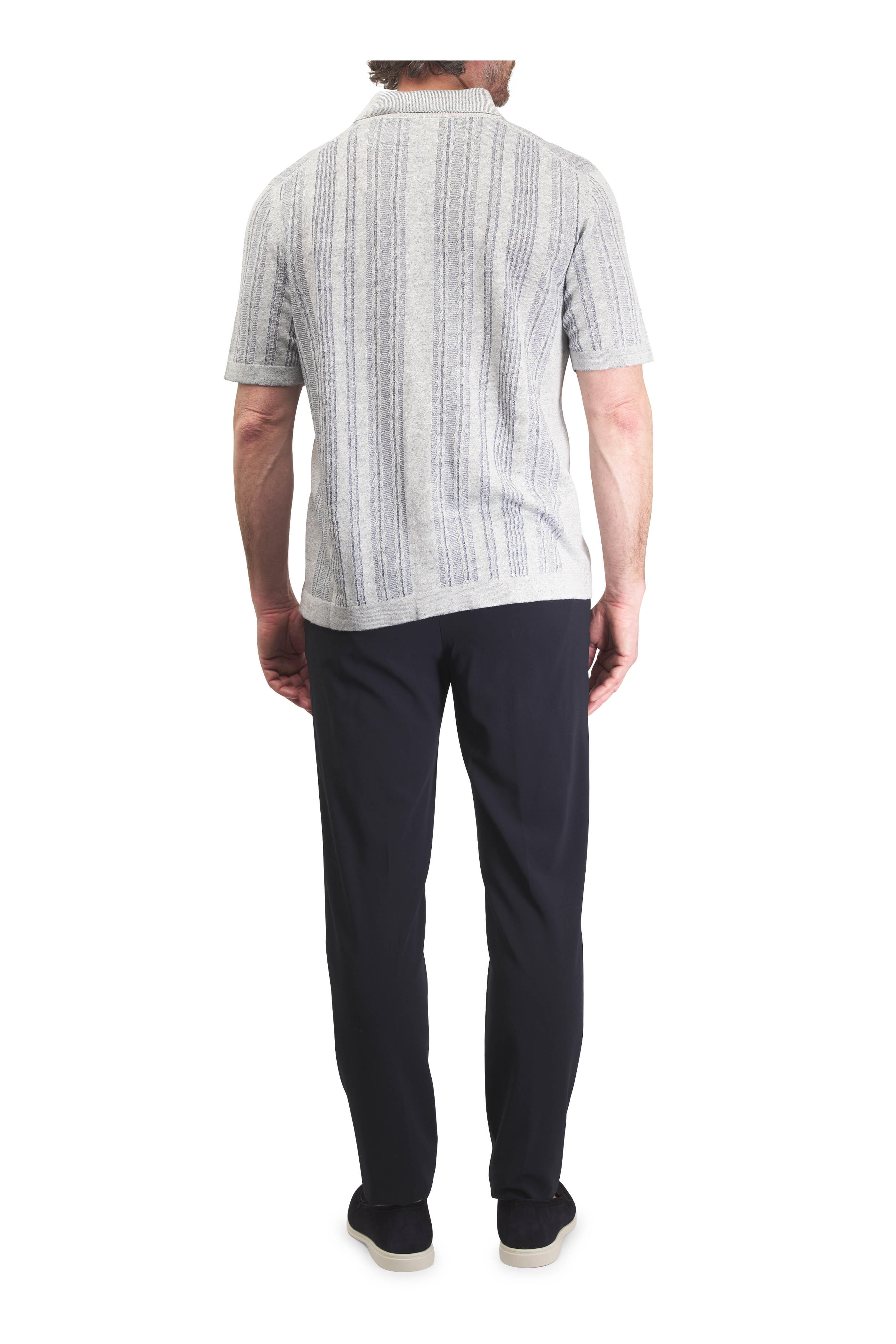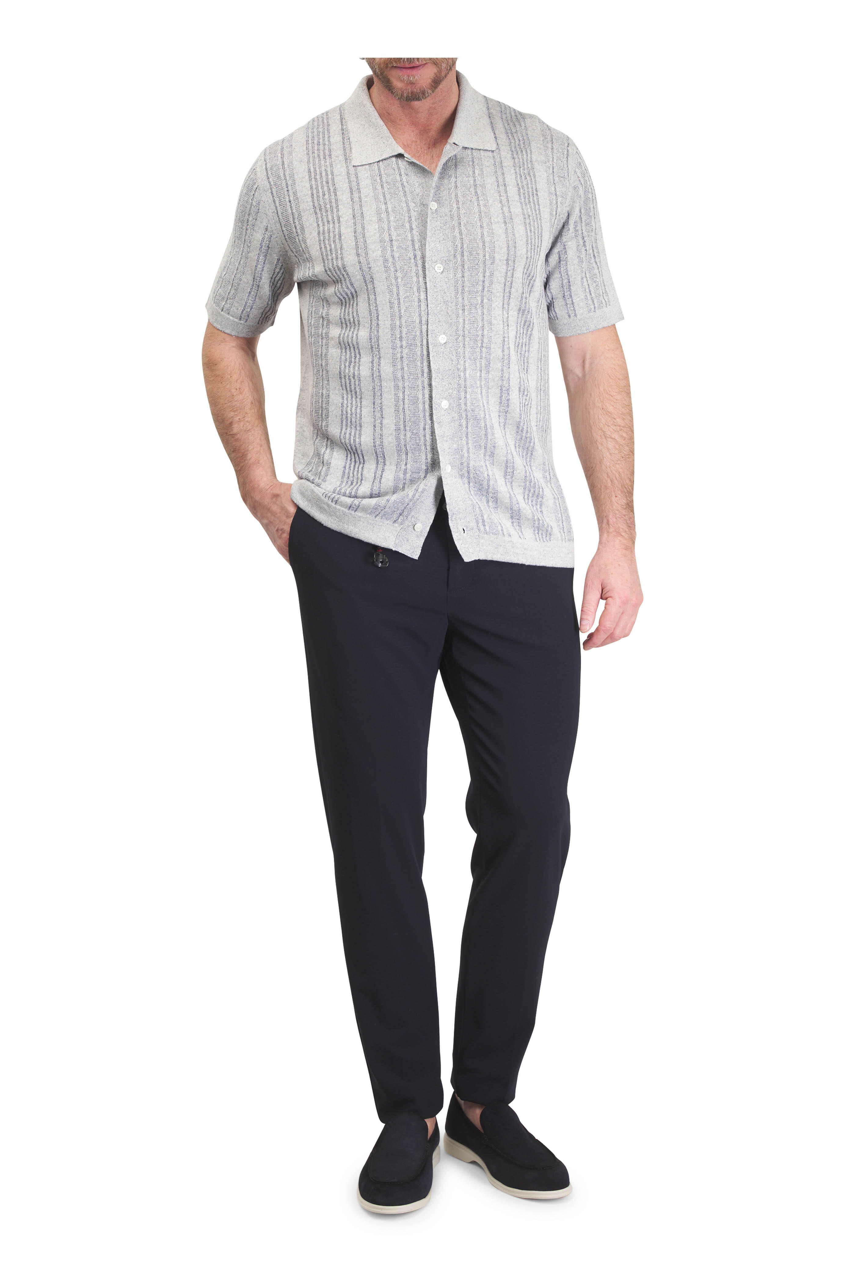 Zip fly; extended button tab. Elasticized waist; belt loops. Side slip pockets; back button besom pockets. Made in Italy. Inseam 33" (size 36). 96% virgin wool, 4% elastane. Dry clean.