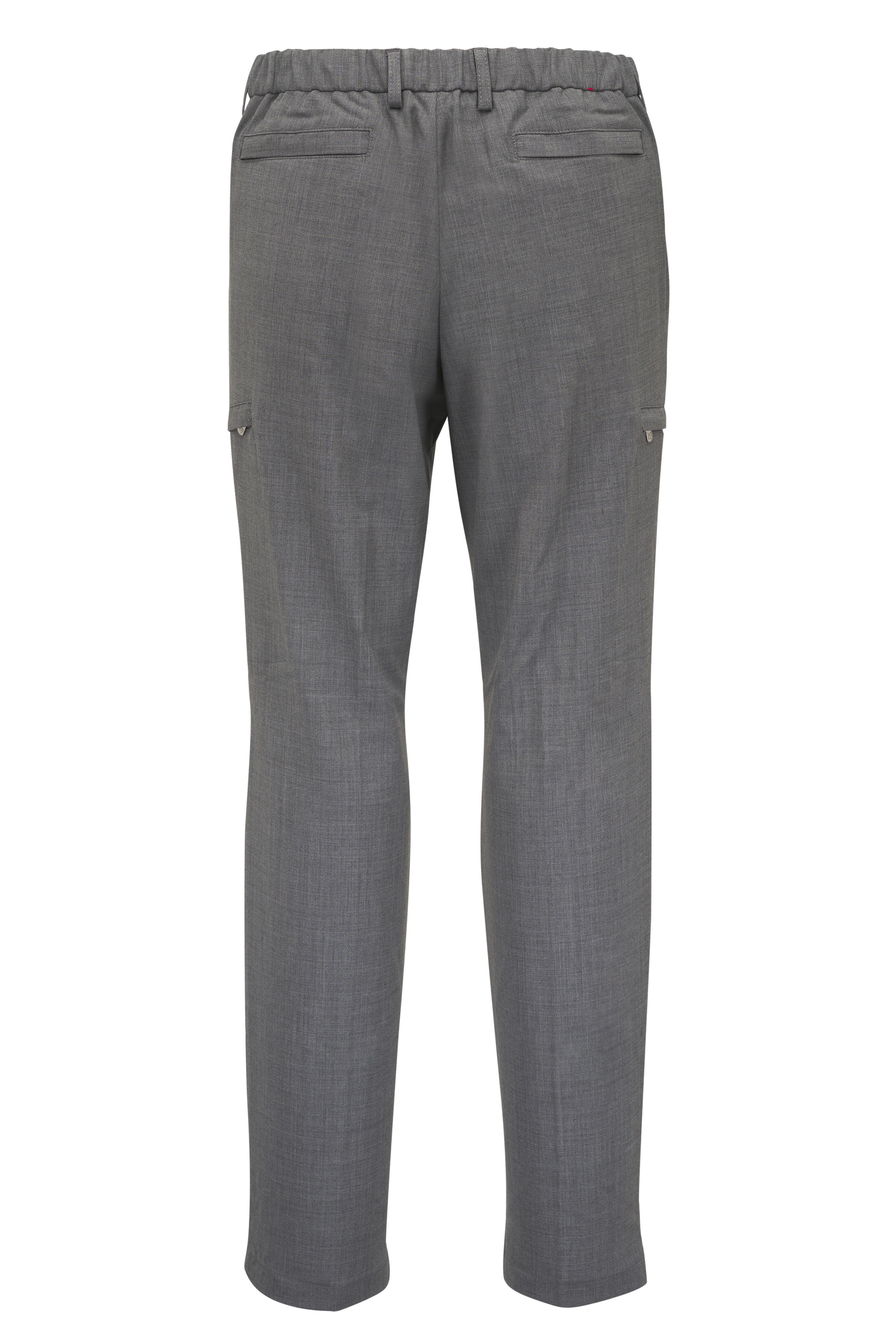 Zip fly; extended button tab. Elasticized waist; belt loops. Side slash pockets; back zip pockets; cargo zip pockets. Made in Italy. 98% virgin wool, 2% elastane. Dry clean.